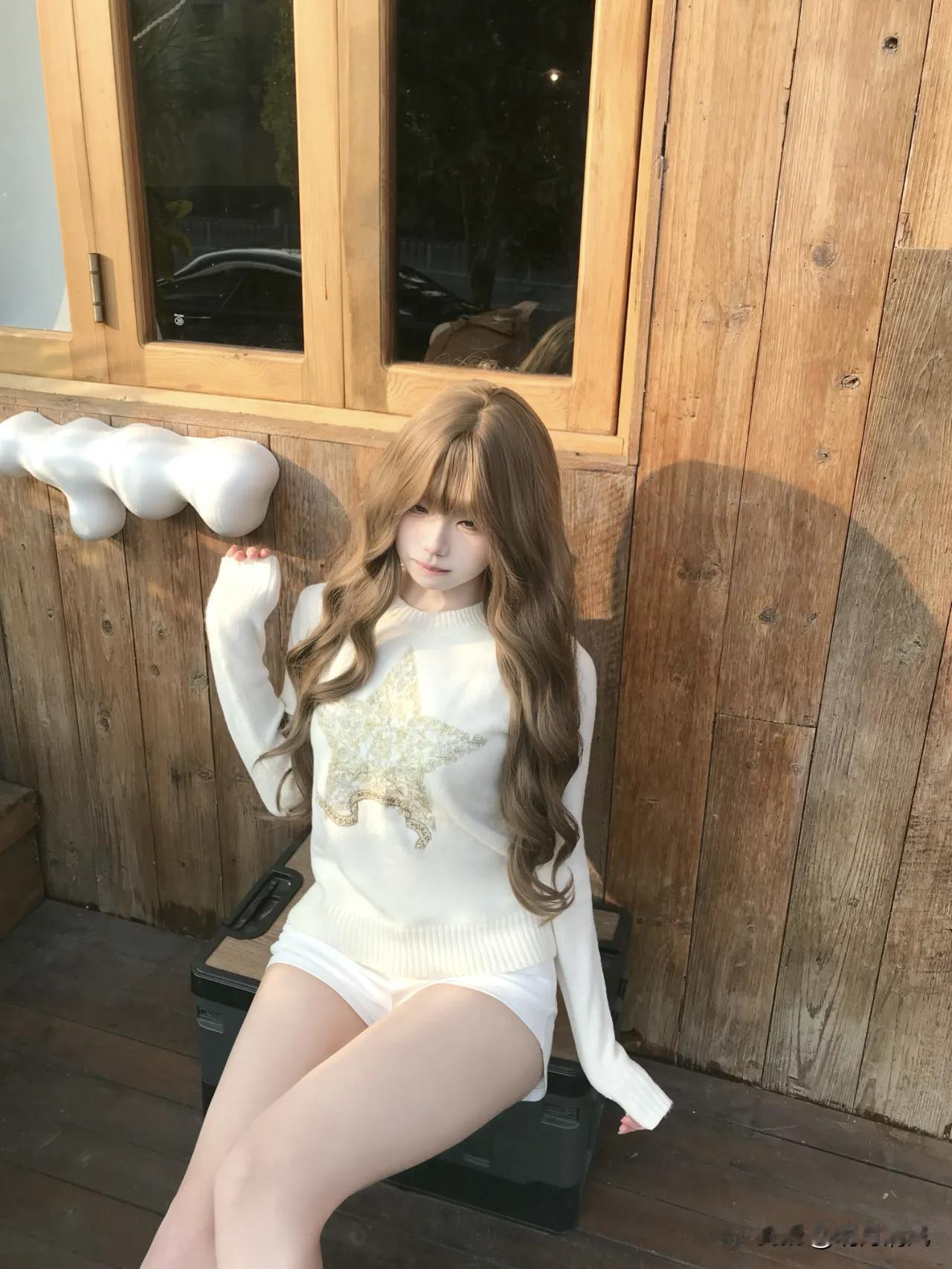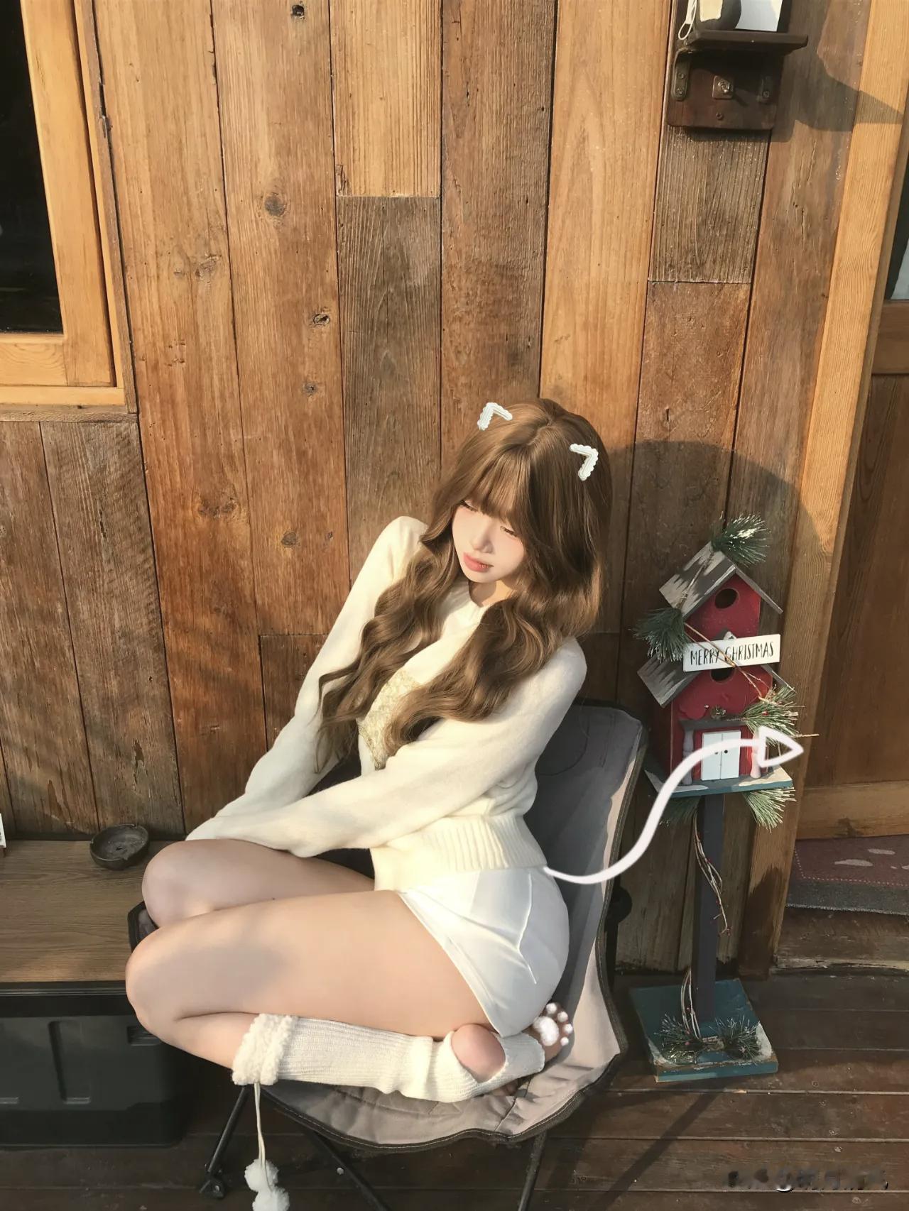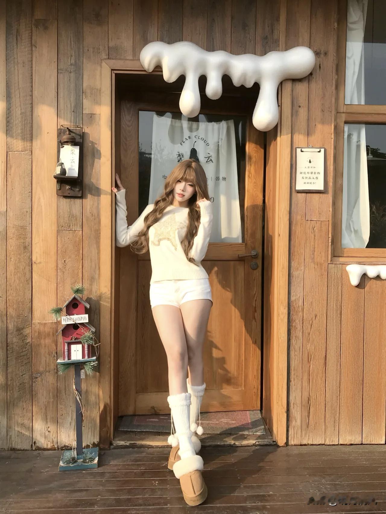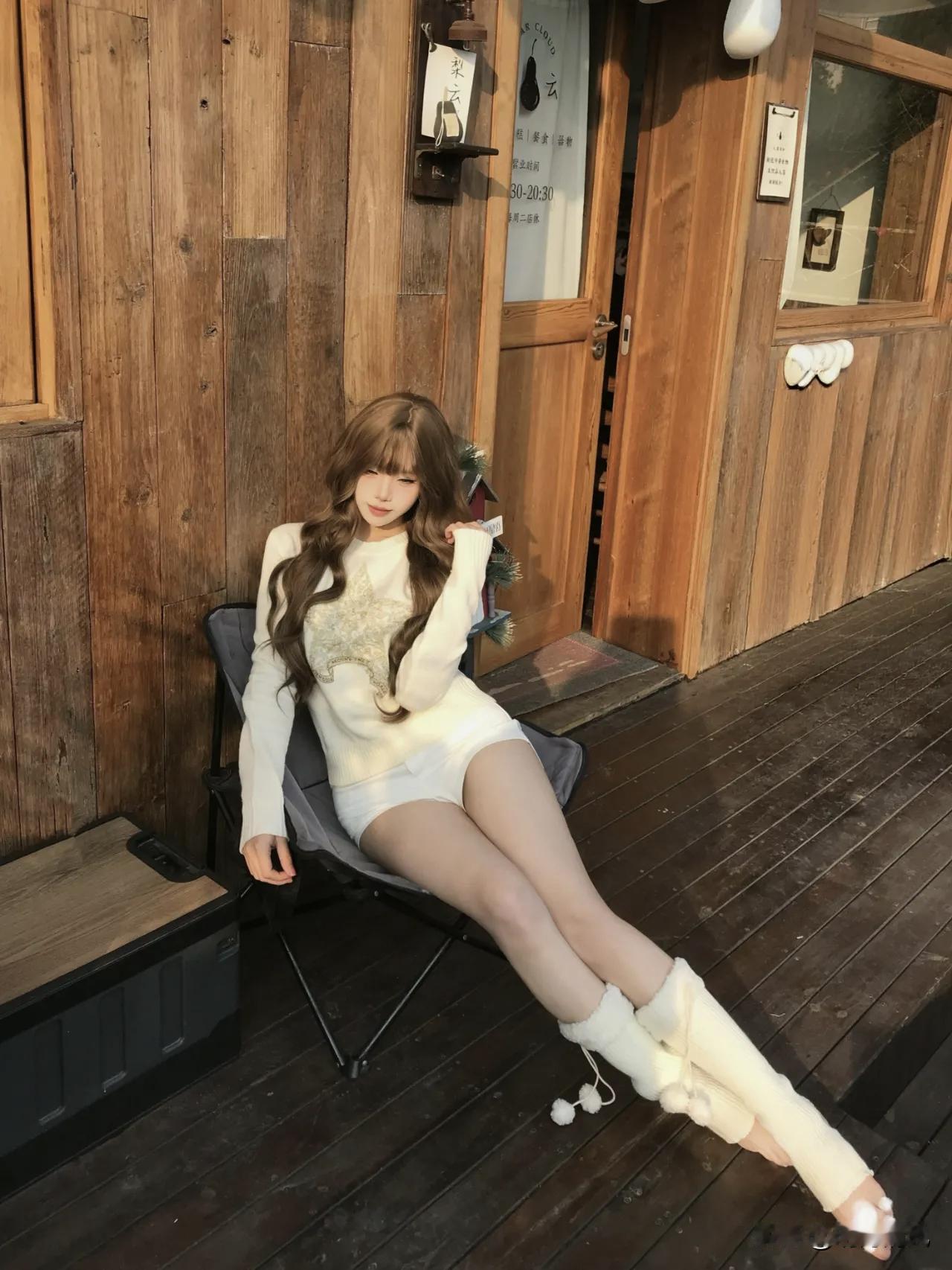 今天拍的第4张我最喜欢,就站门框中间那张。 当时也没想摆什么造型,就随手扶着门框,另一只手在拨刘海,整个人松松散散的。夕阳从左边斜过来,把木纹照得特别好看,影子拖了一地。毛衣是白色带星星的,配白短裤,脚上那双毛绒雪地鞋踩在垫子上,腿套堆在脚踝那,软乎乎的。 朋友说我当时表情特别自然,就轻轻笑了一下。其实是被夕阳晃得有点睁不开眼,但光线打在身上太舒服了,懒得动。门头上的白色“雪滴”装饰,两边木墙正好把我框在中间,像幅画似的。 这种时候不用硬凹造型,顺着光线来,人懒懒的,照片反而好看。 晒图笔记大赛 慵懒风穿搭