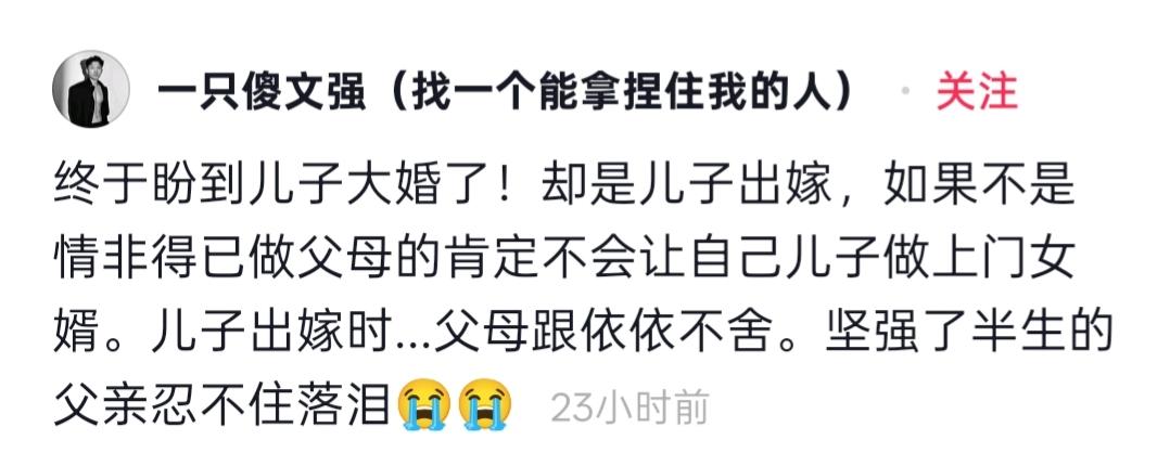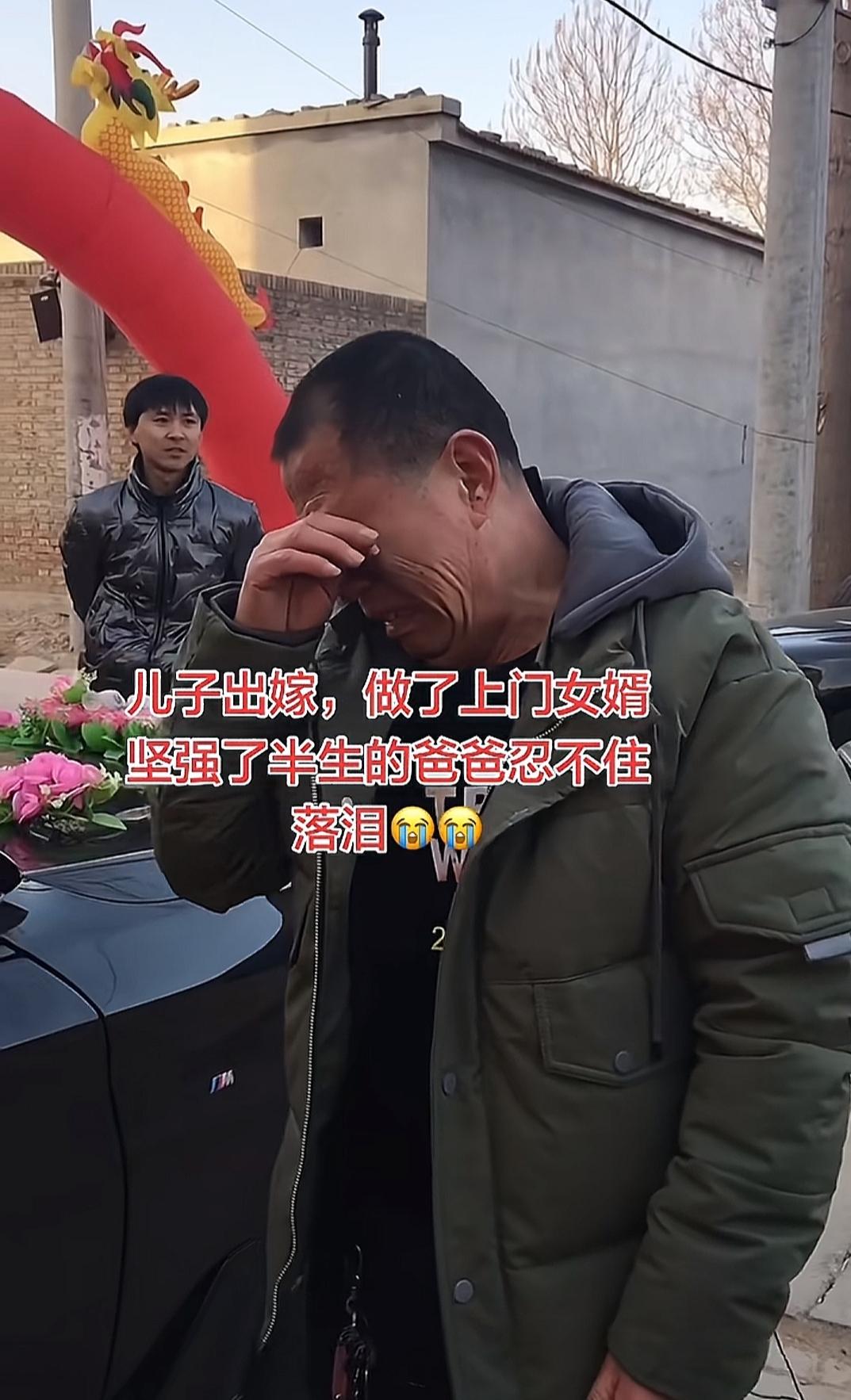 儿子做了上门女婿,父亲在儿子结婚当天大哭。我快40岁了,在我周围没看到过有男人“出嫁”的。 男人出嫁也跟女人出嫁一样的仪式吗?女人穿着婚纱,带着车队把男人接到女方家去?这样的场景,总觉得女人好霸气,男人心里确实会不好受吧。 现在这个年代,男人出嫁,多少会让人受不了吧。其实不用搞这种结婚仪式,搞了反而男方心里难受。不过,女方这边,心里应该乐开了花吧。
