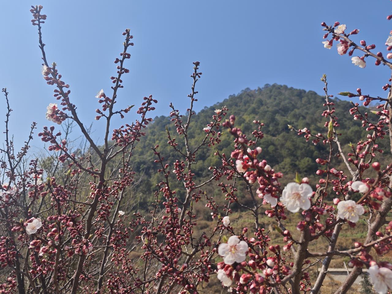 家里的杏子树开花了,粉色的花儿,过段时间,附近山上的各种野花都会开放,把山都染成