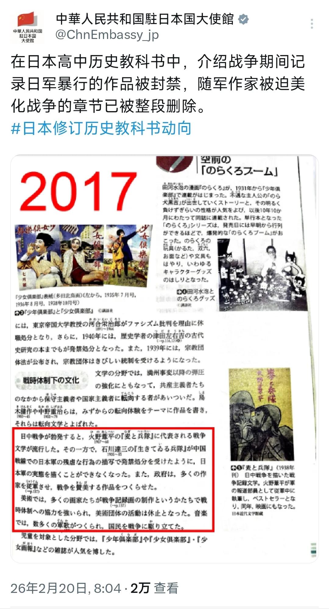 日本教科书里的“隐身术”:一场持续了80年的“剪辑游戏” 2月20日,日本文部科学大臣松本洋平在内阁会议后挺直腰板,为教科书审定制度辩护,声称这是“根据客观学术成果”实施的。这话听着耳熟——就像一位剪辑师坚持说自己的剪辑版就是“完整版”。 松本洋平的话术堪称精妙:“如何表述交由出版社自行判断”——多么民主开放!可问题是,当所有出版社都在同一套审定标准下“自行判断”时,这“自行”二字的含金量,恐怕比便利店的三明治还薄。 翻开日本的历史教科书,一场持续80年的“隐身术”正在上演。“侵略”变“进入”,“南京大屠杀”成“误杀”,其“731”部队在华化学细菌试验、大肆烧杀抢掠等却一字不提,仿佛二战时期的亚洲是一幅被水彩晕染过的风景画,模糊而“文艺”。可历史不是水彩画,那三十万亡灵的记忆,比任何教科书都更真实。 更有趣的是,日本教科书对“战后处理”的叙事逻辑:只字不提中国放弃了对日战争赔款,反而大写特写日本资金如何“帮助”中国大陆发展。这种逻辑,像是小偷入室行窃未果,反而坚持说自己是在帮主人“防贼”。 日本企业的“援助”?哪家不是赚得盆满钵满后才离开?商场里的松下、丰田、优衣库,哪个是做“慈善”来的?这种将经济互利扭曲为单向“施舍”的叙事,恰恰暴露了某种精神胜利法的需求。 松本洋平说要坚持“适当实施”的审定制度。可问题在于:如果一套制度本身的设计就让历史真相不得不“减肥”,那这套制度的“适当”,究竟是适当的什么? 历史教科书不是普通的读物,它是一个民族记忆的基因编辑工具。当一代代日本孩子在精心剪辑过的历史中长大,他们对邻国的“违和感”从何而来,答案不言自明。 或许有一天,日本会发现:真正的“大东亚共荣”,不是靠美化历史实现的,而是靠正视历史赢得的。