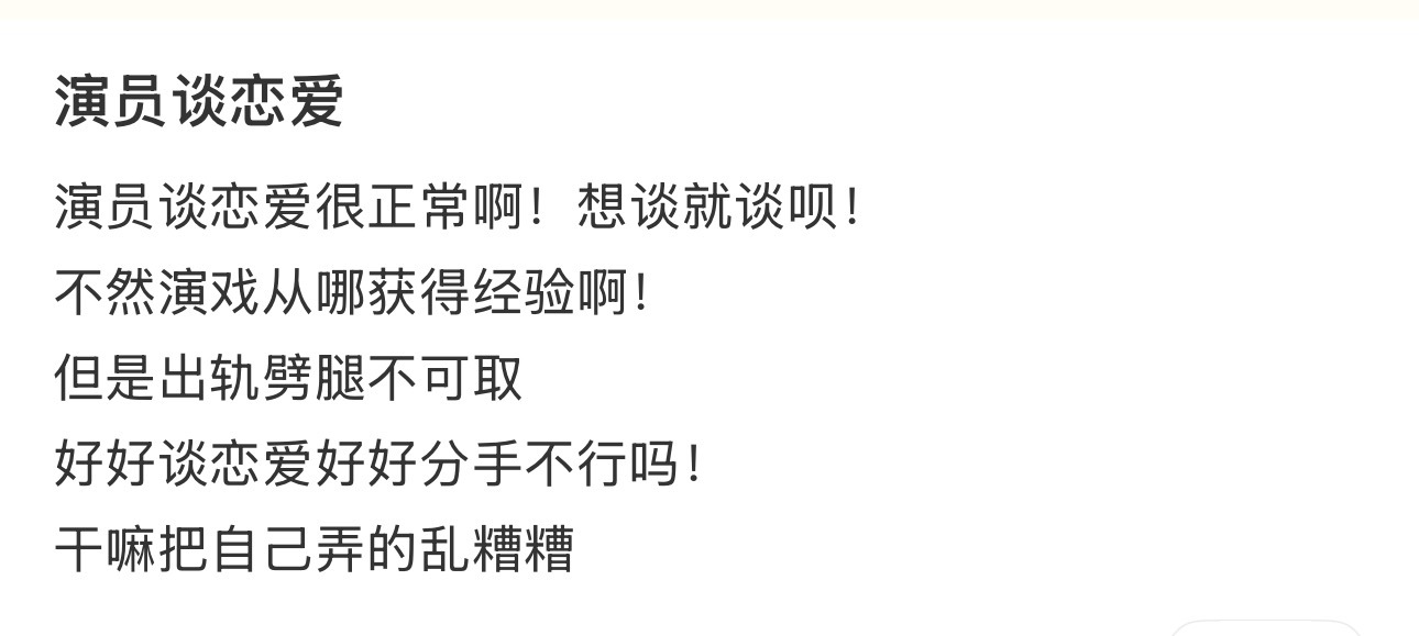 娱乐圈恋爱就是一个巨大的县城文学以前都在说演员可以谈恋爱甚至可以提高演技但是最近大家好像都觉得演员也不能恋爱?你觉得呢?