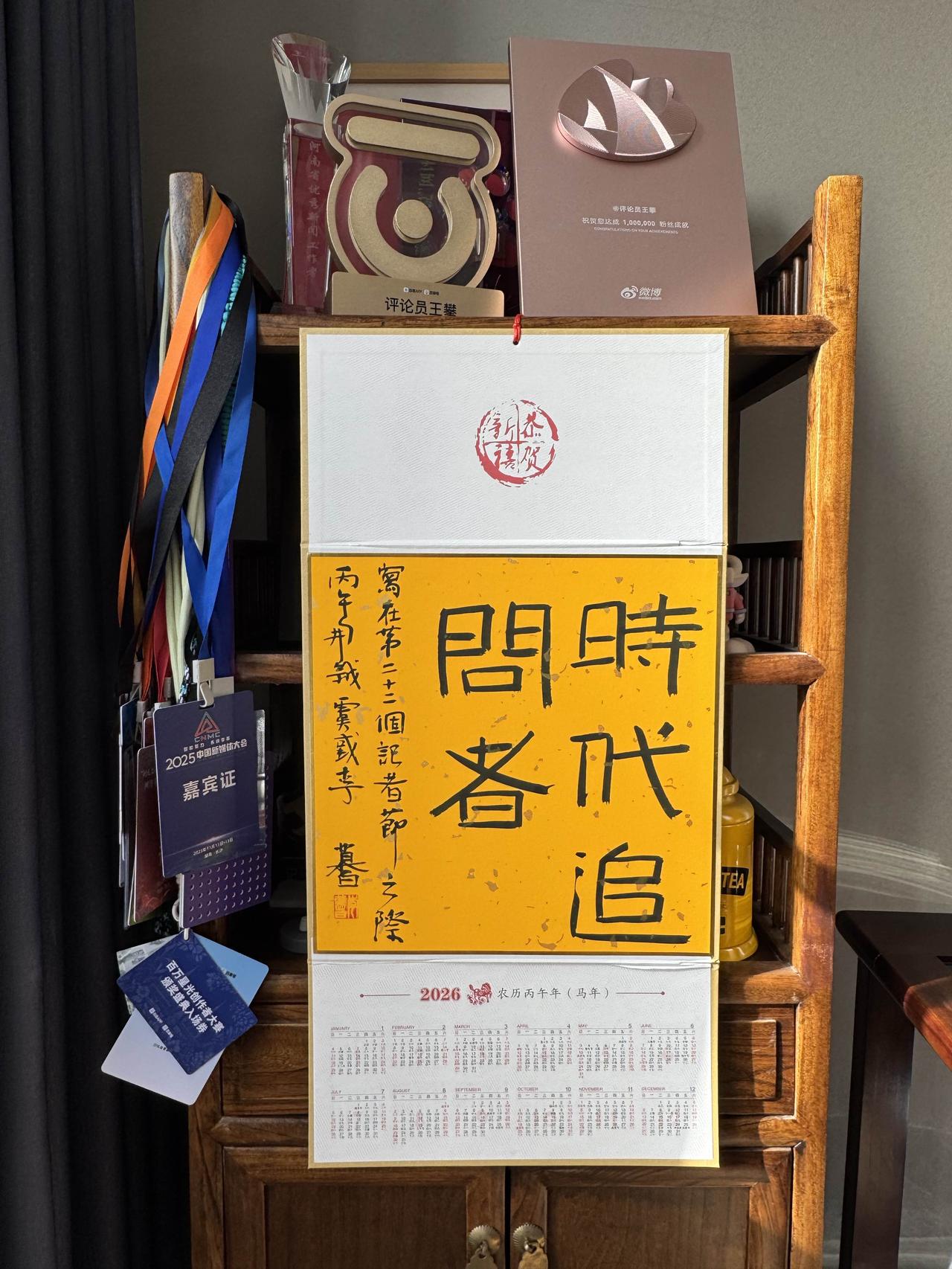 时代追问者 这是第22个记者节(2021年) 我给自己写的一个文章 领导觉得好 就做了编辑部文章 马年之际 老领导写了字送我 我挂在了我的办公室里 后面是攀谈天下的二字 前面是录节目时候的补光灯 还有一个后面是各种奖项 都是一路走来的痕迹 是纪念 也是激励!
