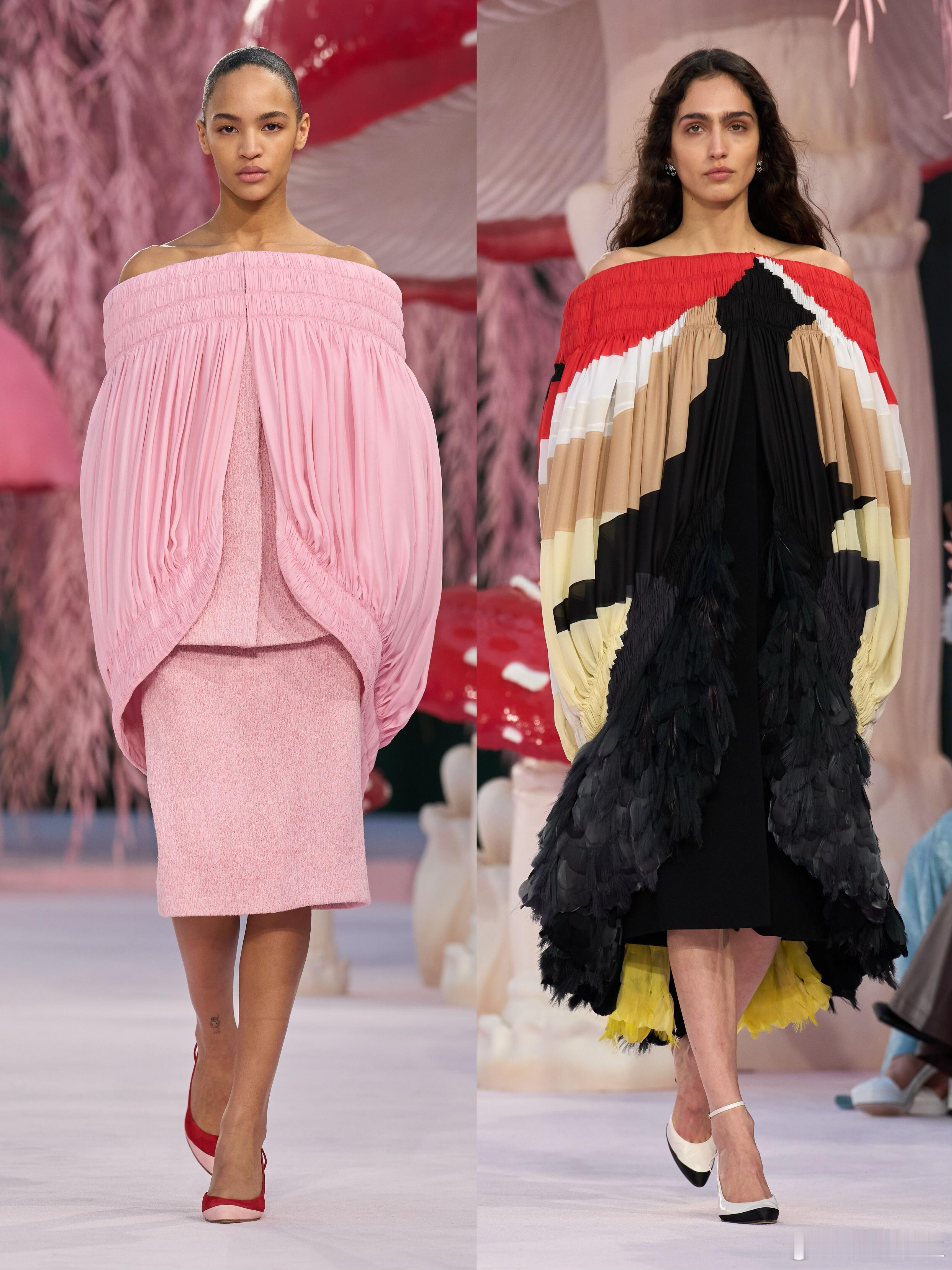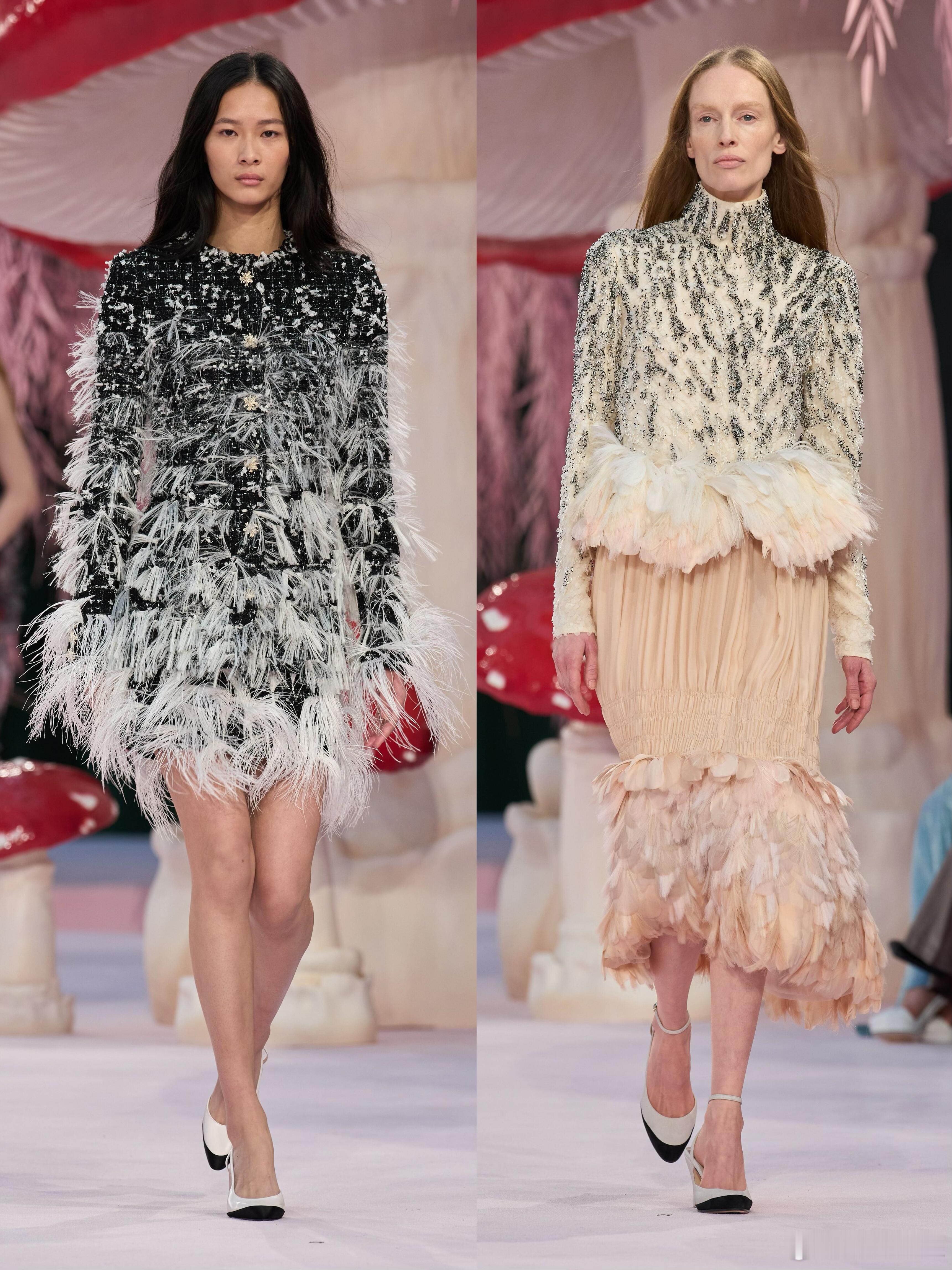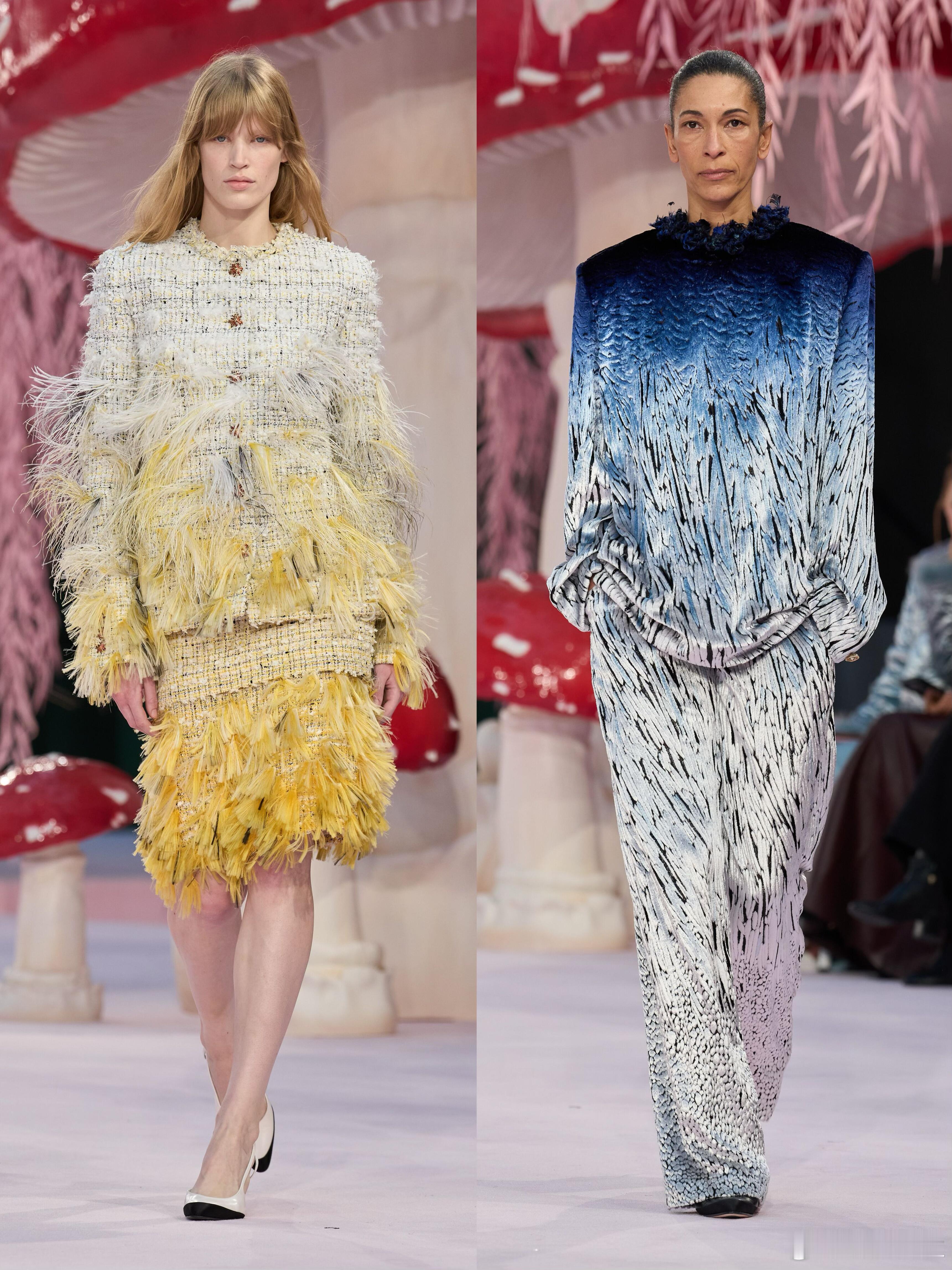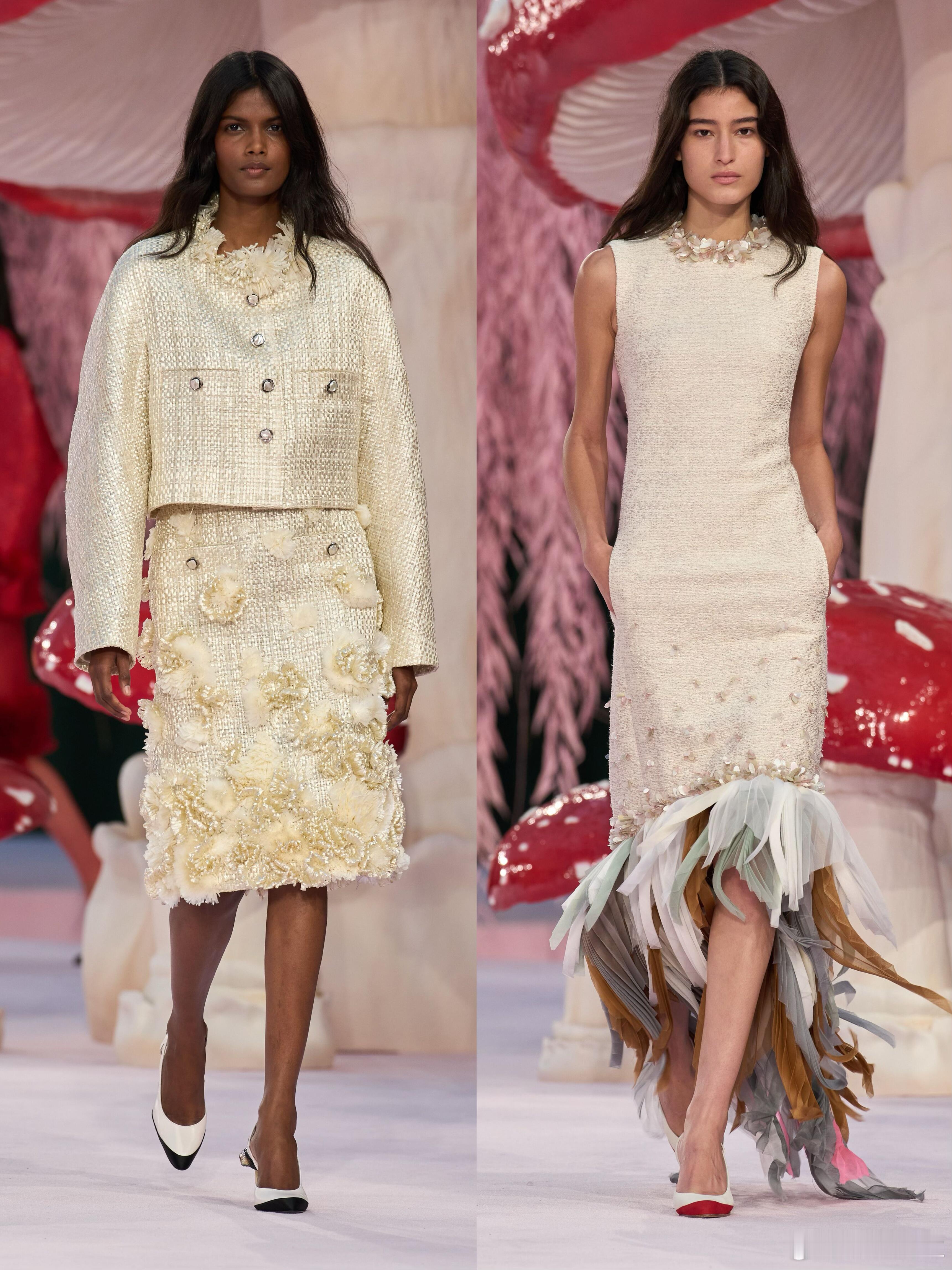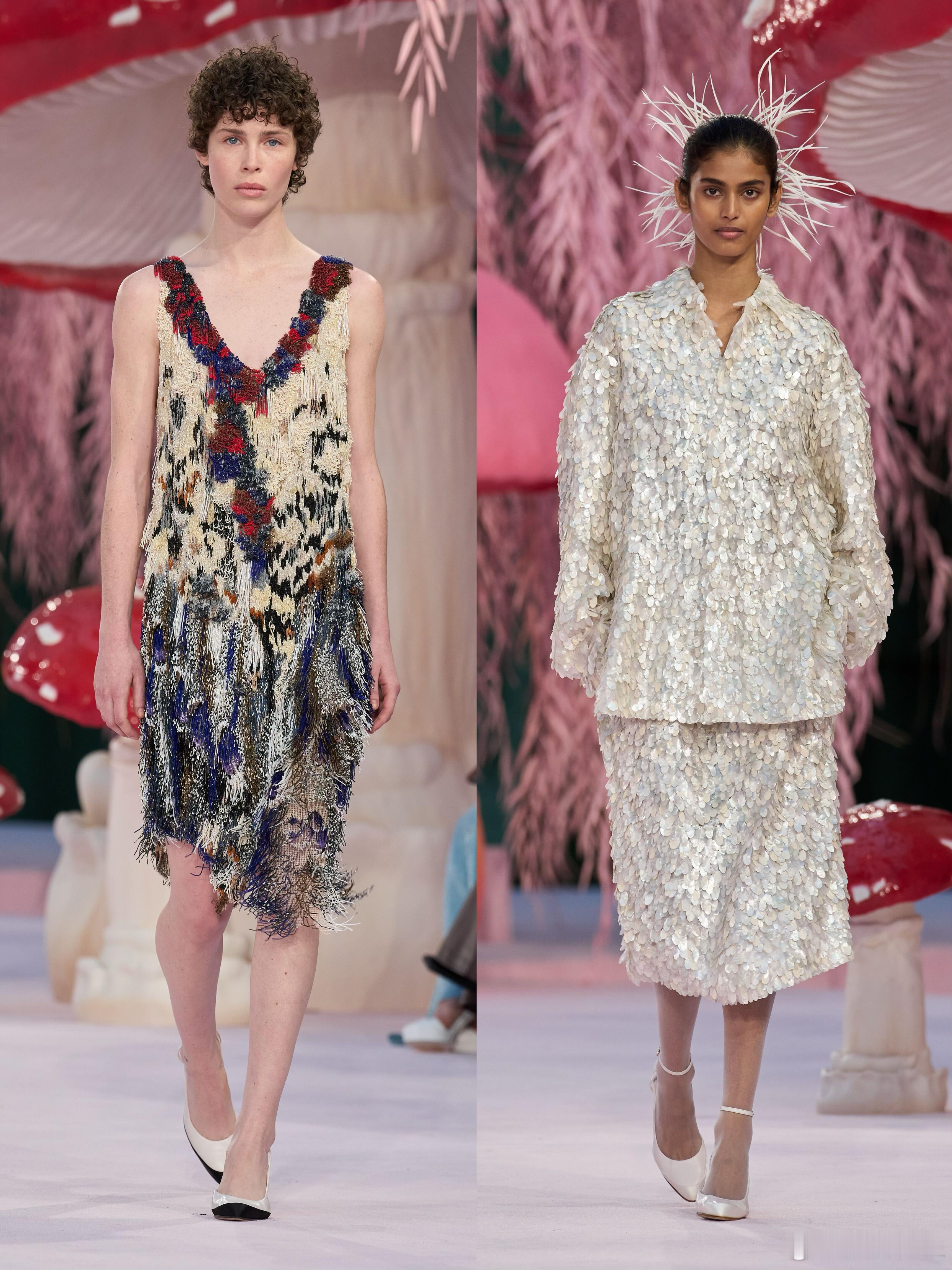 时装周大秀直击 在Chanel春夏大秀中,Blazy用精湛的工艺编织了一个五彩斑斓的梦。标志性的毛边处理与重工刺绣,让轻盈与质感并存。河流般的纹理在行走间荡漾,仿佛误入森林深处的迷幻空间。这不仅是高级定制的创新,更是对自然意象的极致重构,每一件华服都像是从童话森林中采撷而来的艺术品。