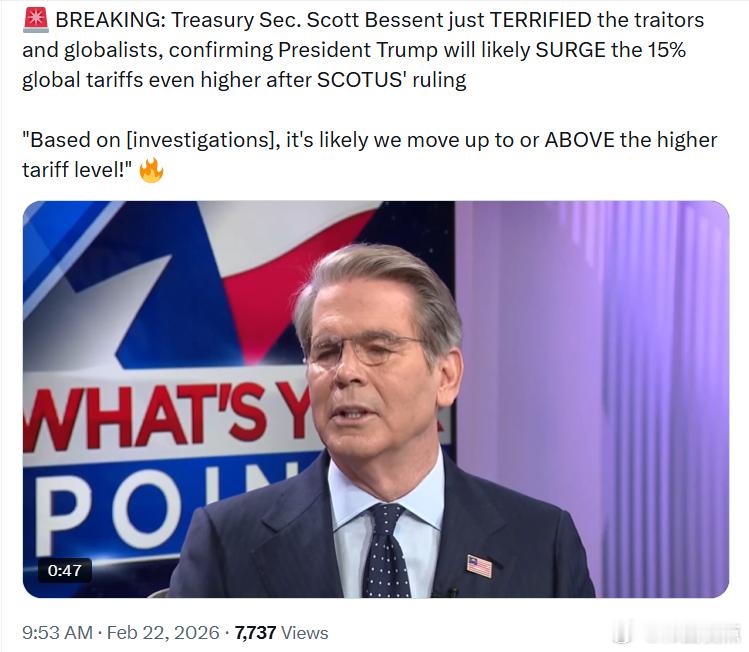 美国财政部长斯科特·贝森特表示,特朗普总统很可能会把15%的全球关税进一步大幅上调。