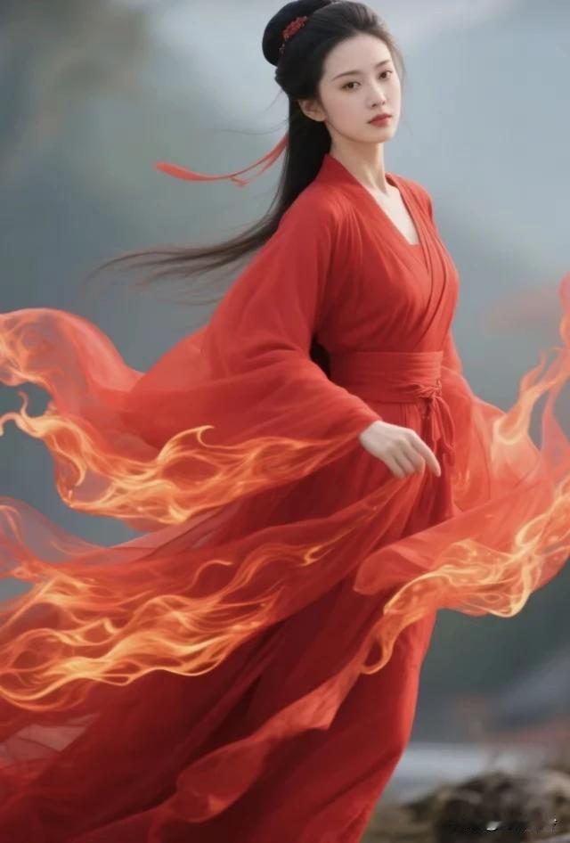 一袭红装艳满天, 风姿绰约胜仙颜。 媚眼如丝藏万种, 粉面含桃仪态妍。