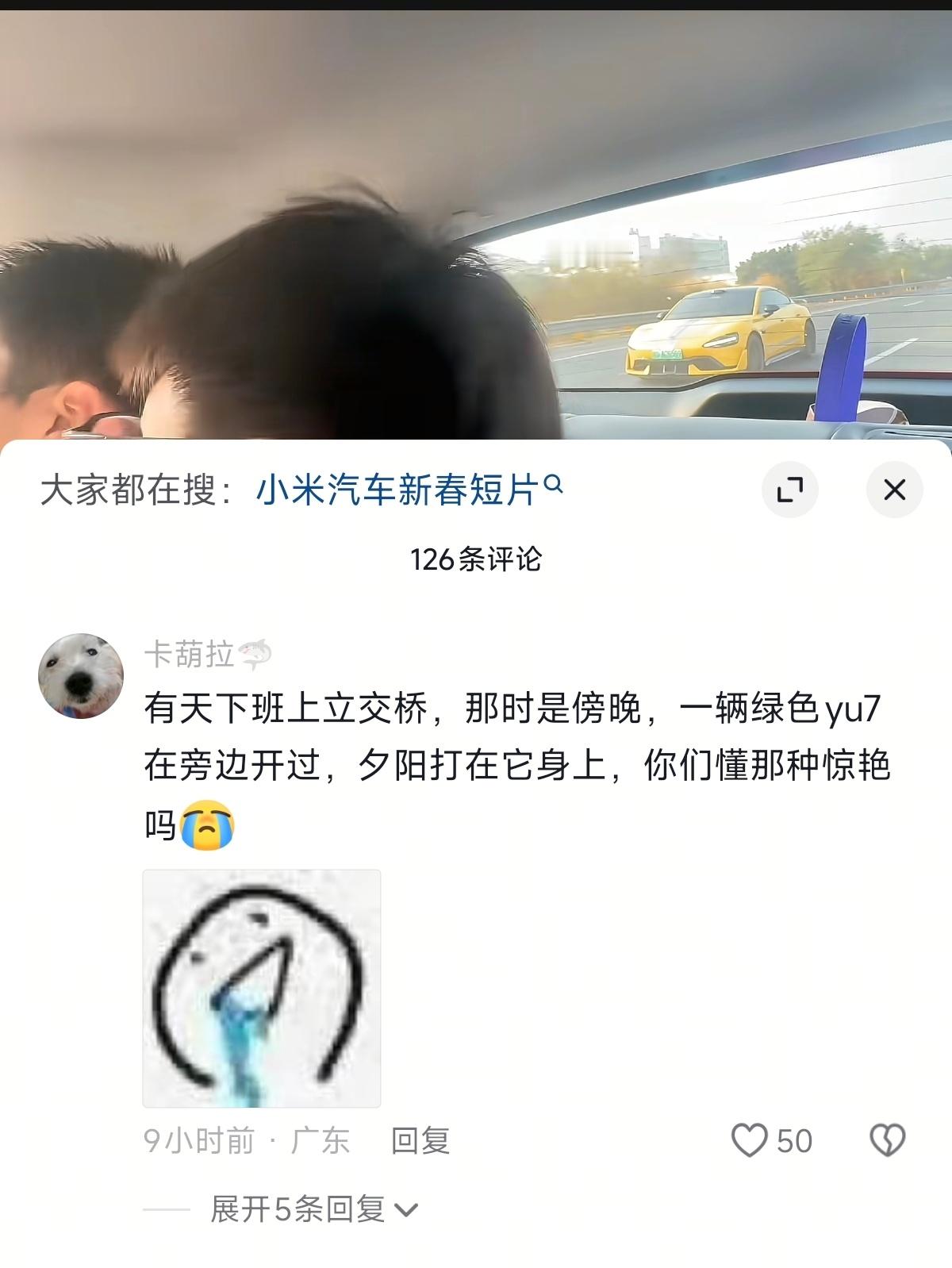 “有天下班上立交桥,那时是傍晚,一辆绿色yu7在旁边开过,夕阳打在它身上,你们懂那种惊艳吗?”
