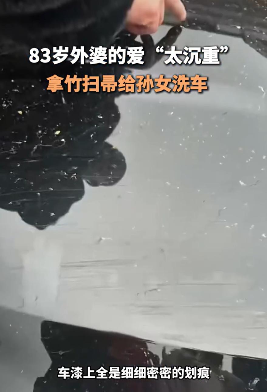 这份爱太沉重了!江西抚州,女子回家过年,准备开车出门时,却发现车上全都是划痕,她第一反应是哪个熊孩子干的好事,赶紧调监控,才发现是83岁外婆好心帮她洗车导致的,女子的气瞬间全消了 监控画面里,画面里,一个佝偻着背的老人,拿着竹扫帚,正一下一下认真地刷着她的车。那是她83岁的外婆 春节鞭炮碎屑落了一车,老人看着脏兮兮的车,心里过意不去。在她那个年代,洗车哪有那么多讲究,扫帚蘸水,使劲刷就干净了。她不知道现在的车漆有多娇贵,不知道竹扫帚比砂纸还狠,她只知道外孙女的车脏了,她要帮忙洗干净 女子看着视频,气全消了,眼眶却红了 这事传到网上,有人说这是最贵的外婆牌洗车,有人说看着又好笑又心酸,更多人想起了自家老人那些让人哭笑不得的好意 我妈把我几千块的羽绒服扔洗衣机里搅坏了,她说看着有点脏,顺手就洗了 我奶奶给我娃穿了三层棉袄,差点热出痱子,她说孩子不能冻着 我爸把我电脑主机后面的线全拔了,说要帮我擦擦灰,结果我半天没连回去 这些事儿,家家户户都发生过 老人的爱,总是带着他们那个年代的印记。他们经历过苦日子,觉得力所能及的事绝不麻烦别人,觉得能动手的事绝不花钱解决。他们不懂什么是抛光打蜡,不懂什么是精细面料,他们只懂一个朴素的道理:孩子的东西,要爱惜 车花了可以修,东西坏了可以换,但那个拿着竹扫帚帮你洗车的人,这辈子还能见几次呢? 83岁外婆拿竹扫帚给孙女洗车