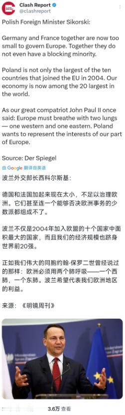 波兰外交部长西科尔斯基今天(北京时间2月22日)表示:“德国和法国加起来现在太小,不足以治理欧洲。它们甚至连一个能够否决欧洲事务的少数派都组成不了。 波兰不仅是2004年加入欧盟的十个国家中面积最大的国家,而且我们的经济规模也跻身世界前20强。 正如我们伟大的同胞约翰·保罗二世曾经说过的那样:欧洲必须用两个肺呼吸,一个西肺,一个东肺。波兰希望代表我们欧洲地区的利益。” 大家都能看出来,西科尔斯基这话不是随口一说的外交辞令,而是基于硬实力的现实考量。长期以来,欧盟的核心决策圈一直被“法德轴心”牢牢把控,这两个国家在过去几十年里几乎垄断了欧洲的一体化议程。 但如今,国际局势风云突变,这辆由德国和法国共同驾驶的“欧洲列车”明显有些跑不动了。 西科尔斯基之所以敢这么“硬刚”,是因为他手里握着实实在在的底气。波兰在2004年加入欧盟的十个国家中,无论是国土面积还是人口规模,都稳居第一。 更关键的是,波兰的经济表现非常亮眼,经济规模已经跻身世界前20强。这种体量让波兰不再甘心只做一个听话的“追随者”,而是要在欧盟的谈判桌上给自己争取一个主座。 我们再仔细琢磨一下“连一个能够否决欧洲事务的少数派都组成不了”这句话,这简直是对法德现状的降维打击。 在欧盟的决策机制里,想要阻挡一项提议,通常需要凑齐一定数量的反对票。西科尔斯基这番话意味着,法德两国如果不够团结,或者无法拉拢足够的盟友,它们甚至连最基本的“阻却”能力都已经丧失。 这说明以前那种“法德点头,全欧通过”的时代已经彻底终结了。欧洲的政治版图正在碎片化,权力的天平已经开始向中东欧国家倾斜。波兰正是看准了这个时机,准备接棒成为欧洲新的“话事人”。 为了给自己的野心寻找理论支撑,西科尔斯基还搬出了已故教皇约翰·保罗二世的名言:“欧洲必须用两个肺呼吸”。 这句话原本是教皇用来形容东西欧在文化和精神上的互补,但在波兰外长的嘴里,这句话变成了地缘政治的冲锋号。 他所谓的“西肺”指的是老牌的西欧强国,而“东肺”自然就是以波兰为代表的中东欧国家。 波兰现在摆出的架势非常明确:以前欧洲只靠“西肺”呼吸,造成了严重的“缺氧”,现在波兰要代表东欧地区,让欧洲学会用“两个肺”均衡呼吸。这种修辞策略非常高明,它把波兰夺权的行为包装成了“拯救欧洲”的正义之举。 实际上,波兰之所以现在敢于如此高调,除了经济实力的增长,更离不开地缘政治的红利。俄乌冲突爆发后,波兰作为北约东翼的“桥头堡”,战略地位瞬间飙升。 相比于法德在援助乌克兰问题上的犹豫不决,波兰表现出了极强的行动力和领导力。这种强硬姿态让波兰在欧盟内部赢得了不少话语权,也让它看清了法德两国的“软肋”。 德国和法国在能源危机、防务自主等问题上的进退失据,让波兰觉得它们已经不具备单独治理欧洲的能力。西科尔斯基的言论,本质上就是一次“逼宫”,要求欧盟承认中东欧国家的战略地位,重新分配权力。 我们还要看到,波兰的野心并不仅仅停留在口头上。波兰政府近年来在军备上的投入堪称“疯狂”,它正在迅速打造欧洲最强大的陆军之一。 这种硬实力的积累,给了波兰在外交上“掀桌子”的勇气。当一个国家的经济规模进入全球前20,同时又在防务上投入巨资时,它自然不会允许自己被排除在欧洲的核心决策圈之外。 西科尔斯基强调波兰是2004年入盟国家中的“老大”,就是在向其他中东欧国家喊话:跟着波兰走,才能维护我们这个地区的利益。 这番言论对于法德两国来说,无疑是一次极其尴尬的公开处刑。虽然法国和德国依然是欧盟预算的主要贡献者,但在政治感召力和战略决断力上,它们确实出现了明显的衰退。 波兰的挑战并非没有道理,欧洲的事务如果继续由暮气沉沉的法德把持,恐怕很难应对当前复杂的安全挑战。西科尔斯基虽然话说得难听,但他揭示了一个不可逆转的趋势:欧洲的权力重心正在东移。未来的欧盟,如果不想彻底瘫痪,就必须学会适应这种新的力量对比。 对于欧洲的未来来说,这种权力的争夺未必是坏事。以前法德主导时,往往容易忽视中东欧国家的安全关切。 现在波兰要当“东肺”,要代表地区利益,这会迫使欧盟在制定政策时更加平衡。 虽然“法德轴心”不会立刻崩塌,但它必须给波兰留出足够的位置。欧洲正在进入一个“三巨头”甚至“多巨头”竞争的新时代。西科尔斯基的这番话,就像是给欧盟的一封“挑战书”,宣告了波兰正式加入欧洲领导权的争夺战。