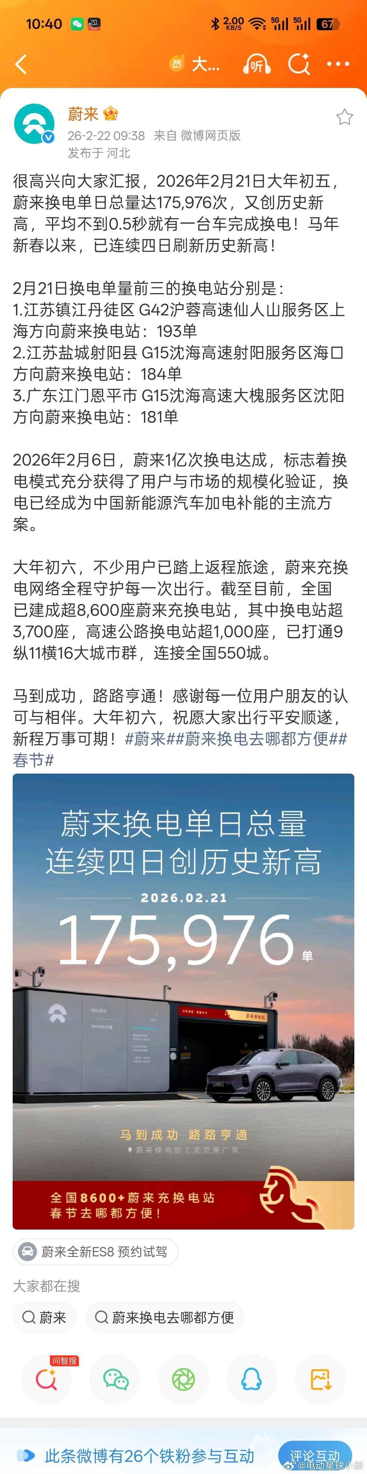 今天是年初六,返程高峰要开始了,但蔚来这边,单日换电次数却在初五(也就是昨天)再次创下新高!