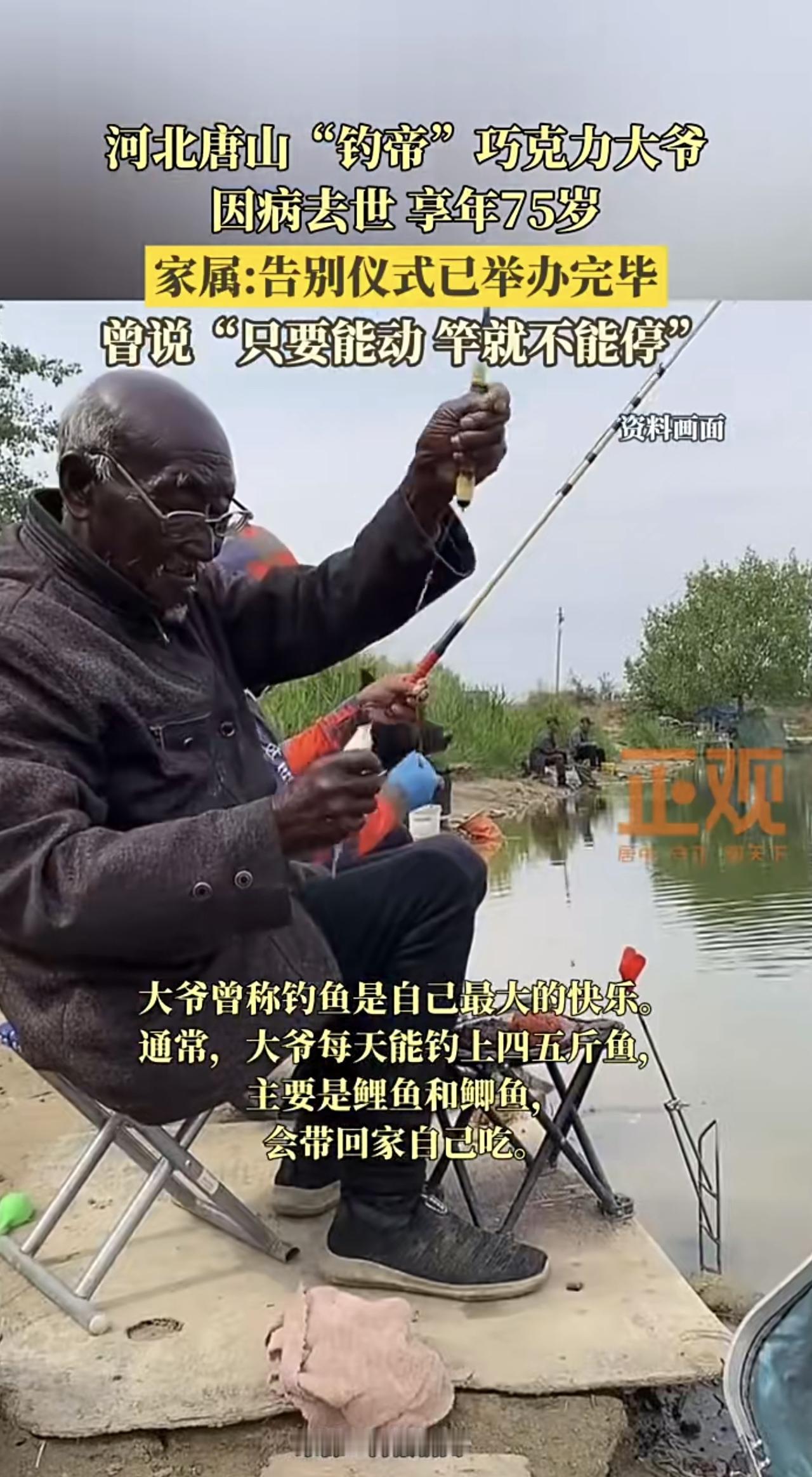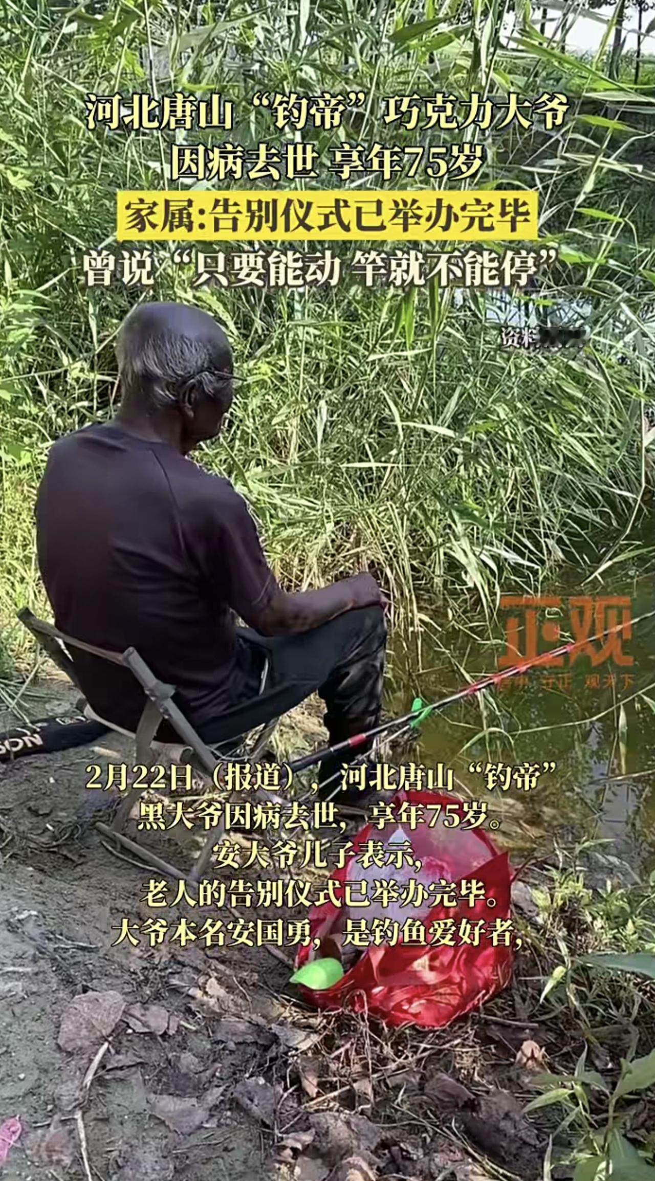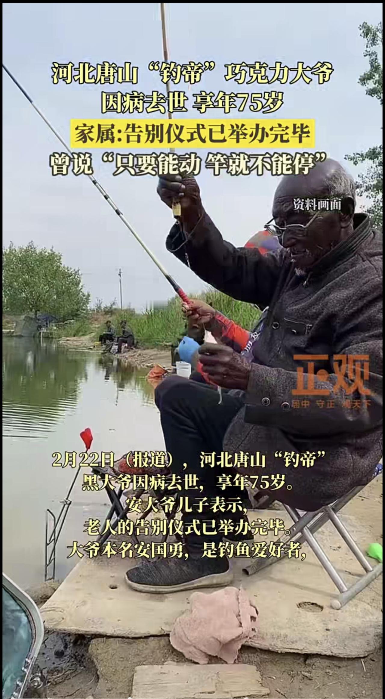 2月22日(报道),河北唐山“钓帝”黑大爷因病去世,享年75岁。安大爷儿子表示,老人的告别仪式已举办完毕。老人曾言:“只要能动,竿就不能停。”