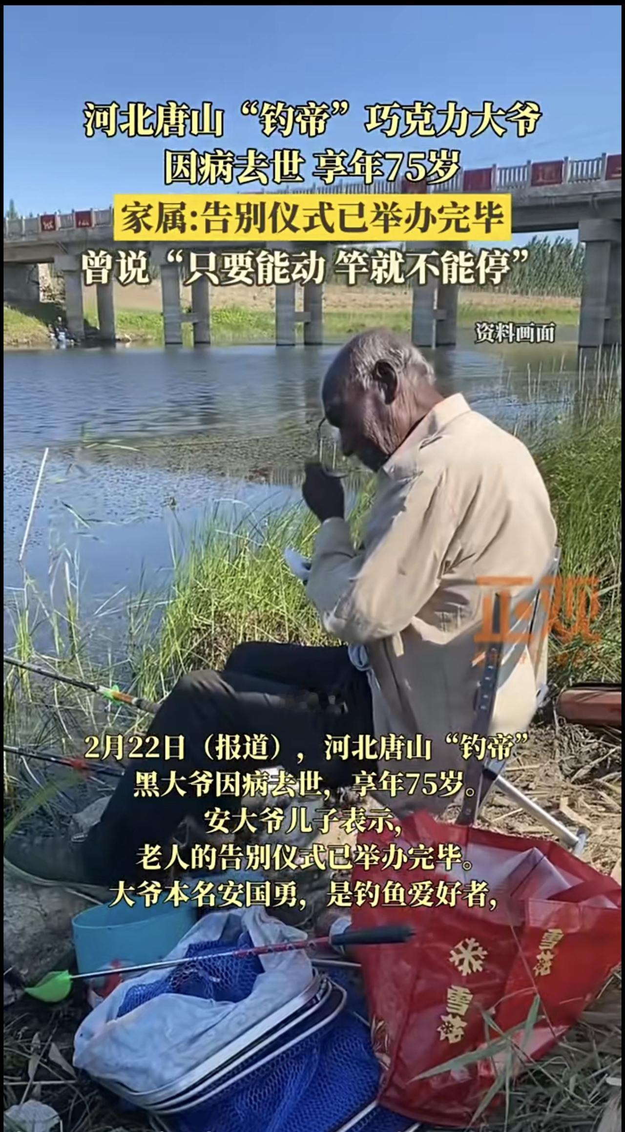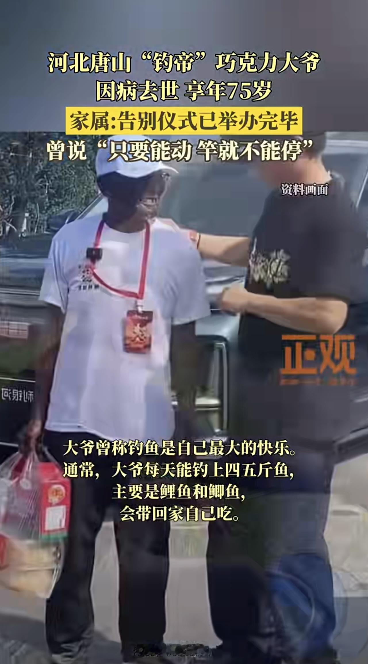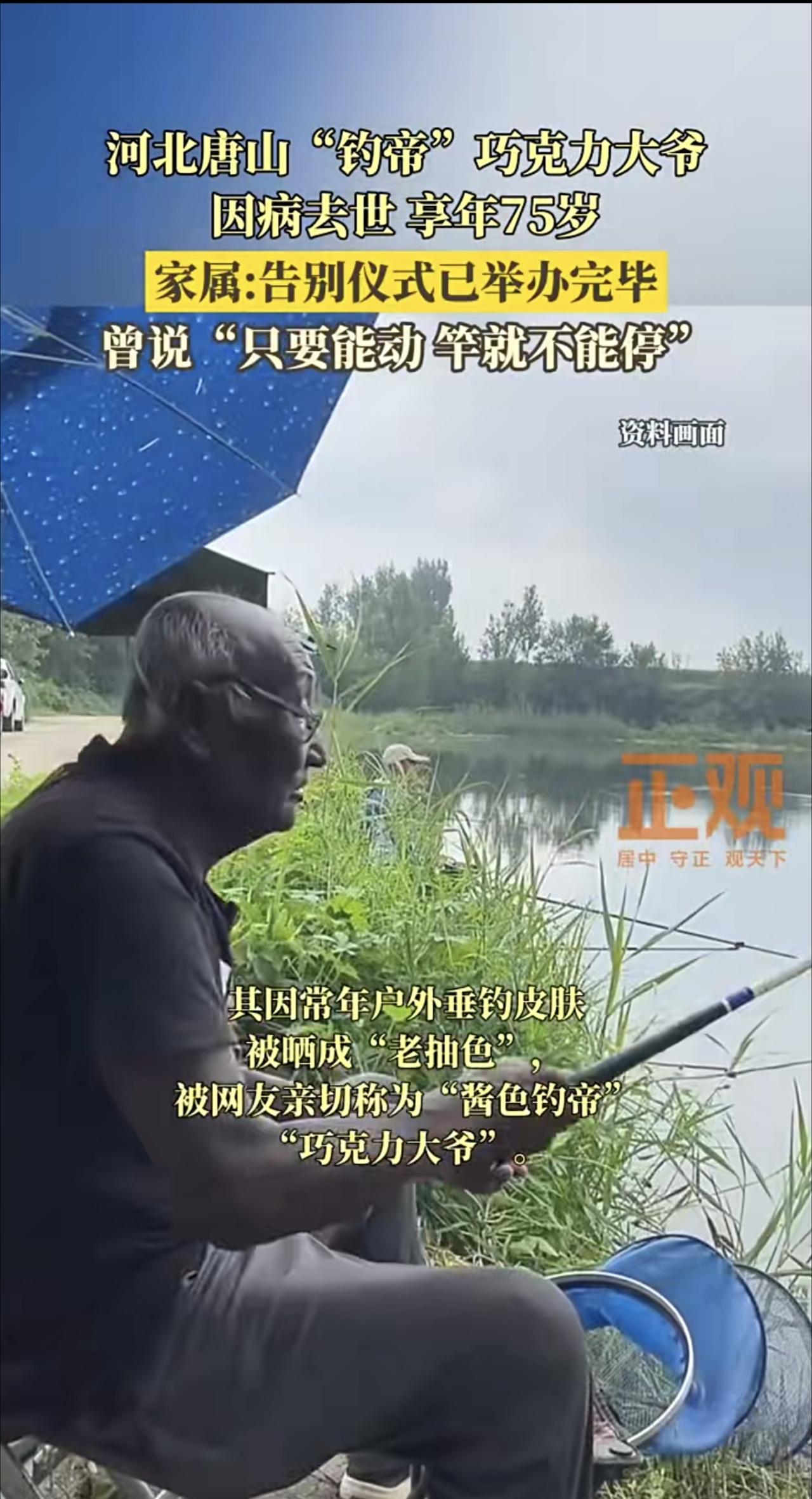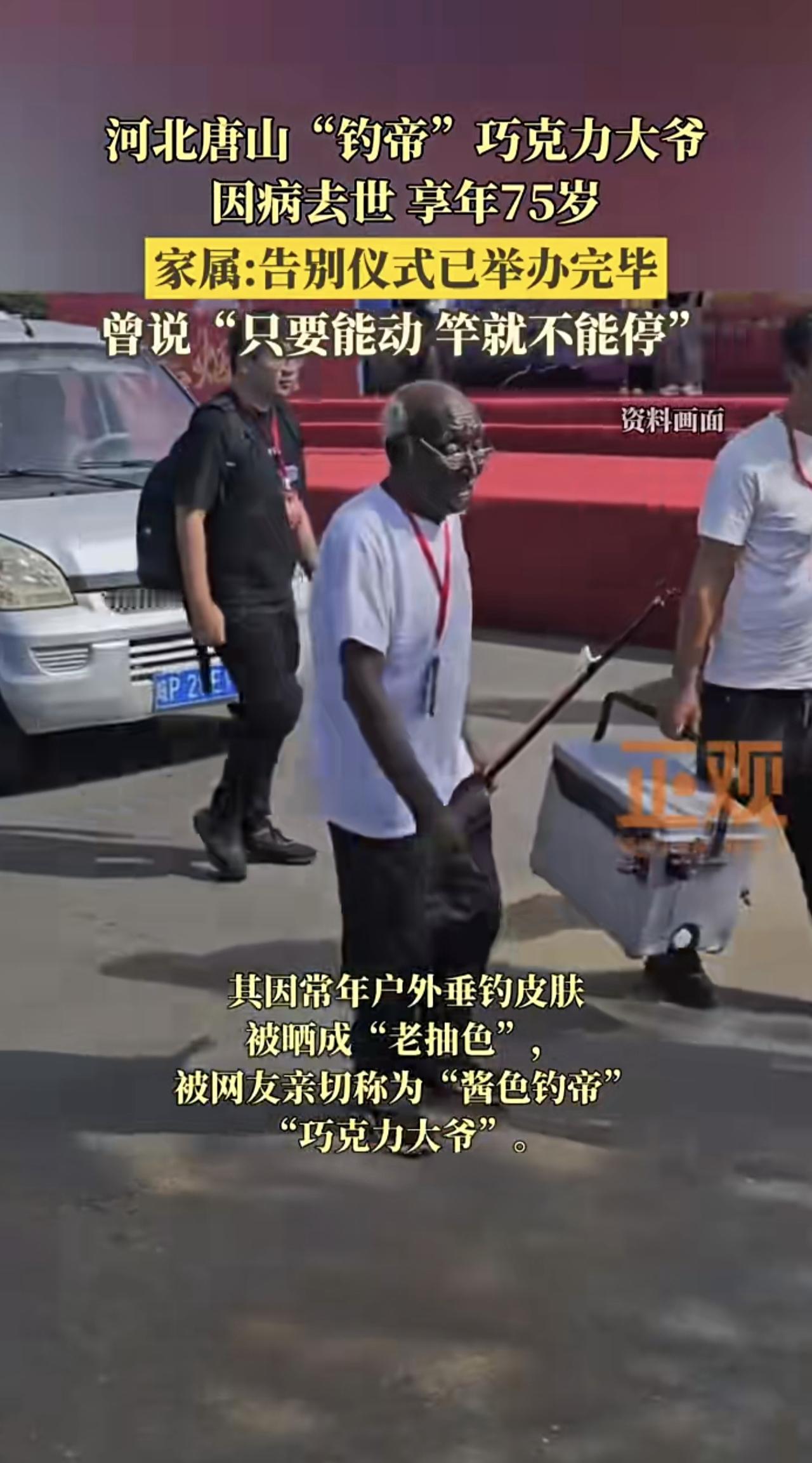 2月22日(报道),河北唐山“钓帝”黑大爷因病去世,享年75岁。安大爷儿子表示,老人的告别仪式已举办完毕。老人曾言:“只要能动,竿就不能停。”