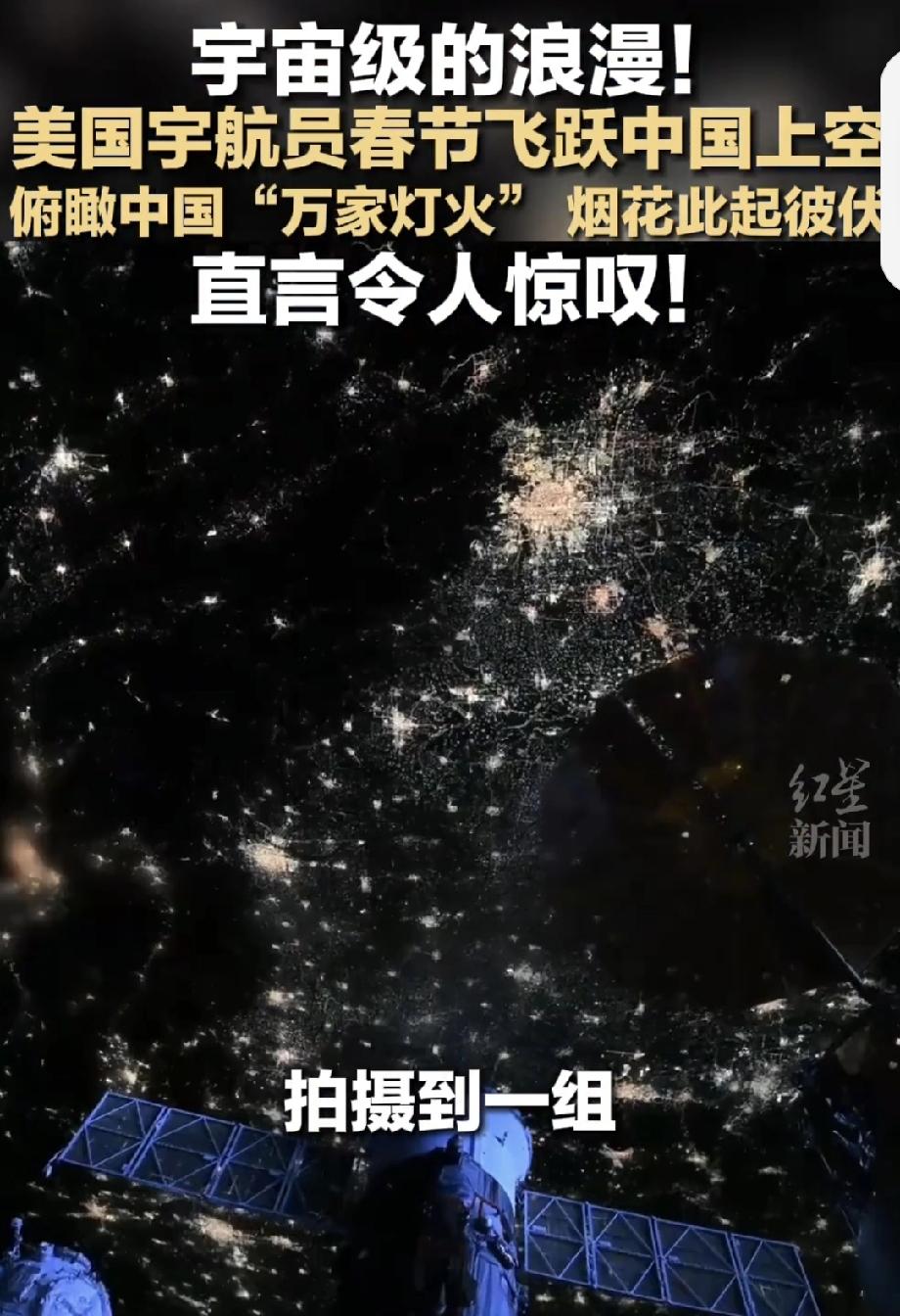美宇航员从太空俯瞰中国春节万家灯火 美宇航员从太空俯瞰中国春节万家灯火,这画面想想就超震撼!春节,那可是咱中国人一年里最隆重的节日,家家户户张灯结彩,灯火通明,从太空看下去,估计就像一片闪耀的星河。 记得之前看到过从高空拍的城市夜景图,那些灯光交织在一起,特别有氛围感。而春节的万家灯火,更是饱含着团圆和温暖。一家人围坐在一起吃年夜饭、看春晚,窗外灯火映照,温馨极了。美宇航员看到这样的场景,估计也会被咱中国春节的热闹感染,这就是文化的魅力,哪怕在遥远太空都能感受到。