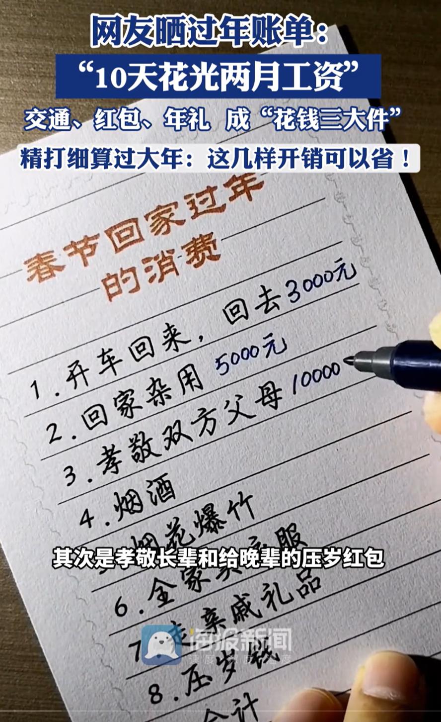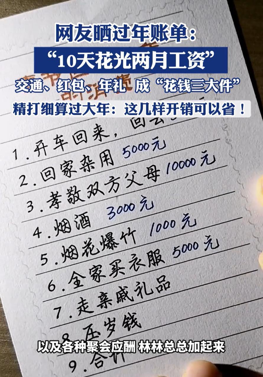 扎心了!一女子过完年准备返程上班,临走前,她特意算了一笔账,看看过年回家这一趟花了多少钱,结果不算不知道,放假的10天竟然花了她2个月的工资,其中红包就是最大头。网友:10天花两月工资说明你工资挺高的啊 她列了个大概,钱主要花在三个地方:路费、红包、还有走亲戚带的年货和礼品。其中红包这一项,占了大头 先说路费。不管是飞机、高铁还是自驾,过年期间的票,基本不打折,油费过路费也不少。回去一趟,回来的票还得抢,往返加在一起,大几百到上千块,很常见。要是家在偏远点的地方,还得转几次车,花的钱和时间都更多 再说红包。这个可能是很多人过年最绕不开的一环。长辈的红包,多少要表示心意;晚辈的红包,更是没法省。给父母的红包,给爷爷奶奶外公外婆的孝敬,还有外甥侄儿侄女们的压岁钱,一个都不能少。少了拿不出手,多了自己扛不住。一年没见,回去一趟,总得意思意思 还有年货和礼品。走亲戚串门,总不能空着手。水果、牛奶、烟酒茶,这一份份拎出去,看着不显眼,加一起就是不小的数字。有些关系近的,还得带点好的,心意要到 女子算完账,估计心里有点五味杂陈。辛苦攒了两个月,回去一趟就差不多清零了。但话说回来,这些钱,哪一笔是该省的呢? 路费是回家的必需,红包是心意和面子的双重表达,年货礼品是走亲访友的礼节。说到底,过年回家这件事,本来就不是冲着省钱去的。一年到头,也就这么几天能跟家人好好待着,能见见亲戚朋友。钱花了,团聚了,热闹了,心里也踏实了 年过完了,账算完了,该走的路还得走。该花的钱花了,该见的人见了,该给的给了,心里也就不欠着了。明年回家,该花的还是得花。这就是普通人的日子,有进有出,有来有往 网友晒过年账单:10天花光两月工资
