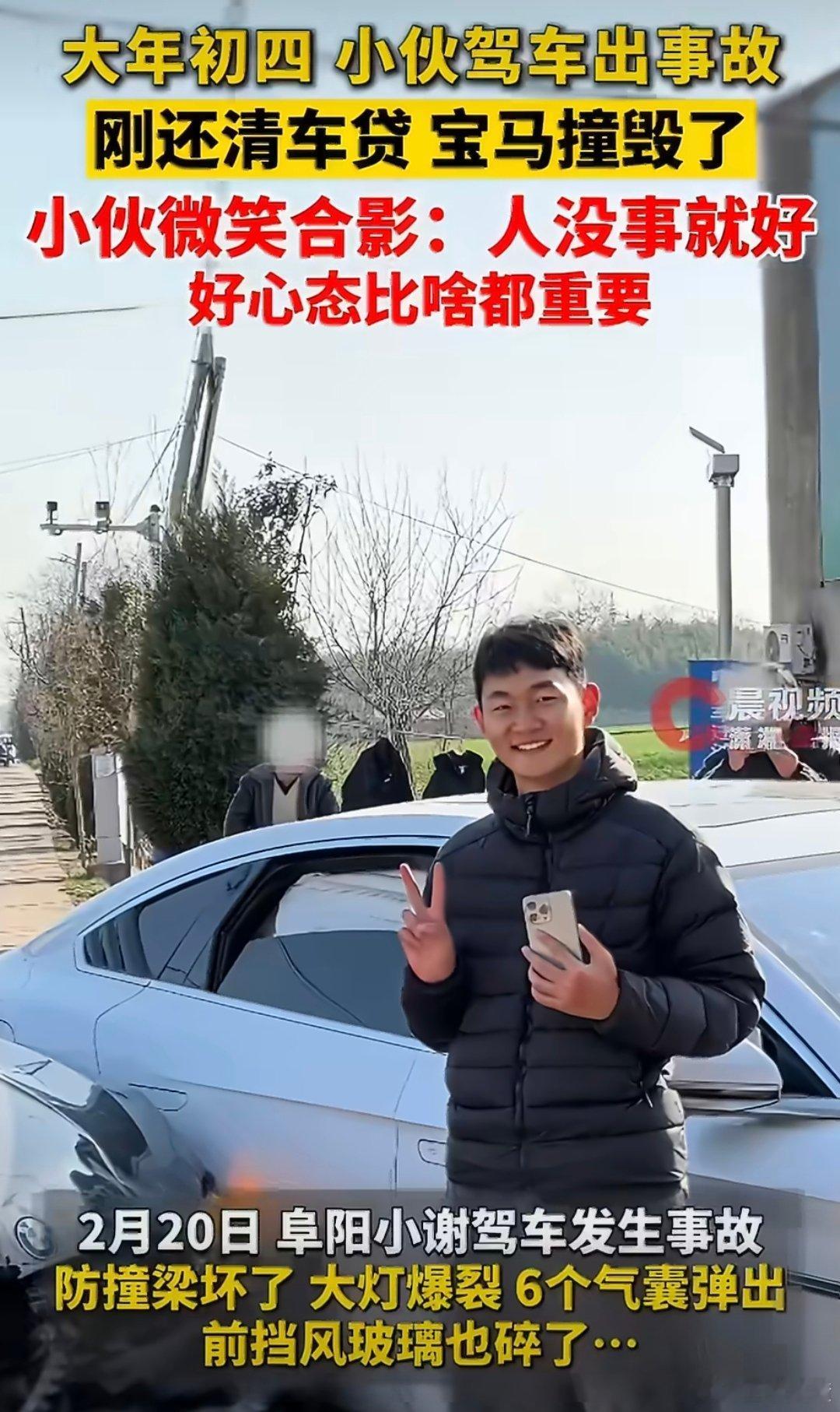 小伙撞毁刚还清车贷的宝马微笑合影帅哥心态不错以后肯定能开大揽子