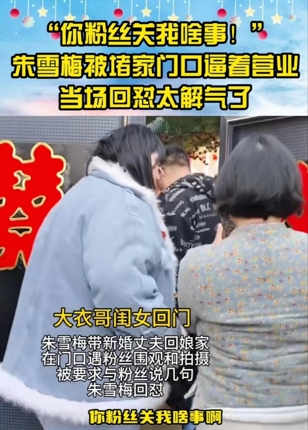 谁能想到回门省亲的温馨时刻,会变成一场无底线的围堵?2月18日大年初二,朱雪梅和丈夫带着回门礼回娘家,刚到家门口就被大批拍客围得水泄不通,镜头直怼脸上,丝毫没有给这对小夫妻留一点私人空间。 本是新婚回门的欢喜日子,却被无端打扰,面对拍摄者的步步紧逼,甚至被要求配合营业,朱雪梅再也忍不住,一句“你粉丝关我啥事!”直接回怼,硬气又直白,把积压的委屈和不满全说了出来。 常年被无底线蹭流量,日常隐私被肆意窥探,任谁身处这样的处境,心里都会积攒委屈与不满。这场回怼从不是一时的冲动爆发,而是长久被过度打扰后的正常情绪流露,外人看的是热闹,个中滋味唯有当事人自己清楚,是非曲直,自在人心。