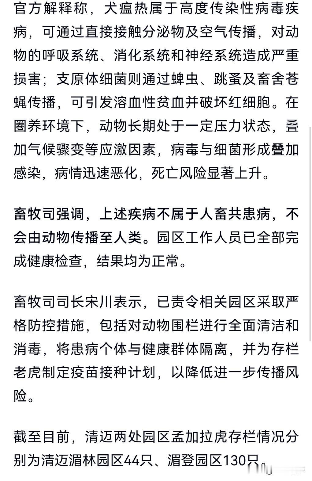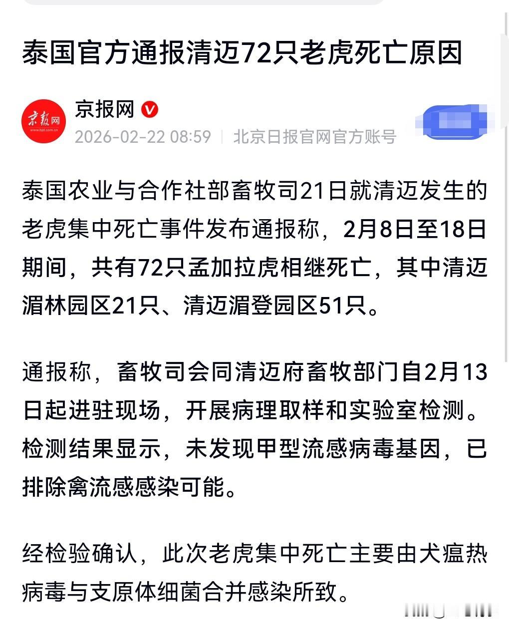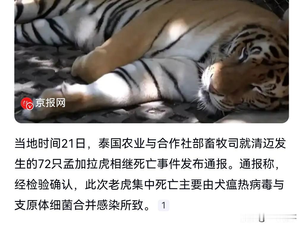 这老虎本来就少,没想到一下还死了这么多只。 当地时间21日通报,近期,清迈72只孟加拉虎死亡。 死亡原因主要是有犬瘟热病毒与支原体细菌合并感染所致。 动物长期处于压力的状态,如果感染了这种病毒,就很容易死亡。 这种病不会传给人类。 死了这么多只了,真的是损失惨重。清迈72只老虎死亡 泰国通报原因