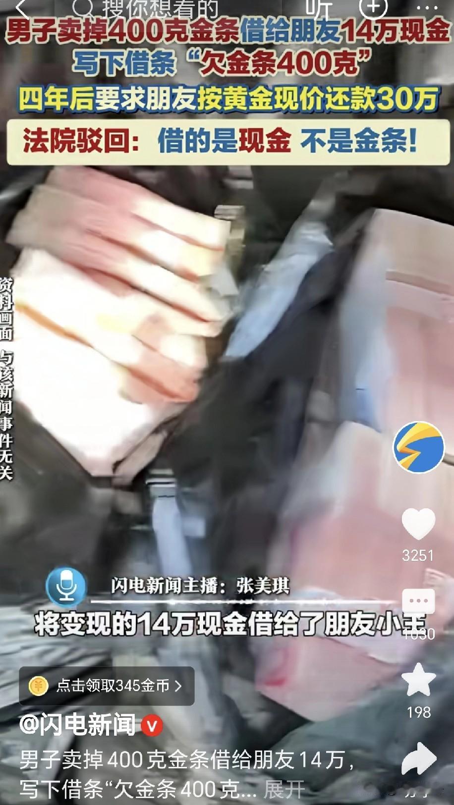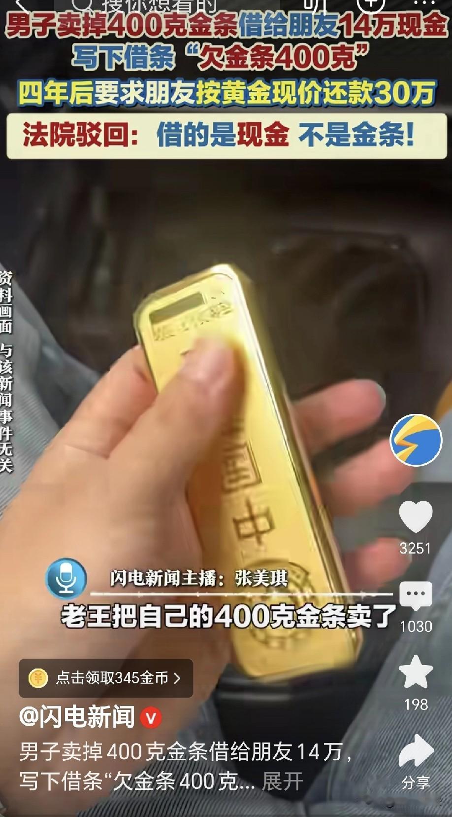 一男子朋友借钱,男子义不容辞,立刻把自己的400g金条卖了,将变现的14万现金借给了朋友,朋友写了欠条: 今欠老王金条400g,纯度99.9%。万万没有想到,金价大涨,男子后悔,要朋友按欠条上400g黄金的现价还30万,朋友拒绝: 我借到的是14万现金不是金条!男子急了:你不借钱我不会卖,不卖现在就是金条!法院判了! 老王有个宝贝,是一根重达400克,纯度99.9%的金条。 这金条在老王心里,那可是沉甸甸的财富象征,他藏在家里最隐蔽的地方,时不时会拿出来欣赏把玩。 万万没有想到,朋友小王遇到了急事,急需一笔资金用来周转生意。 小王急火火找到老王的家里,他说尽了好话要老王帮自己一把。 老王心善,为了朋友他两肋插刀,看到小王急的冒火,他瞬间就心软,决定帮他度过难关。 可是他手里并没有现金,如果要借,就得把金条给卖了。 他心疼至极,拿着金条犹豫了好久,到了最后,还是发现朋友最重要。 老王狠了狠心,决定把金条卖了换钱。他带着小王,一起去把金条给卖了。 金条按照当时的市价,400克卖了14万元,买家立刻给他转账,140000元一分不少打到老王账上。 随后,老王并没有一次给小王,而是分作多次给小王转账。 小王拿到了14万元,他千恩万谢向老王表示,一旦用完立刻就会给老王还钱。 小王为让老王放心,他写了借条,借条上注明: 今有小王欠老王金条400g,纯度99.9%。 之后,日子一天天过去,可是,没想到金价一路飙升,涨到了想不到的价位。 老王后悔了,金价翻番,他那根400克的金条如今已经价值30万元了。 如果不卖,他现在就坐享其成,手里的14万黄金,蹭蹭蹭翻了一倍多了。 他悔的跺脚,扎耳挠骚,要是涨个一万两万,这事情也就算了,他自认倒霉。 可是,现在金价涨成这样,他活着这么大岁数,也不过只攒了这一根金条,现在等于一根变两根,这口气怎么能够咽到肚里。 他越想越气,立刻就找小王,你赶紧给我还钱,你必须给我按现在金条价值给我还钱! 小王急了: 老王,咱俩当时一起去卖的金条,你借给我的可是14万现金,又不是那金条,怎么能按现在的金价算呢? 老王更是面红耳赤,金价涨成这样,如果你不来借钱,我就不会卖掉金条,如果拿到现在,那可不是30万吗? 我好心把钱借你,最后成了我的损失严重,再说,你看这张借条,上面明明写着: 今有小王欠老王金条400g,纯度99.9%。 可小王也是委屈,谁也没长前后眼,要知今日,何必当初那?他也后悔不该向老王借钱。 老王的损失显而易见,他也确实是损失了翻倍的机会。 可是当初自己拿到的并非金条,而是那结结实实的14万现金,凭什么要我给你还30万? 俩人各执一词,昔日的好友最终闹到了法院。 有人认为,借条怎么写的就该怎么还,既然写的是借金条还写的那么详细,当时给你的现金怎么不直接写现金多少钱呢? 也有人说,这个问题就不能这么说了,要是金价跌了呢,你还金条还是还现金那?所以说,以当时的现金交付为准,实际收到什么,就该还什么。 法院经过调查,发现老王确实没有把400克金条直接交给小王,而是先变现成14万现金,再分几次转账给小王的。 而民间借贷的认定得看实际交付的东西,因此,法院认定,双方之间的债务就是14万元现金借款。 《民法典》第667条规定: 民间借贷合同从借款实际交付时成立。 老王没把金条直接给小王,而是卖成钱分批转过去了。 这就说明,老王借给小王的是14万现金,金条只是现金来源,不是借款标的物。 借条写的虽然是“欠金条”,但小王实际借的是现金,这就属于合同约定不明。 这时候得按实际交易情况来,总不能写个借条就能改变实际借款的性质。 说说这个事的三个坑: 1,借条没写清楚,小王写“欠金条”纯属画蛇添足,你收到的是啥,你就应该写啥,收到的是现金,就该直接写今借到老王14万现金,而不是写成欠老王金条400克。 2,老王感情用事害自己!老王卖金条帮朋友本是好事,但把投资风险算到朋友头上就不合适了。 金价涨跌属于正常市场波动,你既然当初选择卖了,就不能事后反悔,那涨了你要涨了之后的价值,如果跌了是不是小王就不该还你14万了? 3,口头约定没证据。就算老王说是因为小王来借钱他才卖的金条,法律也不认的。 因为金条卖了之后,钱就属于老王,他转出去的是自己的钱,和金条没关系。 老王败诉是必然的,法院不会支持他按金价要30万的诉求。 这事给所有人提了醒,亲兄弟明算账,写借条一定要写清金额和付款方式,别给自己挖坑。 当然,钱不外借,才是最好,相信能这样写借条,当初心里都是有想法的。 如果不借,朋友没了,金条还在,如今卖金条给朋友帮忙,最后自己损失,还没了朋友。 对此,你怎么看?