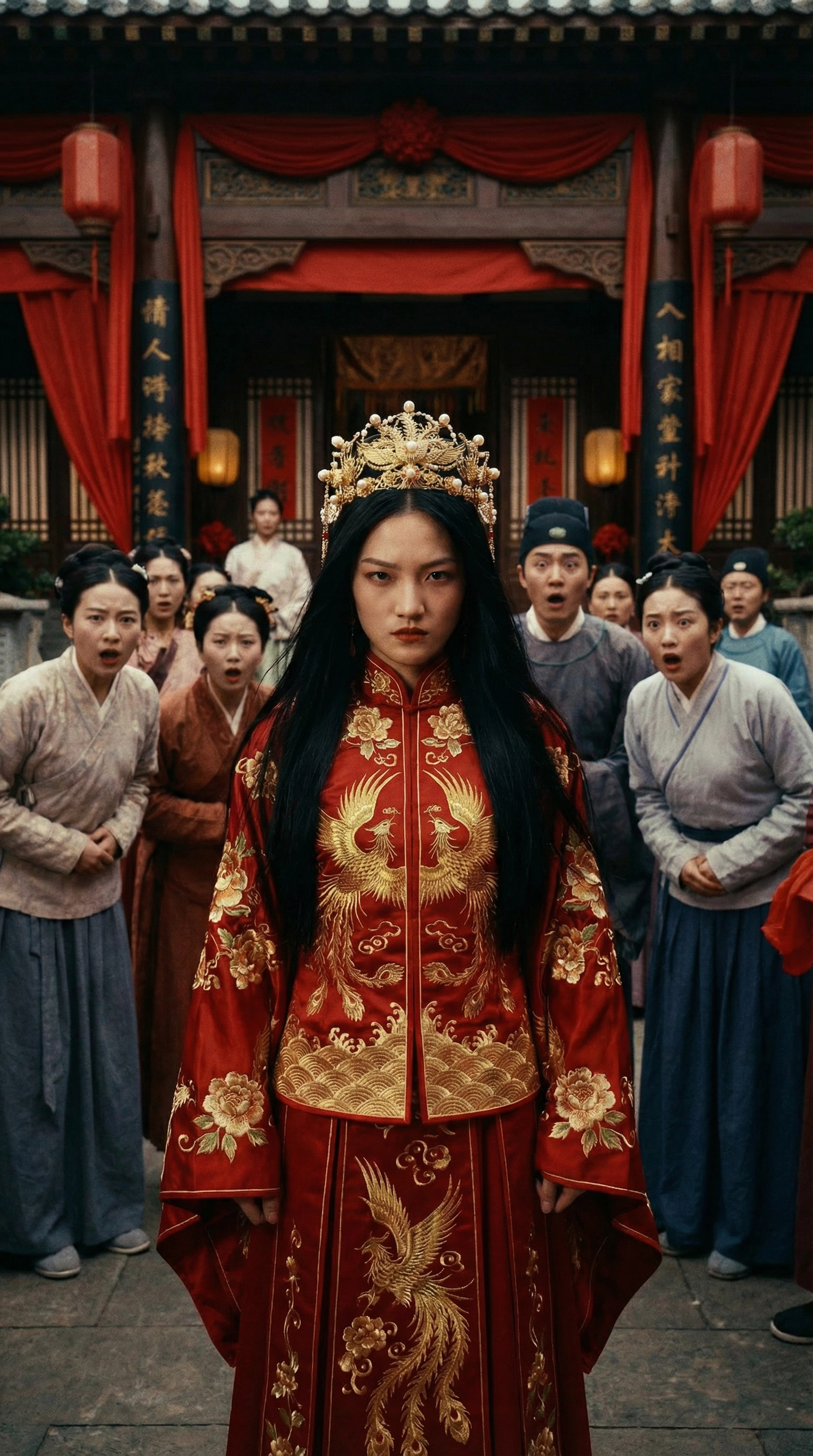 祝英台站在门口。凤冠歪着,发丝散乱,嫁衣被风掀起一角。