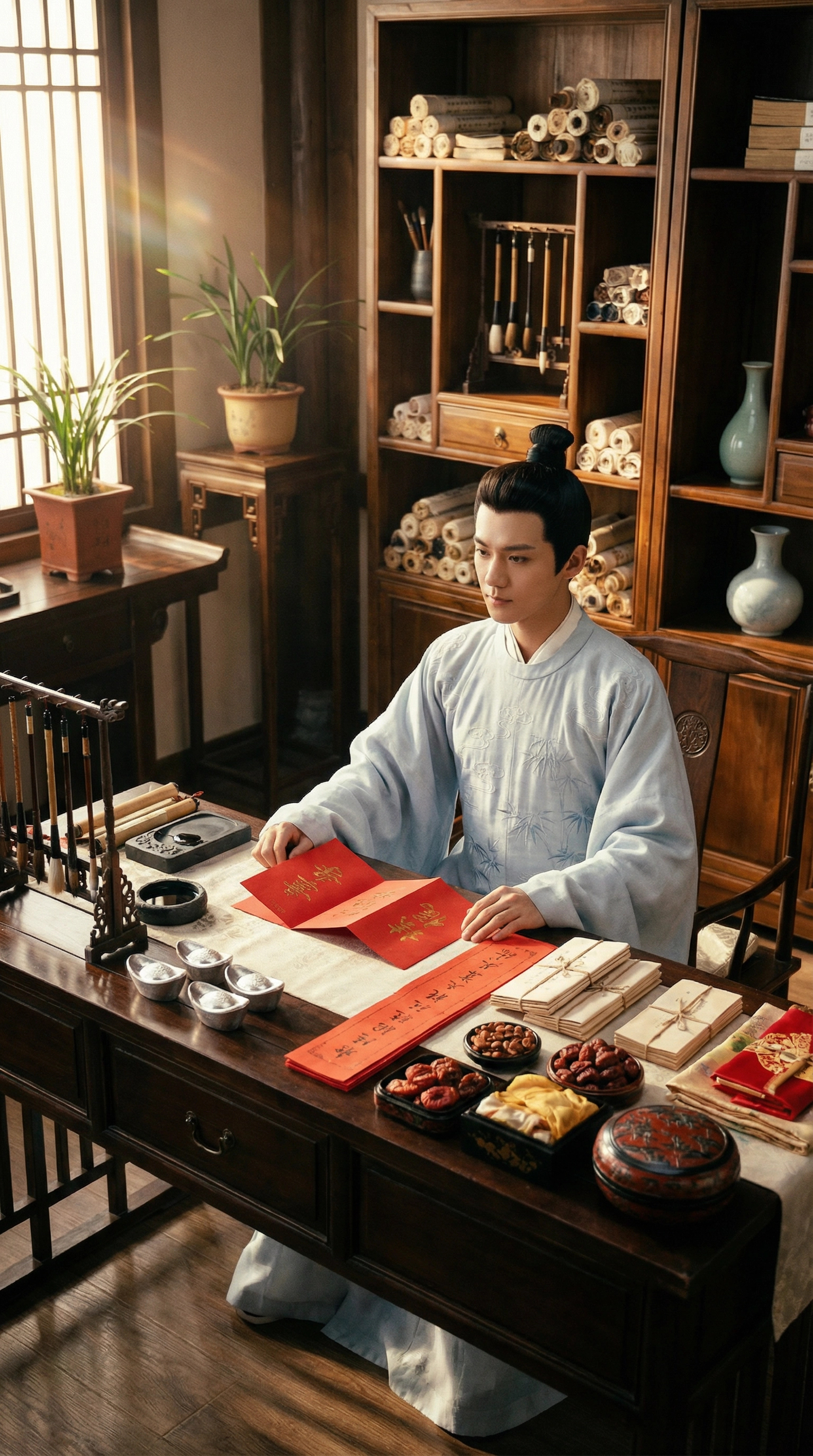 梁山伯正伏案整理聘礼。