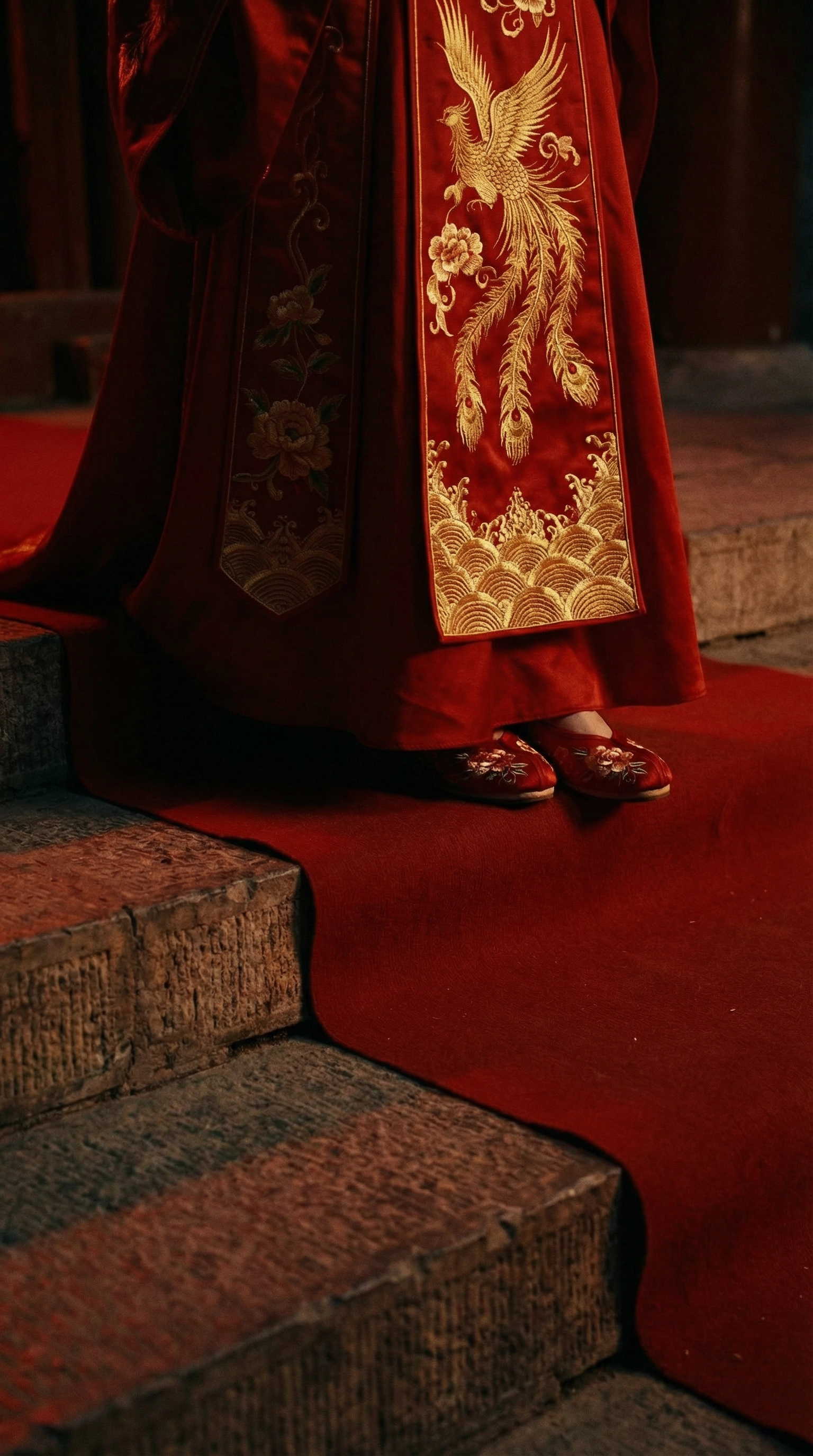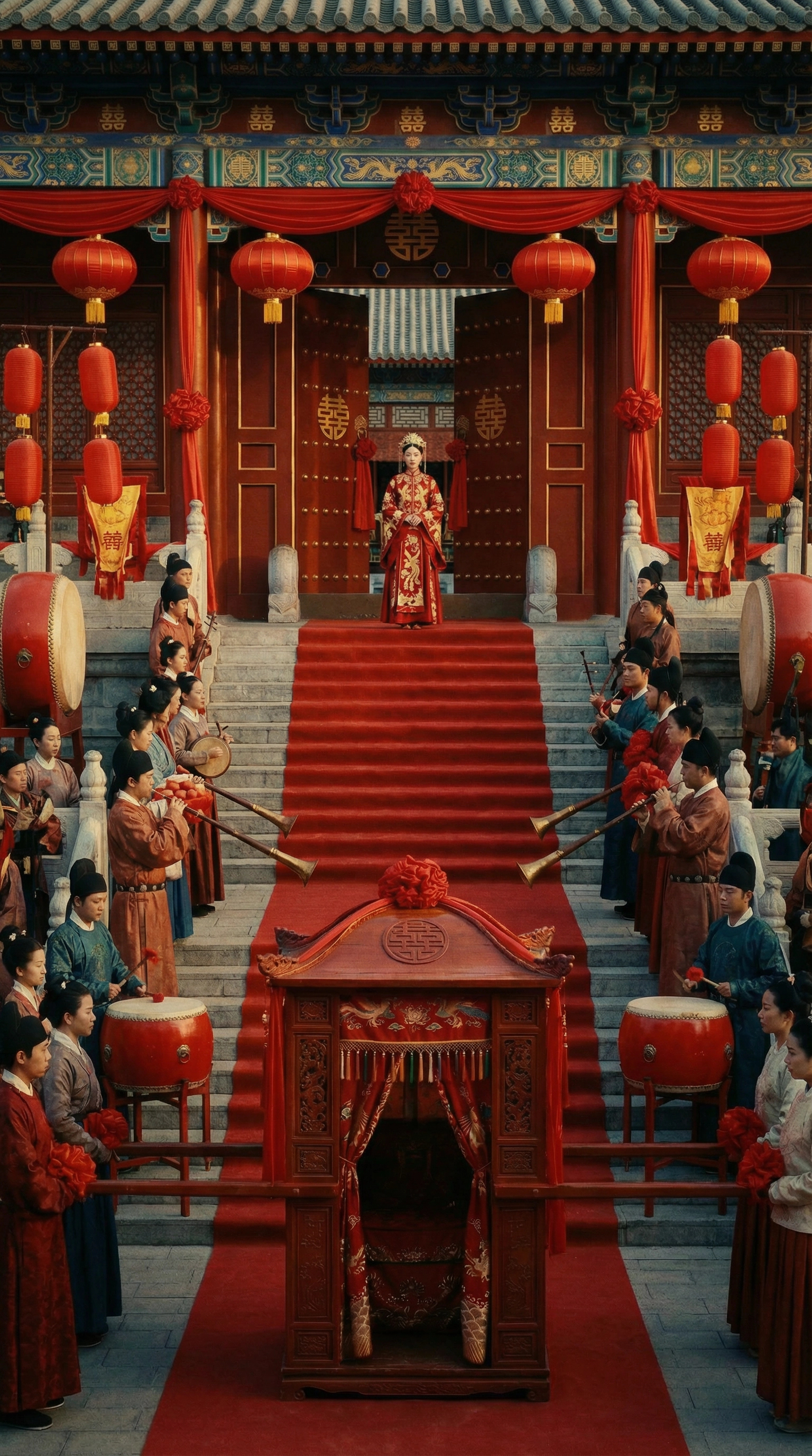 红毯铺地,花轿停阶,锣鼓齐鸣。所有人都在等新娘上轿。