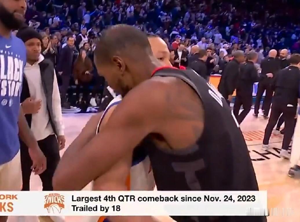 赢得对手尊重!布伦森谈杜兰特: “KD依旧是那么厉害。” “今天得到了30分。” “最后命中高难度三分。” “他一直都有这样的关键能力。” “我非常尊重KD。” 火箭队最后时刻落后4分,杜兰特接球命中三分,将分差缩小到1分! 沙梅特罚球两罚一中,尼克斯领先2分! 但是很可惜,时间所剩无几,火箭也没暂停了! 最终后场发球给到杜兰特,超远三分没能命中! 火箭队最终遗憾惜败! 最多的时候,火箭一度领先18分,最终还是被逆转了! 真的是一言难尽了! 赛后布伦森和杜兰特拥抱致意,互相送上祝福! 这是对手之间的惺惺相惜!