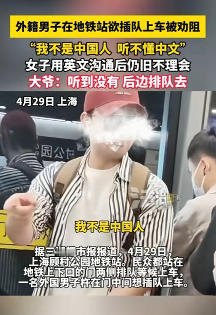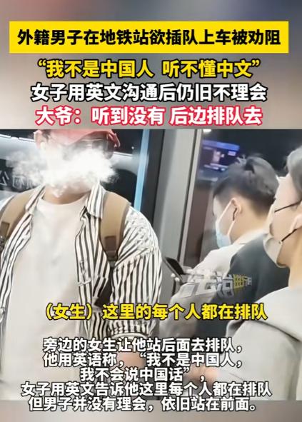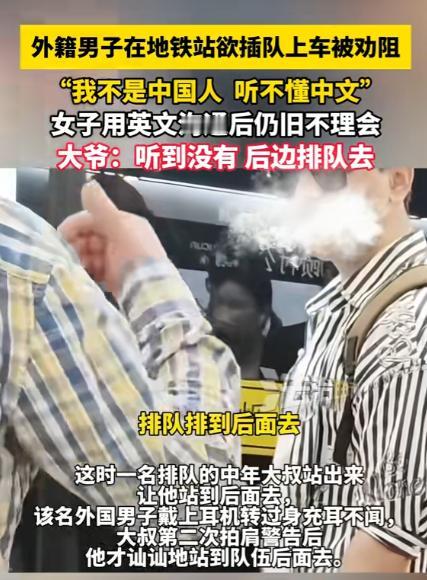 谁来了都一样!2025年一外国男子地铁插队,女生好心用英语劝说,他却冲女生说到:“我不是中国人,我听不懂中文”,一旁的大叔坐不住了。 地铁作为市民出行的重要交通工具之一,每天的人流量都非常大,因为客流量大,地铁站的秩序维护格外重要,站台地面上用醒目的黄色标线划分出候车区域,两侧排队候车、中间预留下车通道,是全国城市轨道交通通用的乘车准则。 常年往来的乘客早已习惯了自觉遵守规则,在地铁车门的两侧依次排开,留出中间的通道方便下车的乘客顺利通行。 2025年4月,站台上的队伍依旧排得整整齐齐,乘客们或是低头看着手机,或是轻声和身边的同伴交谈,目光都不自觉地望向列车驶来的方向。 站台的广播刚刚提示列车即将进站,大家都下意识地往两侧靠了靠,做好了先下后上的准备,就在这时,一名外籍男子从人群外侧走了过来,他背着一个休闲背包,脸上戴着墨镜。 没有看向两侧的队伍,也没有留意地面上的排队标识,径直走到了地铁车门的正中间位置站定,完全挡住了上下车的通道,和周围井然有序的队伍形成了格外明显的对比。 站在队伍前排的一位年轻女生最先注意到了这个情况,她看着男子站在中间的位置,担心会影响下车乘客的通行,便主动走上前,用温和的语气提醒男子,让他到队伍后面去排队候车。 原本只是一句再普通不过的善意提醒,却让这名外籍男子立刻有了反应,他转过头看向女生,用一口清晰的英文冲着女生说道,自己不是中国人,听不懂中文,言下之意便是不想理会女生的提醒,也不愿意遵守排队的规则。 女生听到这句话后并没有生气,她考虑到对方可能确实不熟悉国内地铁的乘车规则,便立刻改用流利的英文,耐心地向对方解释,不管是哪国的乘客,在这里都需要遵守同样的规则。 可这名外籍男子却像是没有听到一样,听完女生的英文劝说后,只是淡淡地瞥了一眼,既没有点头回应,也没有挪动脚步,依旧稳稳地站在车门中间,摆出一副无视劝阻的样子。 就在女生的劝说没有起到任何效果,外籍男子依旧我行我素的时候,站在队伍中间的一位中年大叔再也坐不住了,他从队伍里缓步走了出来,径直来到外籍男子的身边。 说道“听到没有,后边排队去。”简单直白的话语,带着不容置疑的态度,可这名外籍男子依旧不想配合。 他直接抬手戴上了耳机,把耳朵遮住,随后转过身去,背对着大叔和周围的乘客,摆出一副充耳不闻、完全不理会的姿态,想用这样的方式逃避劝阻,继续霸占着车门中间的位置。 看到对方刻意回避的样子,大叔没有选择退让,他上前一步,轻轻拍了拍外籍男子的肩膀,这一次的动作带着明确的警告意味,再次示意他走到队伍后面去排队。 连续两次的明确劝阻,加上大叔坚定的态度,让原本态度强硬的外籍男子再也无法无视,他慢慢摘下耳机,转过头看了看大叔。 又环顾了一圈周围整齐的队伍和乘客们的目光,脸上露出了些许讪讪的神情,没有再继续狡辩,也没有再做出抗拒的动作,默默挪动脚步,转身走到了队伍的最后方,老老实实站在那里排队候车。 随着这一段小插曲的结束,站台很快又恢复了原本的平静,乘客们没有过多的议论,也没有围拢过来围观,大家的注意力重新回到即将进站的列车上。 没过多久,地铁列车缓缓驶入站台,车门平稳打开,下车的乘客顺着中间的通道有序走出,候车的乘客则按照两侧的队伍依次上车。 整个上下车的过程流畅又高效,没有出现任何拥挤和混乱的情况。刚才插队的外籍男子,也跟着队伍的末尾,顺利登上了列车,融入了普通乘客的行列之中。 地铁作为城市公共交通的重要组成部分,是展现城市文明的一扇窗口,每一条候车队伍、每一次有序上下车,都是文明素养的直观体现。 在顾村公园站的这个普通傍晚,没有激烈的冲突,没有夸张的情节,只是一次再平常不过的秩序维护。 年轻女生用双语耐心劝说,展现出的是包容与善意,中年大叔果断站出来劝阻,守护的是公共空间的规则,周围乘客默默遵守秩序,传递的是对文明的认同。 无论来自哪个国家、说着哪种语言,只要身处公共场合,遵守当地的公共秩序都是最基本的准则,这一份不分国籍的规则意识,也让城市的出行环境变得更加和谐有序。 对于这件事,您有什么想说的吗?欢迎评论区留言讨论。 信源:法治进行时2025-04-30——《外籍男子在地铁站欲插队上车被劝阻,"我不是中国人听不懂中文”女子用英文沟通后仍旧不理会,大爷:听到没有后边排队去》