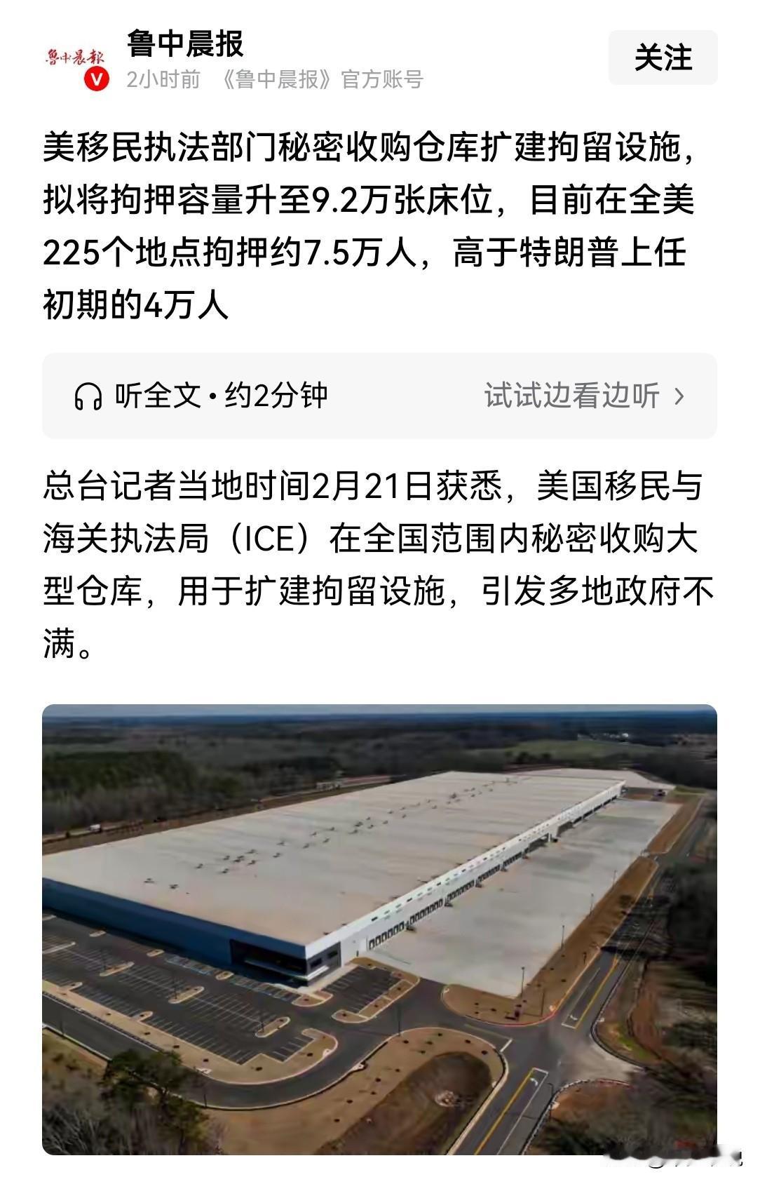 美国秘密建“集中营”,监狱不够用美国ICE收购仓库改拘留所 央视新闻报道,美国移民与海关执法局(ICE)正在全国范围内收购大型仓库以用于扩建拘留设施,从目前的消息来看ICE拟在全美225个地点建设拘留设施,床位高达9.7万张,可以同时拘留7.5万人。 这不是妥妥的现代集中营吗?看来在美国的人要开始紧张了。