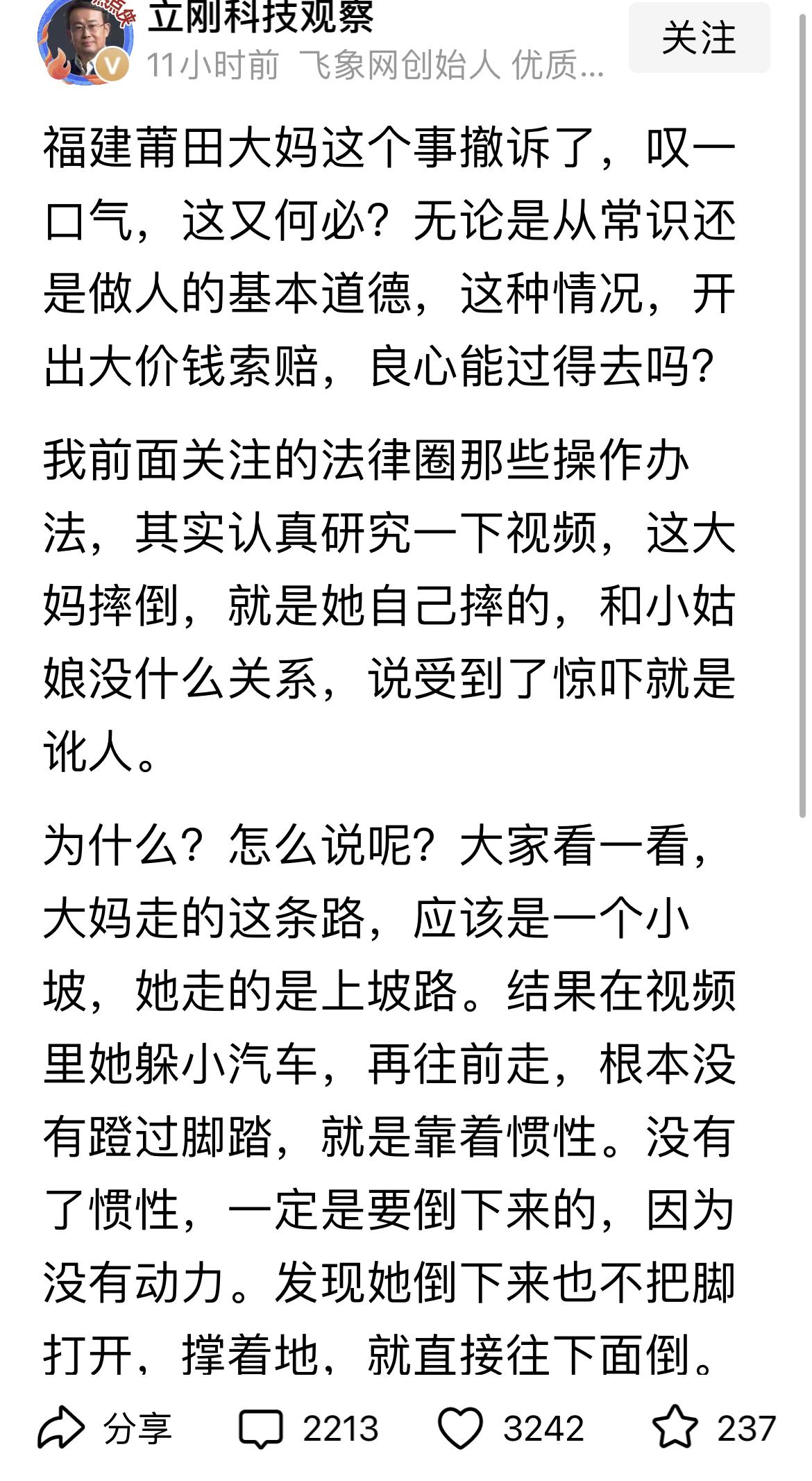 索赔22万的大妈撤诉了!大抵上小女孩和大妈只是时空伴随者! 知名媒体人分析视频,结论也是:大妈就是自己摔倒的,和小姑娘无关! 来看看,骑车小姑娘出现在转角的0.01秒,这时大妈骑车在车上,重心已经偏左,要摔倒的样子,然后她下意识地转了自行车龙头,但是左脚没有踩地,而是原地和车倒地。 如果,这里是个小坡的话,大妈忘了踩脚踏,确实就容易摔倒。 说起来,小女孩就是我经过你走的路,算不算相逢。虽然不是喜相逢!