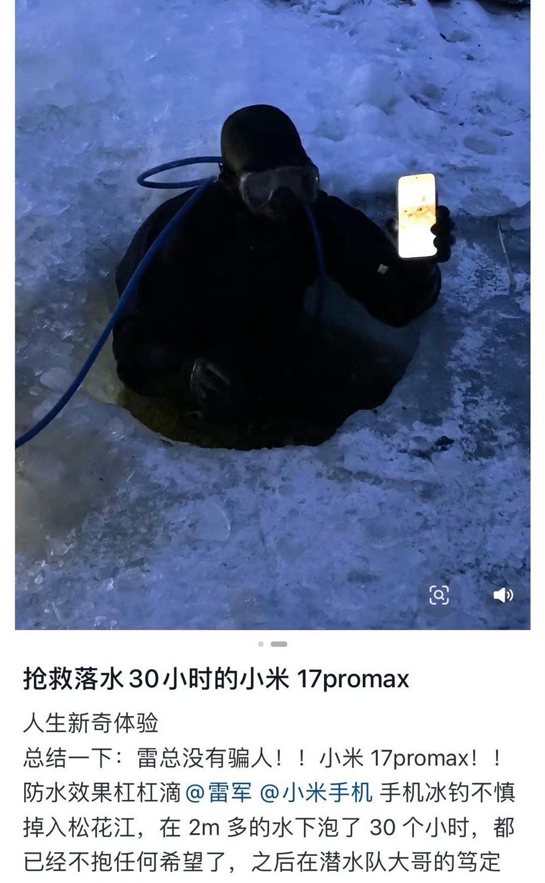 小米17Promax,在2米多的水下泡了30个小时,依然能完美使用!大家要知道!水深每增加一点,水压是呈线性增长的2米深的水压对于手机密封圈和听筒膜还有接口处纳米涂层的考验很大!而小米抗住了,说明结构件的公差控制和粘合剂的抗老化性非常牛逼!而且我估计是在密封设计上做了冗余处理,甚至可能上了更高级别的压力阀技术!