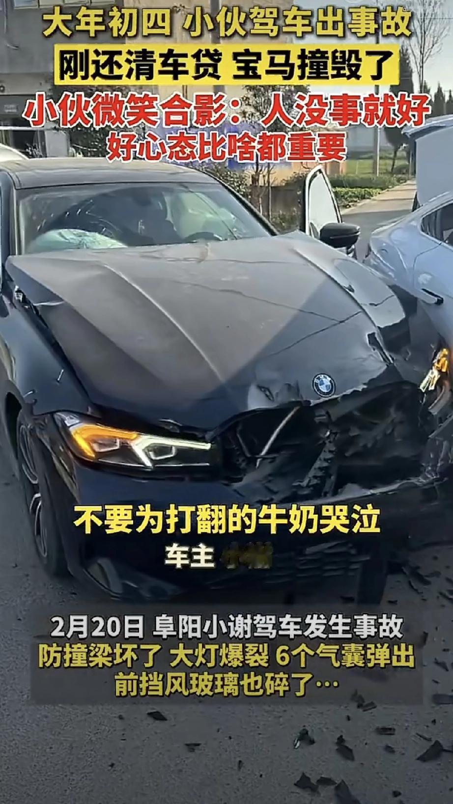 刚还清车贷宝马就撞报废,小伙却笑着合影:心态好的人,运气都不会差 这两天,安徽阜阳的一位小伙子小谢,因为一张特别的“合影”火了 。 事情是这样的:2月20号早上,小谢开着他的宝马车出门,结果发生了交通事故,跟一辆比亚迪撞上了 。从现场照片看,撞得确实不轻——车头稀巴烂,防撞梁都露出来了,大灯碎了一地,最吓人的是,车里6个安全气囊全弹了出来,前挡风玻璃也裂成了蜘蛛网 。 懂车的人一看就知道,这车修起来代价巨大,基本上接近报废状态了。 更扎心的是啥?这辆车,小谢一个月前才刚刚还完贷款 。对很多普通人来说,还完车贷那一刻,这辆车才算真正是自己的,心里那块石头也算落地了。结果刚松口气,车没了。 你说这事搁谁身上能受得了?估计大多数人脑子都嗡的一下,后悔、愤怒、自责各种情绪往上涌。 但小谢的反应让人意外极了。 他没捶胸顿足,也没在现场跟谁红脸,反而做了一件特别的事——他走到车前,笑着跟这辆面目全非的车,合了个影,还发到了网上 。 照片里他笑得挺自然,配文是那句被转发上万次的话:“不要为打翻的牛奶而哭泣。” 接受采访的时候小谢说得更实在:“事已至此,我总不能坐在那里哭吧,万幸人没事,有个好心态比啥都重要。” 这话听着简单,但特别在理。 有网友评论说:“全损人还没事,赚大了!” 话是糙了点,但理不糙。还有人说:“伤心的是努力打拼的车没了,开心的是自己没事,还可以继续挣钱买车。” 最逗的是评论区有人替银行担心:“事件里唯一最让人担心的,恐怕是贷款银行了。” 虽然是玩笑,但也说明大家都看出来了——只要人好好的,其他的都是身外之物。 这让人想起几年前恩施那位奔驰车主。车撞烂了,他在现场喊的是“活着真好” 。两个人隔着千里,说着同一种方言:物的损失是句号,人的平安才是逗号,故事还能继续写。 我们这一代人,有时候确实容易把顺序搞反。给车买全险,给自己买裸奔;计算油耗精确到小数点,体检报告却拖着不看 。小谢这辆宝马虽然报废了,但换个角度想,它也给我们提了个醒:你精心维护的从来不是那台机器,是你还能好好生活的这身皮囊。 小谢说,不要为打翻的牛奶而哭泣 。 是啊,人这一辈子,其实就是不断地在和各种各样的损失打交道。损失了钱,损失了东西,损失了时间。如果你死死盯着那个窟窿看,心里就会一直漏风。但只要你告诉自己,只要人还在,只要身体没垮,其他的都能慢慢挣回来,那眼前这道坎,也就没那么难过了。 就像网友说的:以这个心态处事,很快就会再开上7系的 。 祝小谢早日开上新车,也祝所有看到这个故事的人,平安比啥都强,心态好比啥都重要。 宝马事故 新车首撞名场面 宝马大事故