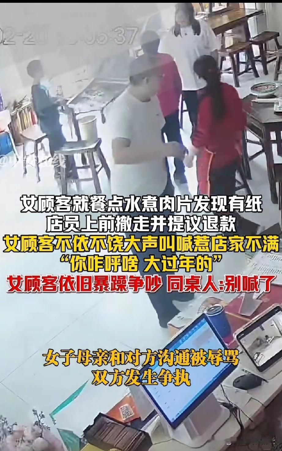 为什都在埋怨女孩呢?我觉得她做的对。事情是这样的,一家人在餐馆里吃饭,女孩在水煮肉片里吃出了纸,她就招呼服务员过去,说菜里有纸。 服务员态度还算可以,她说我不知道,那我给你退了,行吗?女孩没回应,说你们尝尝口味,是不是纸? 这时老板突然发话,嫌女孩声音太大,大过年的咋咋呼呼的,影响他的生意。 女孩同桌的人也让她不要喊了,女孩突然就破防了,她说怎么是我咋呼了,你们怎么都埋怨我?是我的问题吗? 然后老板和饭店的其他人就过去了,其中一个女子摔了餐盘,两边就吵起来了。 有网友认为,女孩太得理不饶人,既然人家愿意退了,还咋咋呼呼的,怪不得同桌的人都看不下去了。 可是我觉得女孩做的没错,菜里有只有纸,可能是二次回收加工上菜,饭店里的人只说给退了,但是没有道歉,没有说明为什么有纸,女孩想弄个明白,难道不对吗? 顾客在你们饭店里吃出了问题,老板不是先得道歉吗?怎么避重就轻,反而嫌弃顾客声音大,还有同桌的人不帮她,也帮着外人埋怨她,我觉得女孩心里肯定很委屈,所以才会爆发吧。 对于这件事,你怎么看呢?