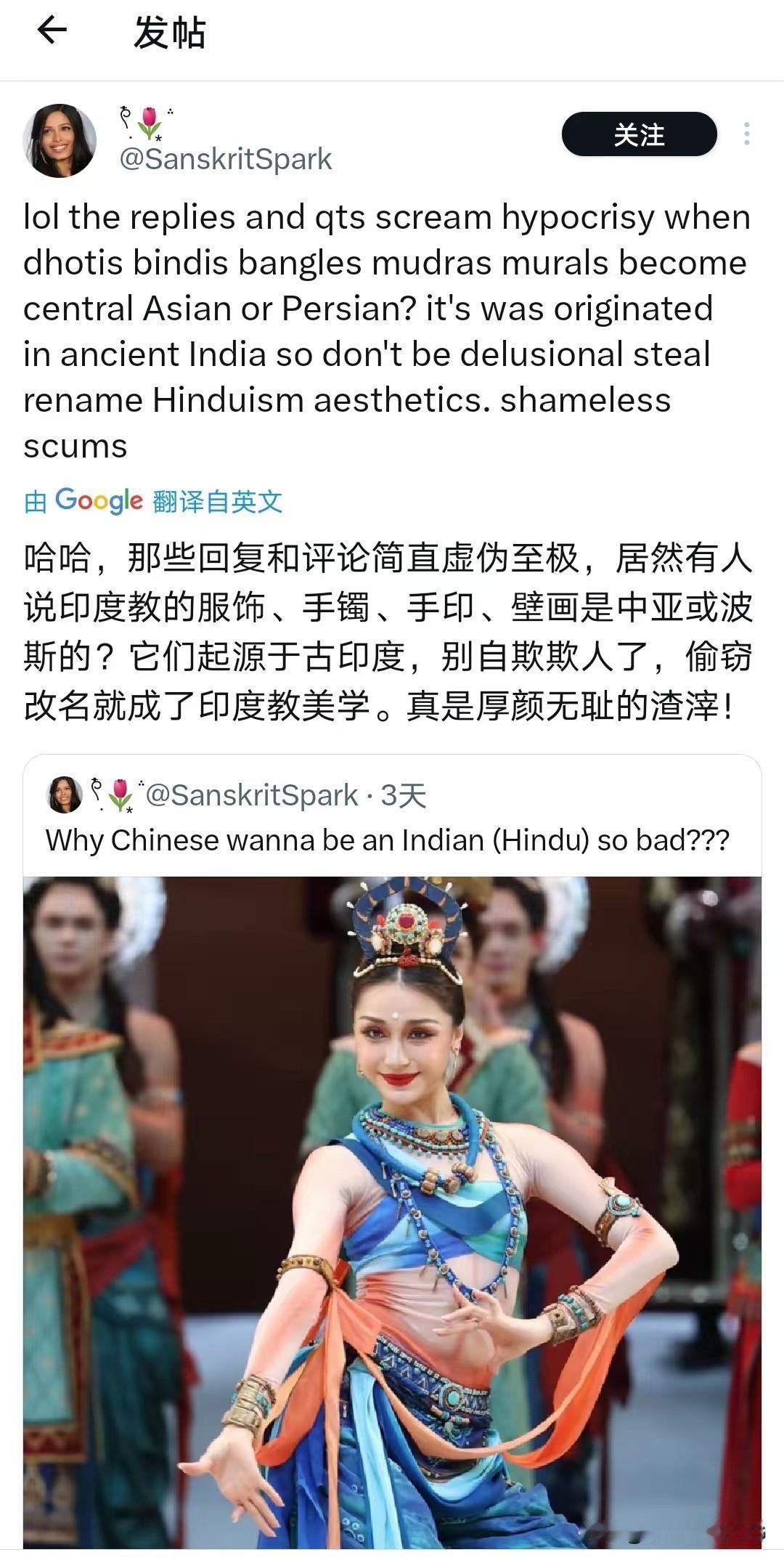 眼馋中华文化,印度加入到了越南、韩国的行列…[捂脸] 印度人看了春晚后,非的说我们抄袭印度的服饰和舞蹈,还说印度审美的优势是独一无二的,所以连中国都想学。 说春晚中国古龟兹舞《丝路古韵》抄袭印度的印度人可真搞笑,你们判定抄袭印度的证据是因为舞蹈演员同样也长了两条腿吗…[大笑][大笑][大笑] 朋友们,你们对此事怎么看? 欢迎大家在评论区探讨,留言…[送心]