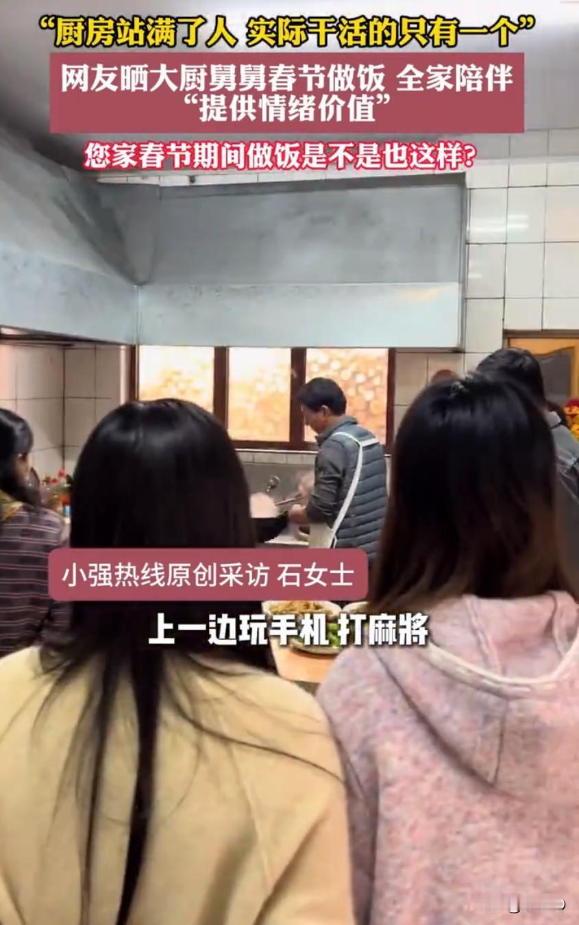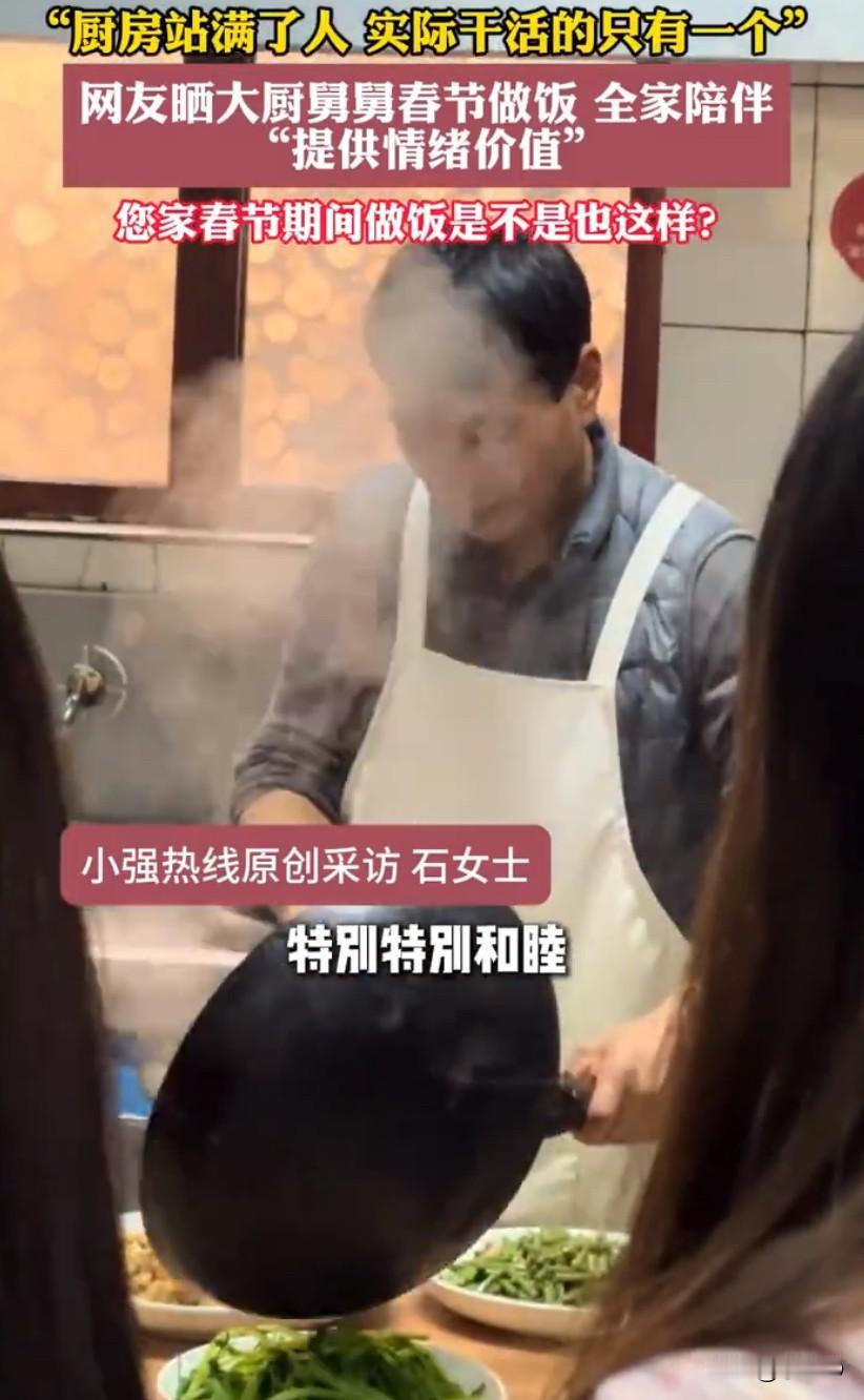 这个话题最近火遍全网,辽宁鞍山石女士分享的一段家庭日常,看笑了无数网友,也把大家的思乡情绪瞬间拉满。视频里没有大鱼大肉的排场,也没有精心布置的场景,却藏着春节最动人的团圆模样,难怪会被网友调侃“像极了骑手在等出餐”。 石女士的老舅是这次家宴的“灵魂大厨”,人家可不是普通的家庭煮夫,而是开农家乐的专业厨师兼老板,掌勺春节大餐对他来说就是“专业对口”。按照很多家庭的过年惯例,大厨在厨房忙得脚不沾地,其他人早就在客厅组团玩手机、打麻将了,可石女士家却完全反着来。 当天老舅系上围裙站在灶台前忙碌,一大家子人没有一个走散,全都挤在不算宽敞的厨房里,把这位大厨围了个水泄不通。小小的空间里挤了近十口人,大家各司其职又互不打扰,有人顺手帮着择菜递调料,有人靠在门边和老舅拉家常,还有几个小辈眼巴巴盯着锅里的菜,就等着第一时间尝鲜。 老舅一边颠勺翻炒,一边时不时回头和家人搭话,锅里的菜香混着大家的说笑声,把厨房的温度烘得暖暖的。石女士说,他们家一直特别和睦,过年团聚的意义就是在一起,所以没人愿意躲去客厅刷手机,大家都觉得待在厨房陪着老舅,才是最踏实的团圆。 这段视频被发到网上后,网友们的评论区直接炸开了锅,最火的就是那句“像极了骑手在等出餐”,还有人调侃“这是全员监工,就等大厨出餐”。玩笑归玩笑,大家更多的还是羡慕,不少网友留言说,现在的过年聚会,常常是一家人坐在一起,却各自抱着手机沉默,这种放下电子产品、全员陪伴的画面,实在太难得。 其实过年的意义,从来都不在于吃多贵的菜,而在于这份有人为你下厨、有人陪你等候的温暖。老舅在灶台前的忙碌,是对家人的疼爱;全家在厨房的陪伴,是对这份付出的回应。没有刻意的煽情,只有最朴素的烟火气,这小小的厨房,装下的不仅是一大家子的期待,更是春节最该有的样子。