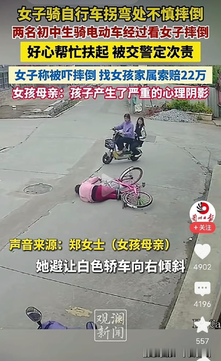 支持孩子们无责,并且是学雷锋做好事。她的骑行减速刹车是前面轿车导致的,后来停车不稳摔倒与前面的骑行的2个孩子无关。无论孩子们出现与否,老人都注定会摔倒。诬告两个扶起老人的孩子,真是丧尽天良。