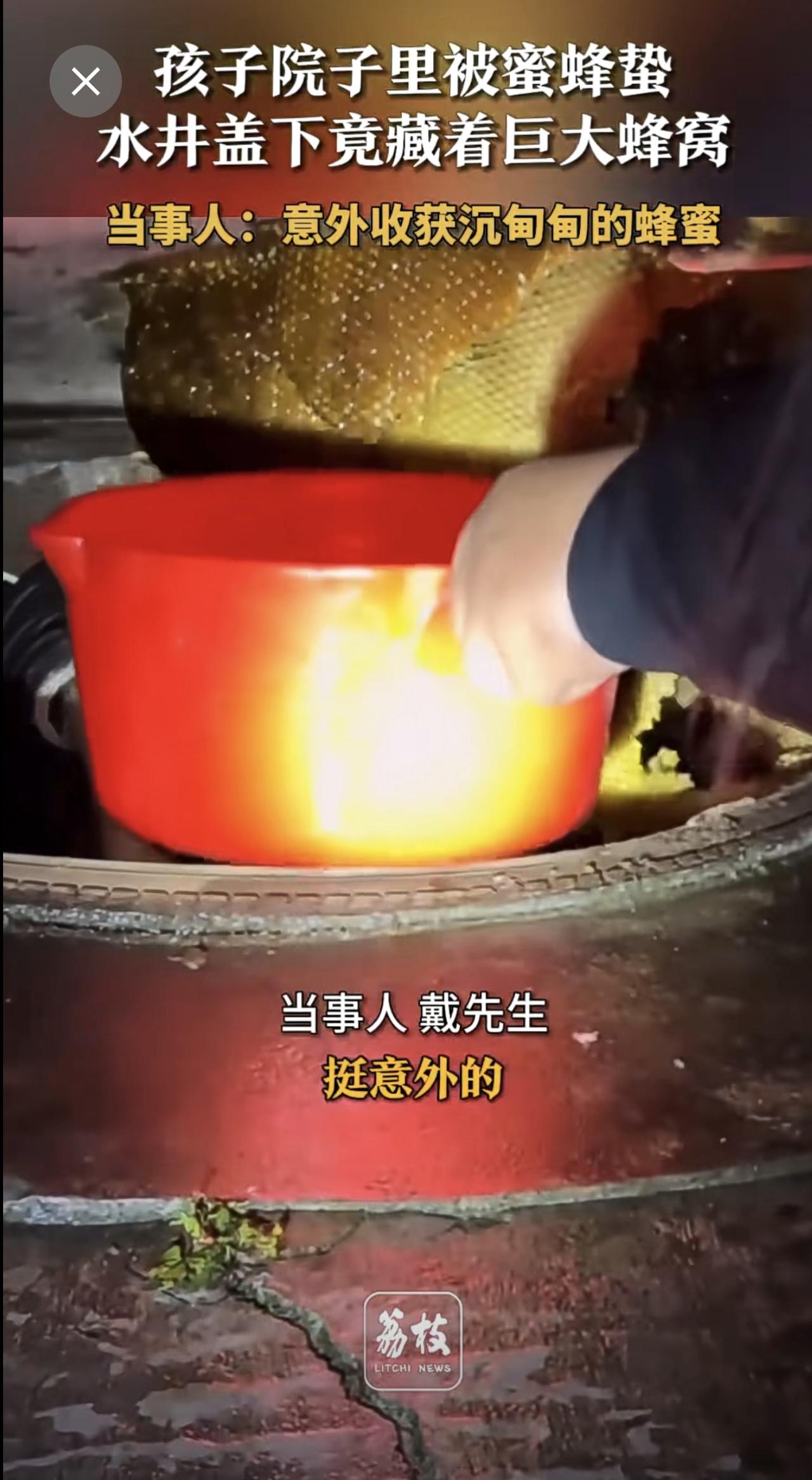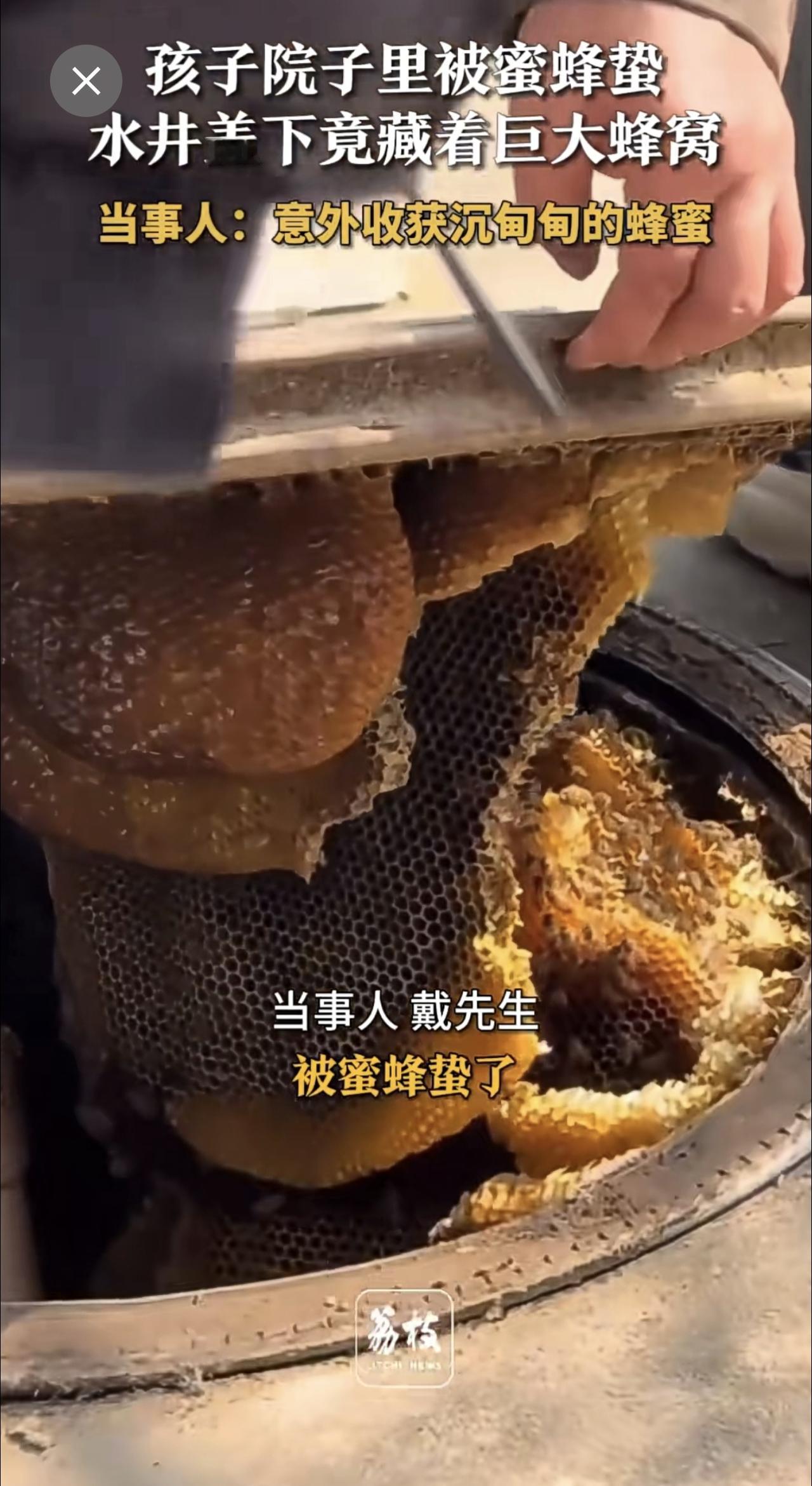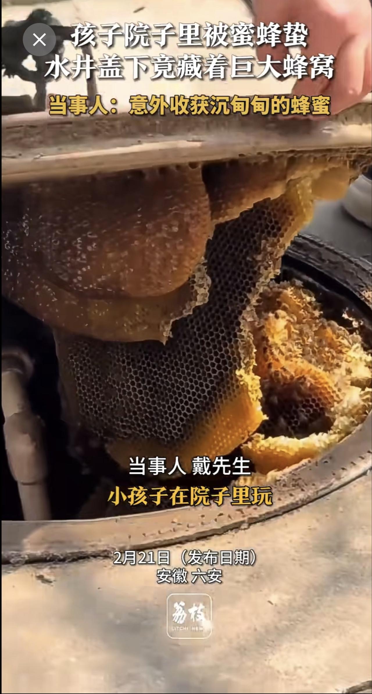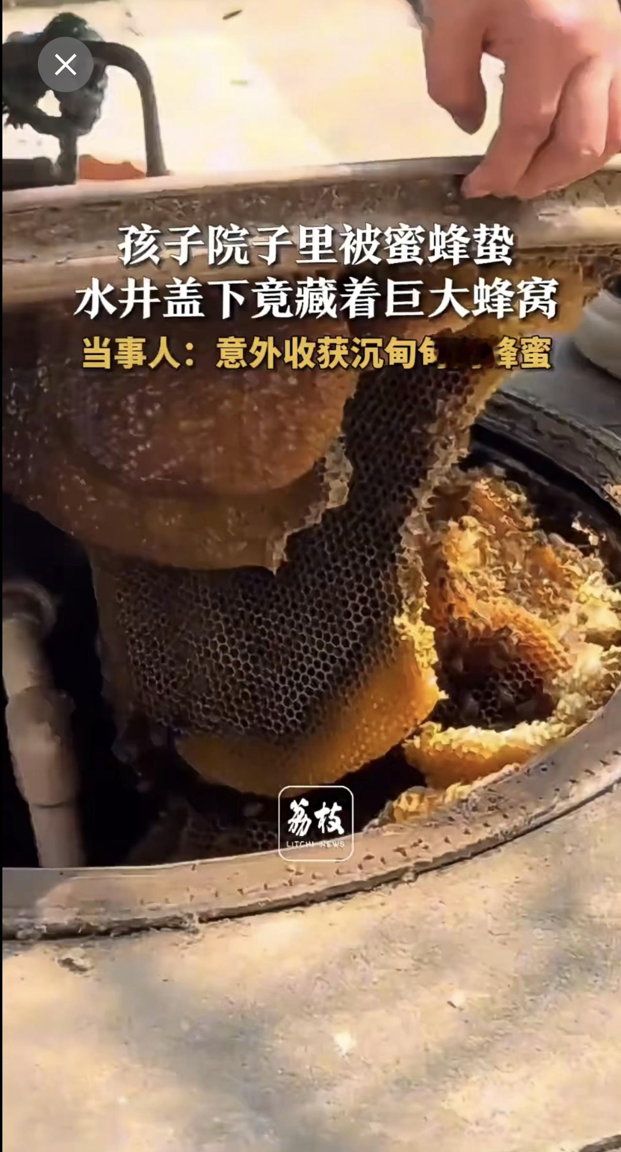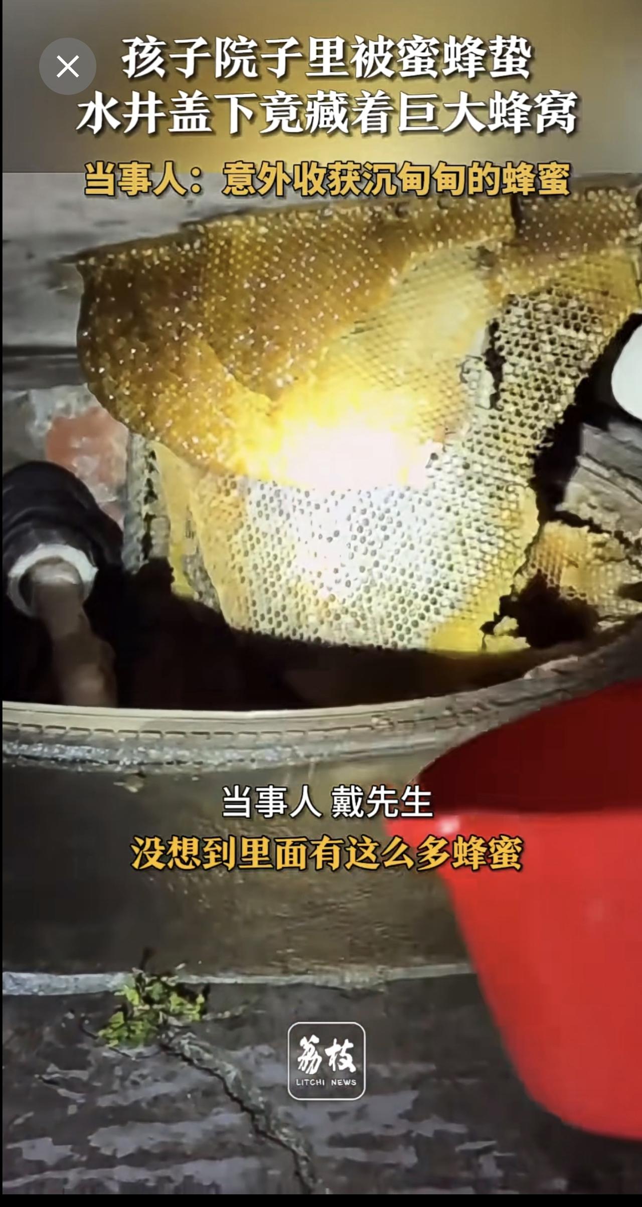 孩子在院子被蜜蜂蛰,掀开井盖竟发现超大蜂窝,当事人:意外收获满满蜂蜜。蜂蜜蜂窝意外之喜 (新闻来源:荔枝新闻|编辑:姚硕 | 初审:张孟媛| 复审:范思瑶 | 终审 :刘鹏 | 校对:周正)