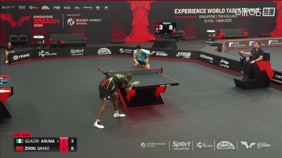 “七号”周启豪智取尼日利亚阿鲁纳! WTT新加坡大满贯赛1/32决赛,国乒率先出场是“七号”周启豪! 尼日利亚老将阿鲁纳,步伐灵活,扣球势大力沉! “七号”周启豪,小巧玲珑,左右开攻,智取阿鲁纳! 尤其是体现在关键的第3局,4平直咬至8平!11-9拿下,2:1领先! 不可硬攻,只可智取! “七号”周启豪3:1(6-11;11-4;11-9;11-6)逆转胜阿鲁纳! 周启豪太棒了! 周启豪马年开门红! 国乒马年首战开门红!