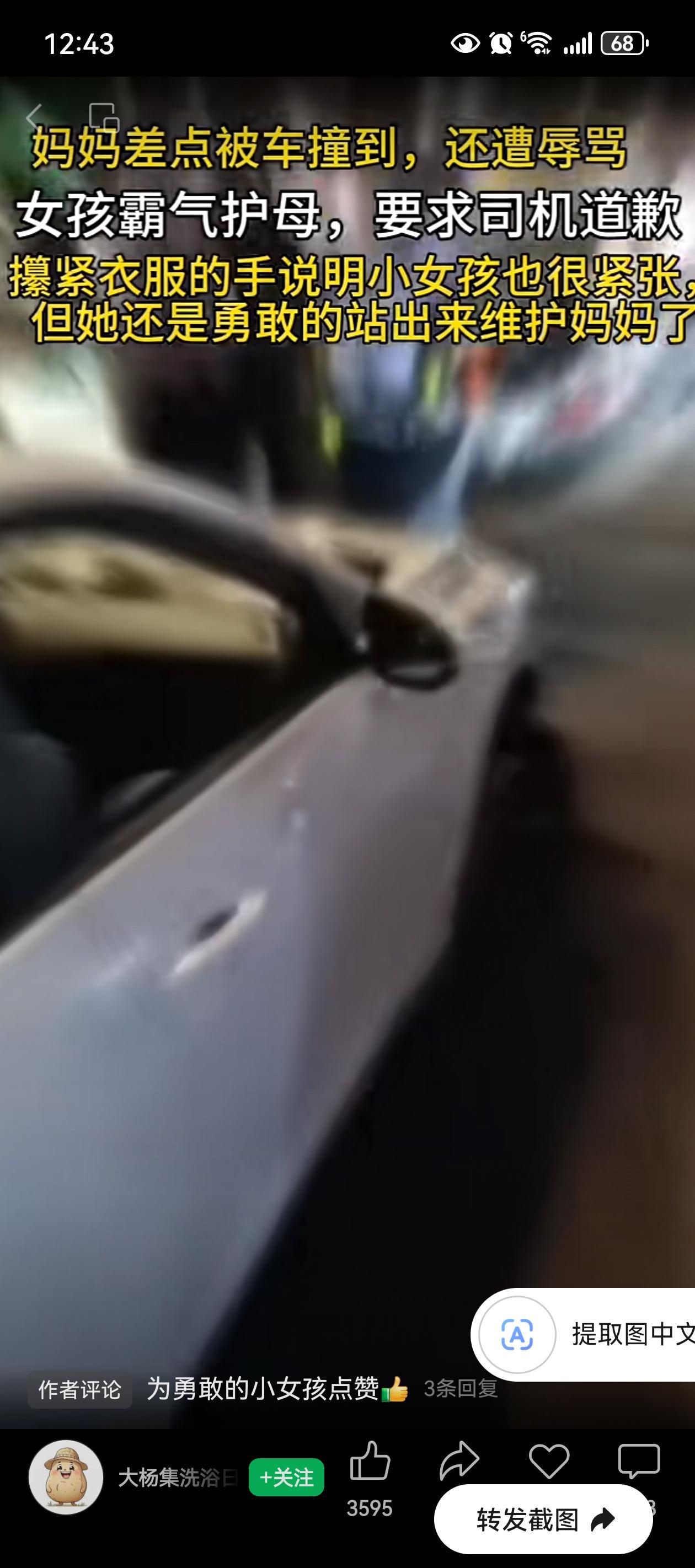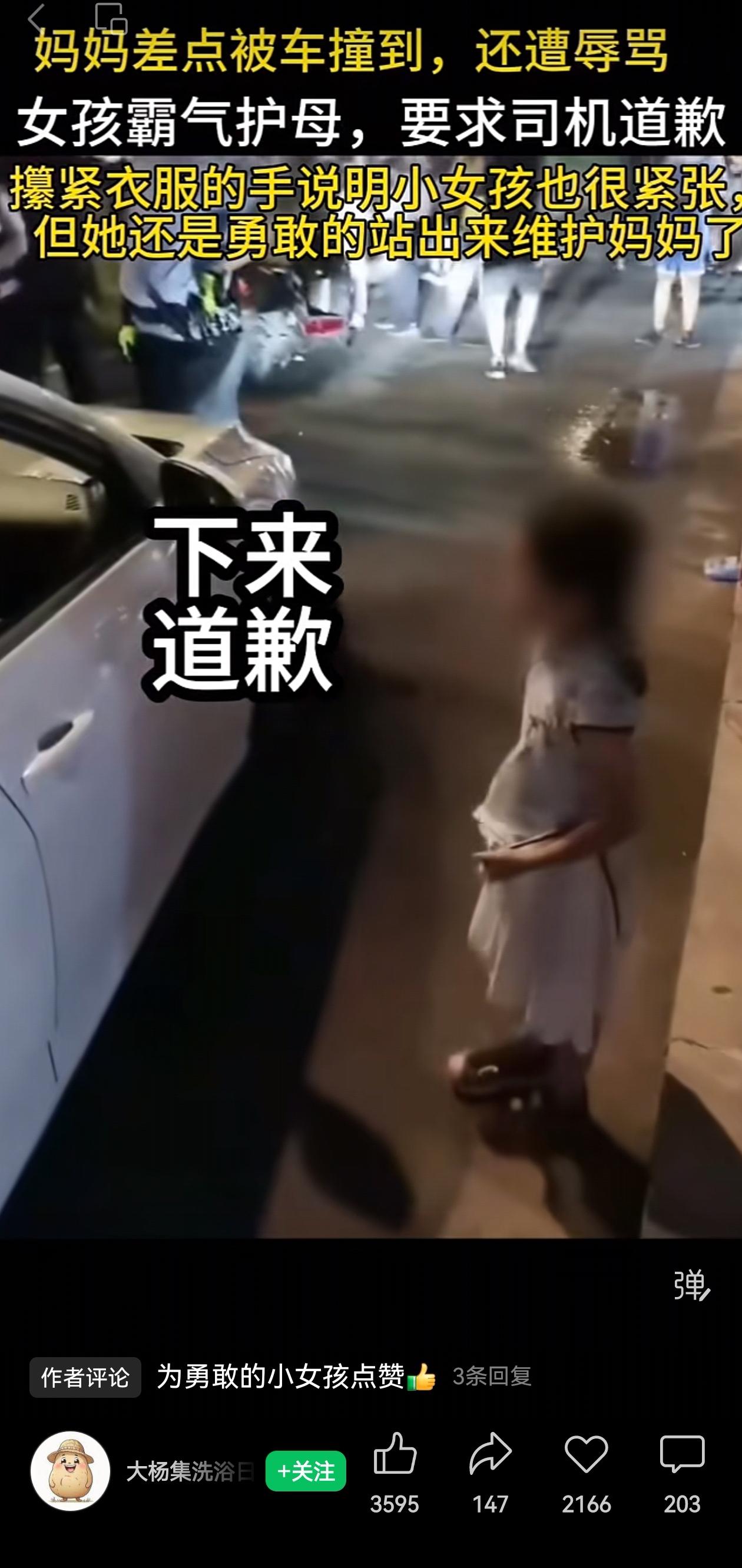 小孩姐好样的!一个妈妈带着女儿走着,突然有辆车差点撞上她们。母女俩被吓着后,司机不光不道歉,还对着妈妈破口大骂,态度特别嚣张。 妈妈被骂懵了,还没来得及反应,旁边那个小小的身影直接冲上去了。 小女孩走到车旁边,对着驾驶座上那个高大的男司机喊:“我让你下来道歉!”说实话,视频里能明显看出来她在害怕——小手攥着衣服攥得紧紧的,整个人都是绷着的,但她就是没往后退一步,就那么坚持着! 看到那个攥衣服的动作,真的有点鼻子发酸。她肯定是怕的,这么小的孩子,面对一个发火的成年人会不怕吗? 但在她眼里,妈妈被欺负了,欺负人的人必须道歉!脆弱又勇敢! 平时都是妈妈护着孩子,但关键时刻,这个小姑娘用自己的方式告诉妈妈:你也有我。 那个攥紧衣服的小手,写满了害怕,却没有后退半步。平时是妈妈护她,这次是她护妈妈。 小小年纪能压过恐惧去撑腰,这种发自本心的爱,真的比什么都珍贵。 小孩姐,好样的! 信息来源:大杨集洗浴日化用品