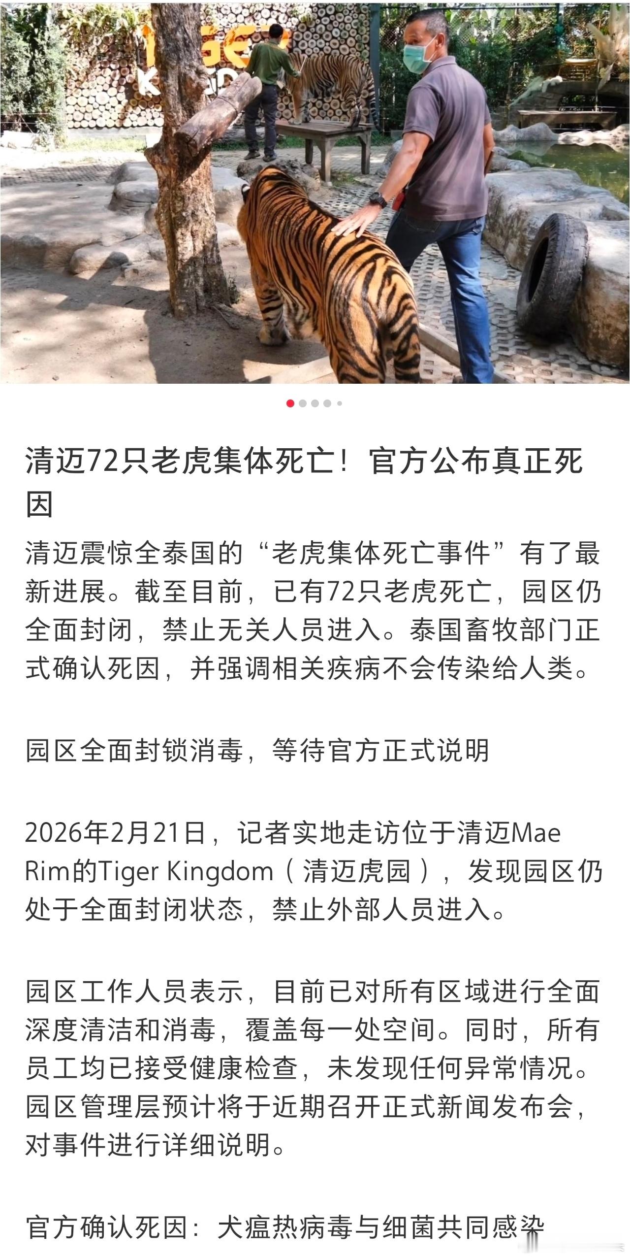 泰国官方通报清迈72只老虎死亡老虎的抵抗力这么差吗?竟然死了72只。