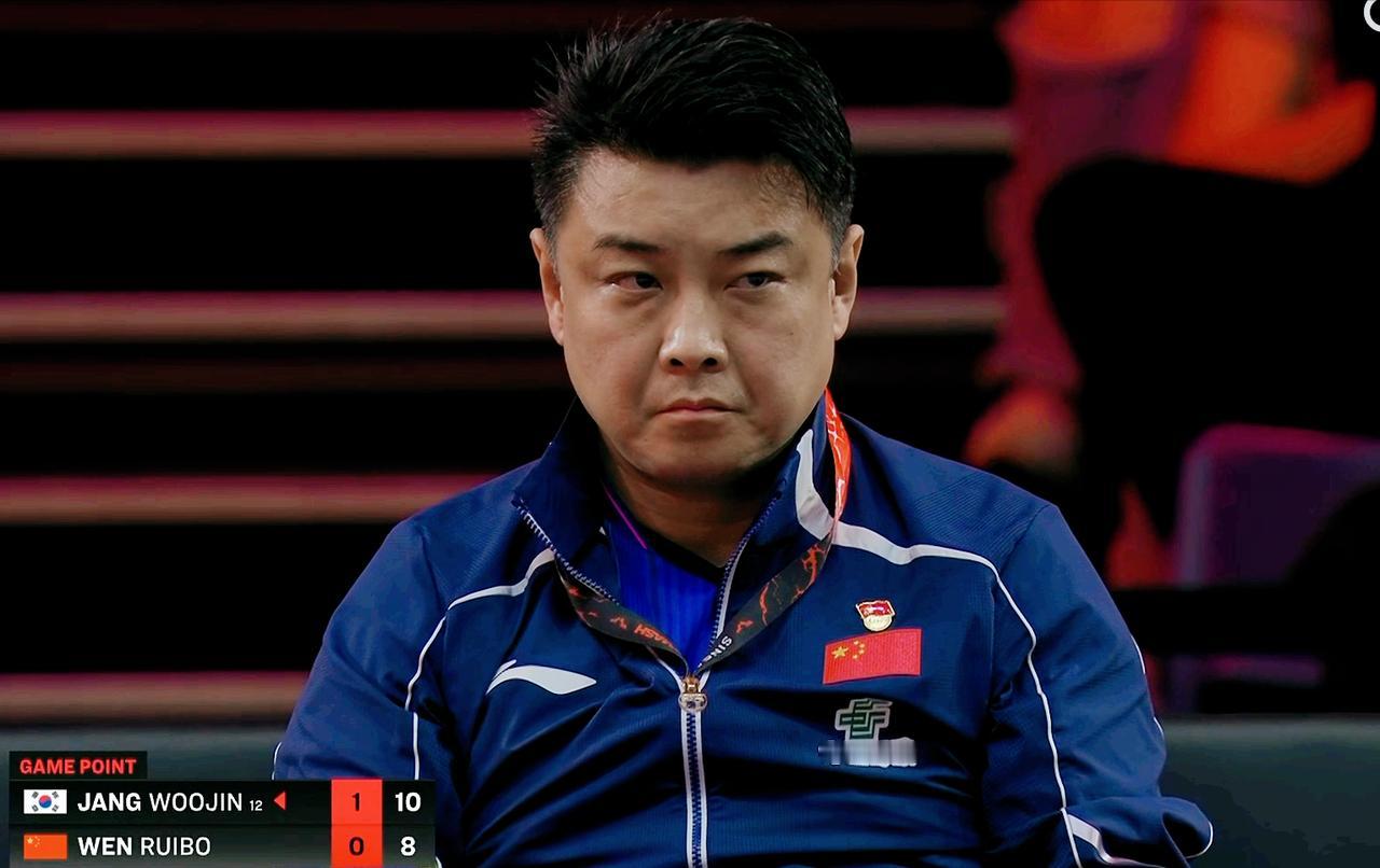 坏了,温瑞博被张禹珍压着打, 侯英超急了, 说:不要侧身,不要侧身! 第一局 温瑞博4:11输给了张禹珍 第二局 温瑞博有些乱, 张禹珍3:0开局, 随后温瑞博追到了3:3。 随后张禹珍靠前三板, 连得5分, 8:3领先温瑞博。 9:5继续领先。 小温一个机会球拉丢, 张禹珍10:6拿到局点 11:8拿下, 王皓气坏了!