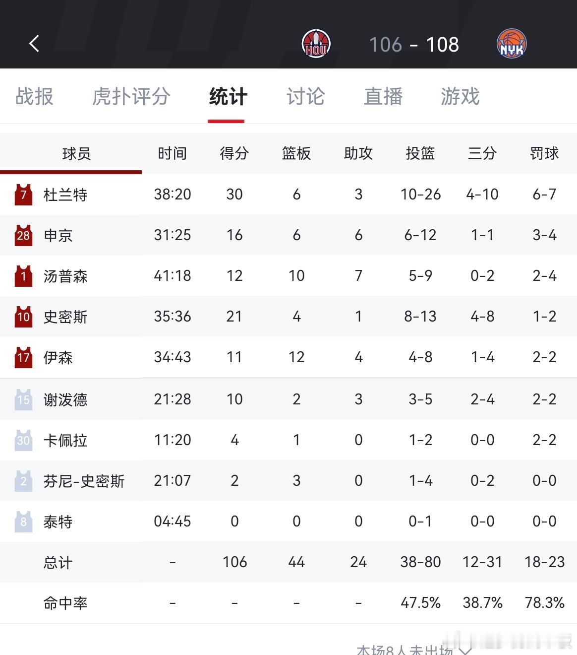 尼克斯108-106末节逆转战胜火箭!!