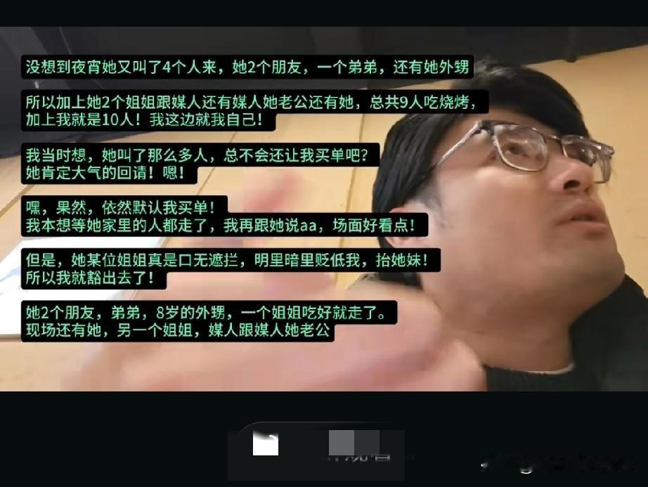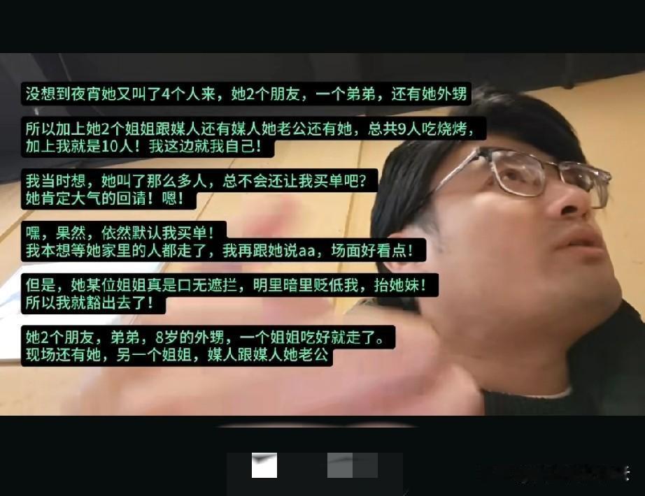 湖南,男子被媒人介绍去相亲,他到那里时,相亲对象和两个姐姐已经在饭店点上菜吃上了。男子很生气,但碍于媒人是父母的熟人,就没好意思发作。 这顿饭,相亲女生带了她的两个姐姐,媒人也带了她的丈夫。男子本来想说aa的,但相亲女生说等晚上一块吃烧烤,男子以后女生会请客,这顿他就买单了。 结果到了晚上,相亲女生除了和她姐姐,又叫了四个人,还有她外甥,是个小孩。说是多叫点人给她参谋参谋。男子看女生吃完饭没有结账的意思,就建议aa。 结果遭到女生和姐姐,还有媒人的连怼,说男子格局太小,不真诚,怪不得找不到对象。这样的男人没人要等等。 男子还是坚持只付了自己的那份。回家后,受到媒人向他父母的告状,说人家本想考验他的,他太小气,没看上他。 男子姐姐和父母也埋怨男子太小气了,为了一顿饭钱,搞砸了相亲现场。 你们觉得男子做的对吗?相亲的时候必须男方买单吗?