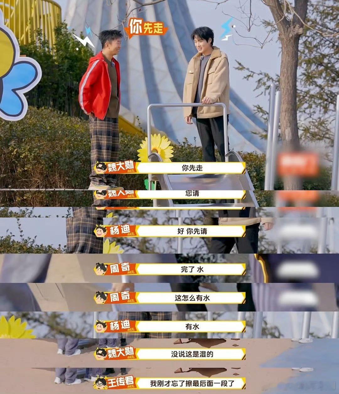 魏大勋魏大勋一屁股坐水里笑不活了,魏大勋滑滑梯直接坐进水里,全程又懵又好笑,王传君忘了清积水,可怜大勋当场湿身,综艺效果拉满。