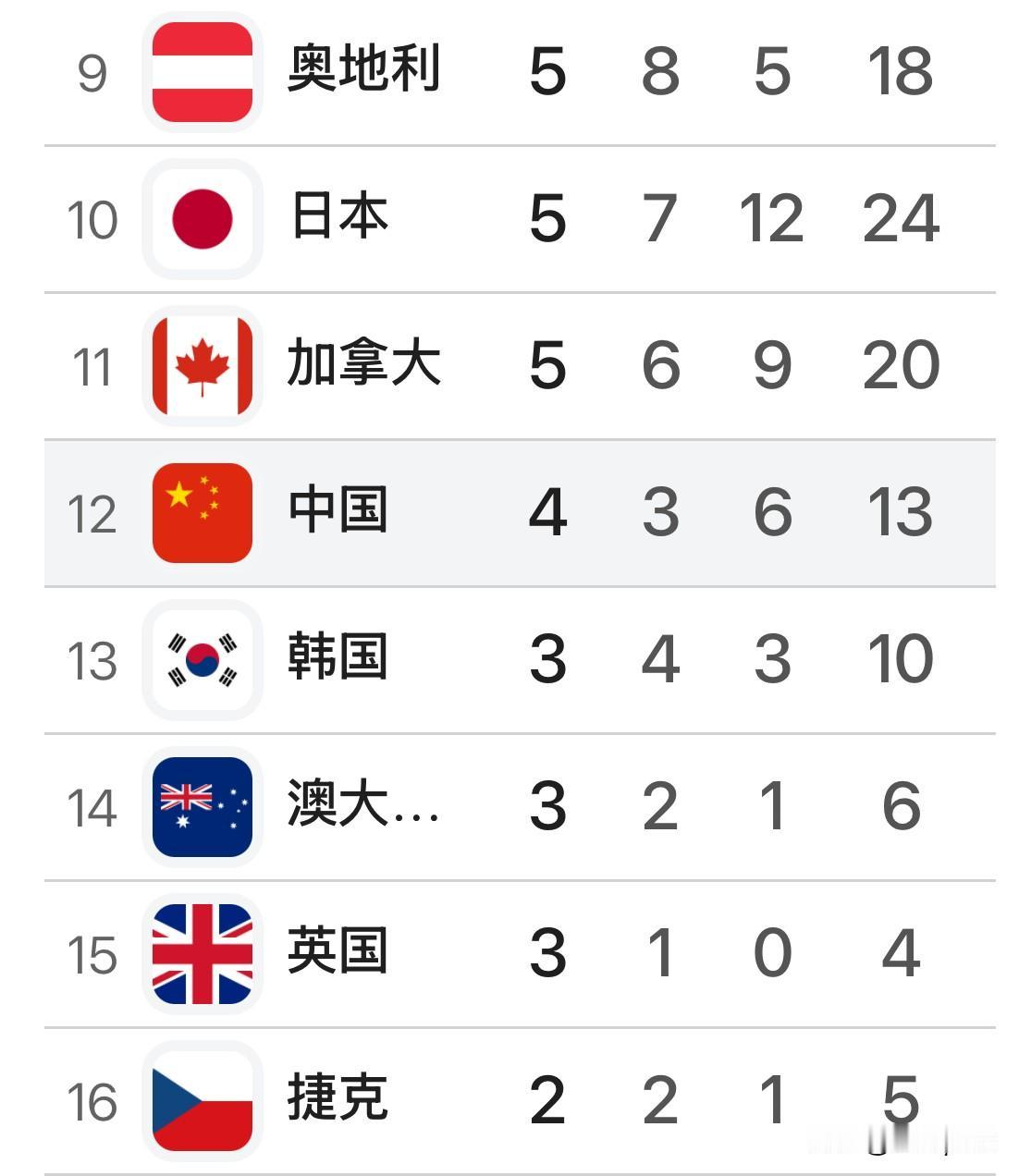 2月22日冬奥会奖牌榜,中国队排名第12,超过日本已无希望。从奖牌分布上,中国队更为均衡,未来仍有较大成长空间。 米兰冬奥会即将落幕,116枚金牌已经决出111枚金牌。剩下5枚金牌中,谷爱凌、李方慧等4名中国选手仍有机会冲击自由滑雪U型池比赛的金牌。这一比赛因为大雪而延期,如果雪况继续不理想,将采用预赛成绩决定奖牌,那预赛排名第二的李方慧可能为中国队增加一枚银牌。 即便是获得金牌,中国队在奖牌榜上也无法超过获得24枚奖牌的日本队了。此次冬奥会,东亚三国的比拼中,中国队将排名第二,领先韩国队。 如果从奖牌的项目分布来看,中国队在4个大项中获得了奖牌,而日本队在5个大项获得了奖牌。韩国队仅在2个大项获得了奖牌。 在总奖牌榜上,挪威队排名第一,遥遥领先。但从项目分布上,美国队在11个大项获得了奖牌,比挪威的8个大项更为均匀。比较奇葩的是荷兰队,尽管在金牌榜上排名第三,超过了东道主意大利队,但荷兰队的所有奖牌都来自两个项目:速度滑冰与短道速滑。
