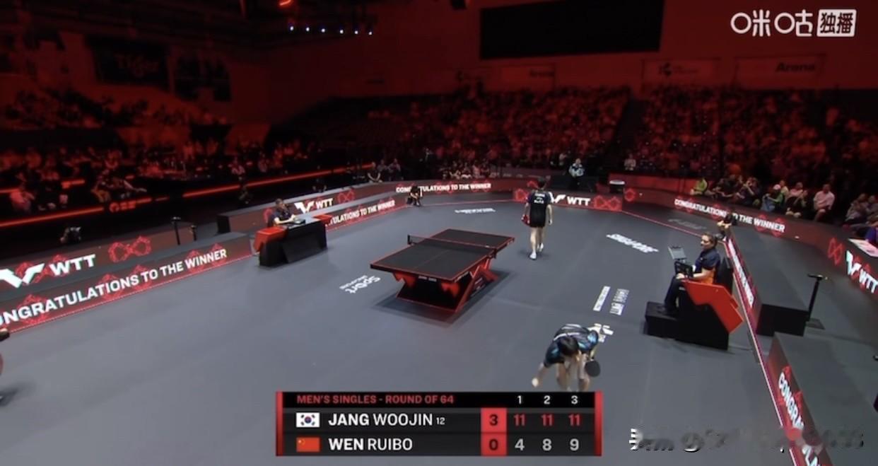 温瑞博0-3张禹珍,止步新加坡大满贯首轮, 王皓脸都是黑的,很无奈。 温瑞博被张无忌零封, 今天一侧身就丢球,并且近台确实需要提升,退台之后,张无忌的球都不好打。 整场比赛,张无忌近一半的分是温瑞博主动送的,都是自己的失误。 王皓喊暂停的时候,直接说:“战术没问题,但你老失误,这个你有什么招啊” 新年,皓哥的第一次场外,就黑脸了。 小温,还需要继续磨练,每个人都是这样过来的,不经历,就不会有沉淀。 好好总结,未来的路还很长,继续加油, 下个赛场见!