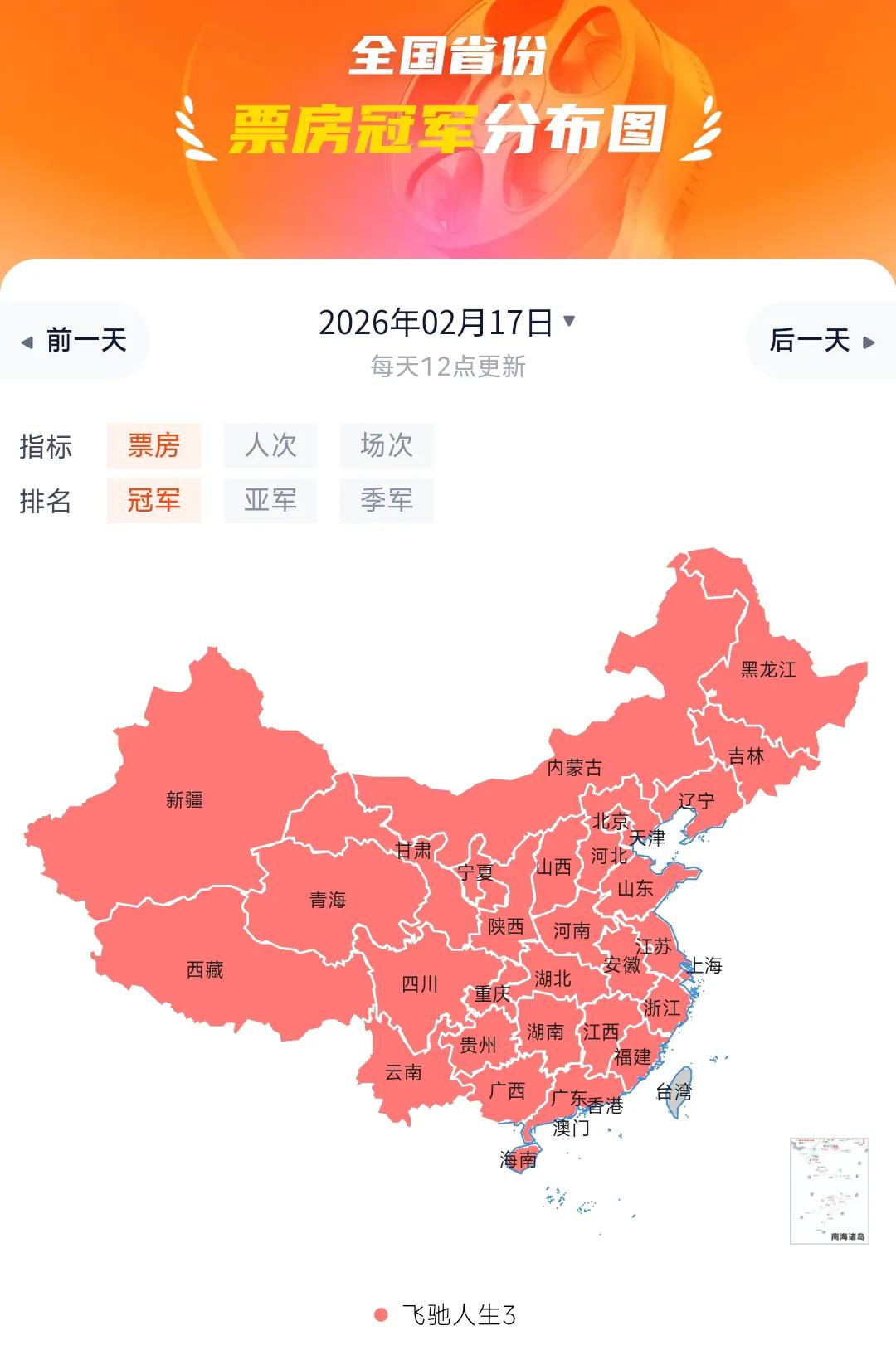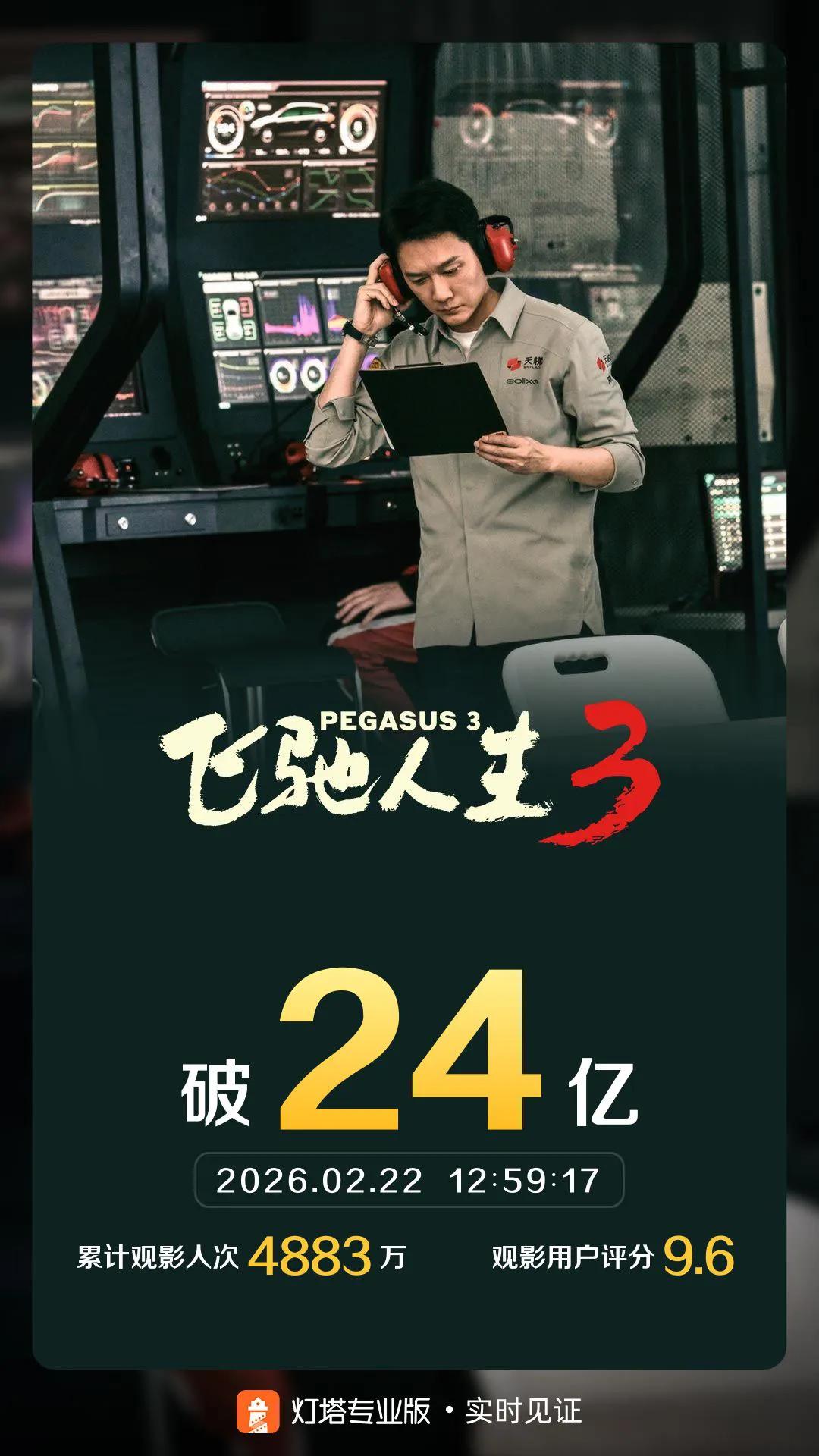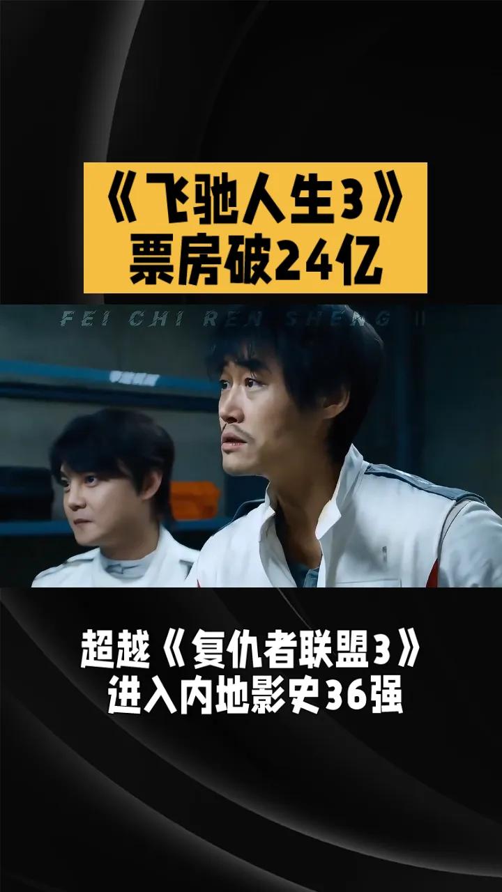 《飞驰人生3》票房破24亿,超越《复仇者联盟3》。 由韩寒执导,沈腾、尹正、黄景瑜、张本煜领衔主演,魏翔、沙溢、范丞丞、孙艺洲主演,段奕宏特邀主演,张新成、胡先煦、李治廷、白宇帆、周政杰、高华阳特别出演,贾冰、王安宇、陈永胜、冯绍峰、郝瀚友情出演的喜剧电影《飞驰人生3》累计综合票房破24亿,超越《复仇者联盟3:无限战争》,进入内地影史票房总榜36强。 由于票房断层第一,《飞驰人生3》春节档前6天在内地31个省级行政区的票房均为第一名,这在春节档历史上是比较罕见的。哪怕是《哪吒2》一统江湖的2025年,大年初一和初二《唐探1900》也取得了部分省份的票房冠军。飞驰人生第三部