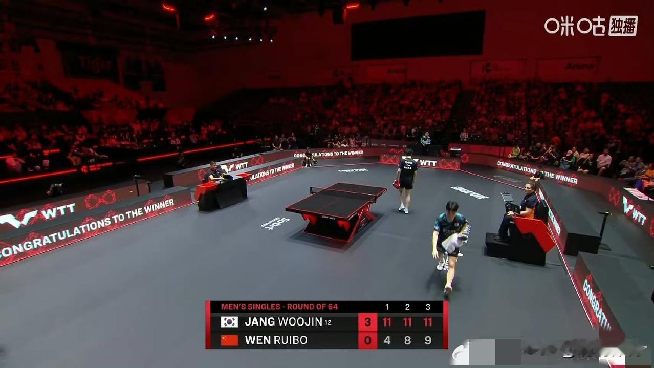 WTT新加坡大满贯男单首轮,温瑞博对阵韩国选手张禹珍,0-3落败出局,三局比分:4-11、8-11、9-11。全场比赛节奏被对手掌控,温瑞博失误偏多,关键分处理不稳,第三局虽有追分,但仍未能翻盘,成为本次赛事国乒首位出局选手。 这场球实力差距确实明显。张禹珍经验老道、节奏与衔接更成熟,而温瑞博大赛心态偏紧、无谓失误多,前三板与相持环节都处于下风。年轻选手打高强度外战交学费很正常,看清短板、回去打磨细节,未来才有更大提升。