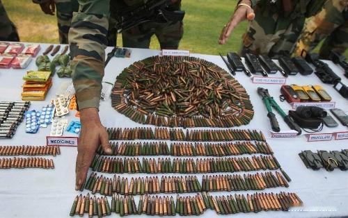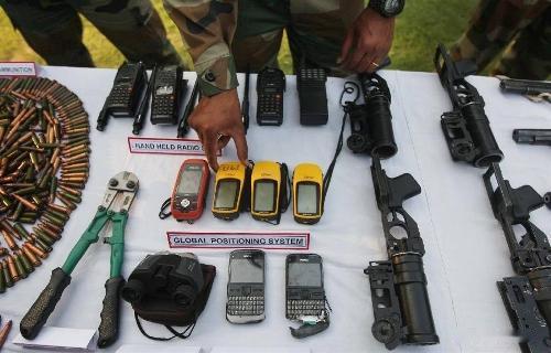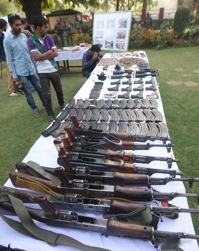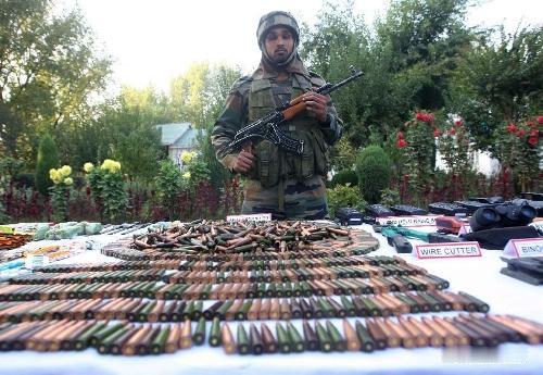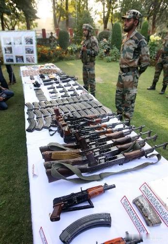 印度士兵在印控克什米尔首府斯利那加展示收缴的武器和弹药。印度军方表示,在克什米尔分为印度和巴基斯坦控制部分的克什米尔控制线 (LoC) 克兰地区正在进行的枪战中,收缴了大量武器和弹药 图中印度士兵拿着罗马尼亚产突击步枪