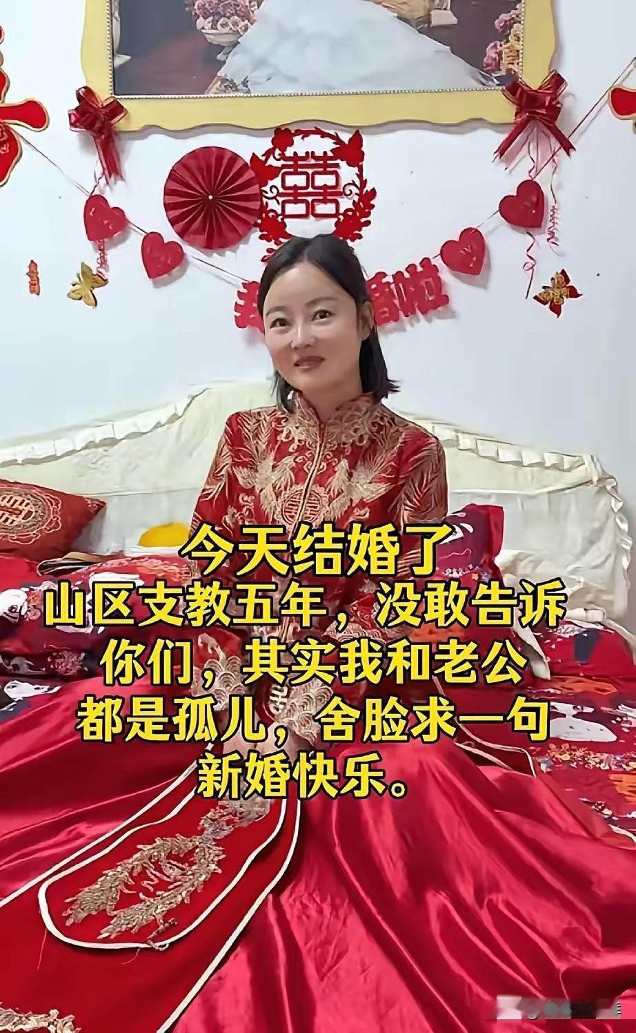 刚刷到这条帖子,我直接破防了。 一对新人,他们在山区支教5年,直到结婚当天,才敢轻轻说出一句:其实我们俩,都是孤儿。 没有父母,没有亲人张罗, 没有盛大婚礼,没有满堂宾客, 连一句来自家人的祝福,都成了奢望。 他们叫小敏和阿军,都是在贵州福利院长大的孩子。 小敏半岁时被遗弃在医院门口,阿军的父母在矿难中走了,那年他才9岁。 两个从小没尝过家是什么滋味的人,却偏偏把自己活成了大山里的光。 五年前,他们从毕节师范毕业,放弃了县城的教师编制。 背着铺盖卷,坐了四个小时的大巴,又走了两个小时的山路,扎进了威宁的一个贫困村小。 那里的孩子,大多是留守儿童,有的连爸妈长什么样都记不清。 小敏教语文,阿军教数学。 他们把每个月三千多的工资,大半都花在了给孩子买作业本和保暖内衣上。 冬天,他们把自己的厚被子拆了,给住校的孩子做棉鞋。 夏天,他们顶着38度的高温,走十几里山路,去劝辍学的女孩回学校。 有人在背后嚼舌根,说他们是“找不到工作才去山里混日子”。 也有人说他们“装高尚,想靠支教考编加分”。 他们从来没辩解过,只是每天天不亮就起来烧火做饭,给孩子们煮上一锅热粥。 直到去年冬天,阿军在护送孩子放学的路上,踩滑摔断了腿。 小敏每天背着他去上课,一步一步,踩在结冰的山路上。 那天,阿军趴在她背上,突然说:“我们结婚吧,以后我背你。” 小敏没说话,眼泪砸在了结冰的山路上。 他们没告诉任何人,悄悄在乡民政所领了证。 直到今天,他们在自己那间漏风的宿舍里,贴了两张喜字,挂了一串拉花。 小敏穿着一身从网上淘来的二手秀禾服,对着镜头,声音有点抖: “我们都是孤儿,从小就没有家。 但在这里,在这些孩子身边,我们找到了家的感觉。 今天,我们结婚了,想求大家一句新婚快乐。” 视频下面的评论,瞬间炸了。 有人说:“你们不是孤儿,你们是孩子们的爹妈,是大山的脊梁。” 有人说:“这才是爱情,两个没家的人,却给了无数孩子一个家。” 也有人直接打赏,说“这点钱,给你们买件新婚纱”。 当地教育局的领导看到了视频,当天就开车进山。 他们说,要给这对新人补办一场婚礼,邀请全校的孩子和全村的老乡来参加。 网友们也寄来了包裹,有新婚纱、新被褥,还有满满一箱子的喜糖。 小敏和阿军说,他们从来没想过要出名,也没想过要得到什么。 他们只是想做自己觉得对的事,想给那些和他们一样的孩子,多一点光。 现在,他们不仅有了彼此,还有了无数陌生人的祝福。 这个世界,有时候很凉薄,总有人用恶意去揣测别人的善意。 但更多的时候,它又很温暖。 那些素不相识的人,会用最纯粹的善意,去拥抱那些被生活遗忘的人。 他们没等来父母的祝福,却成了更多人的父母。 他们没拥有过盛大的童年,却给了孩子们一个充满希望的未来。 这才是最动人的婚礼,最纯粹的爱情。 各位读者,你们愿意给这对新人一句真心的祝福吗?欢迎在评论区留下你的话。