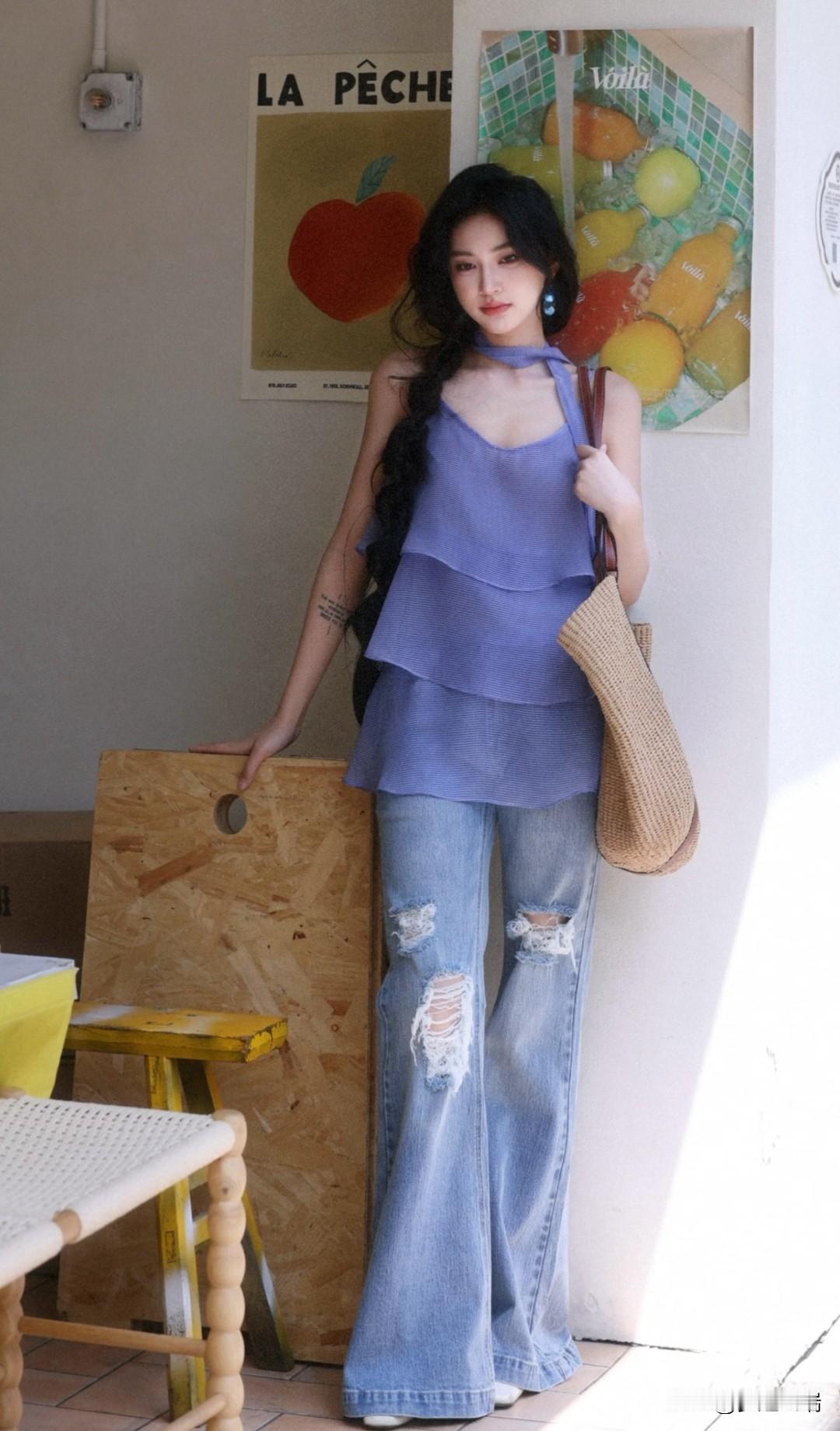 紫色吊带裙搭配破洞牛仔裤,轻松自在,夏日必备!