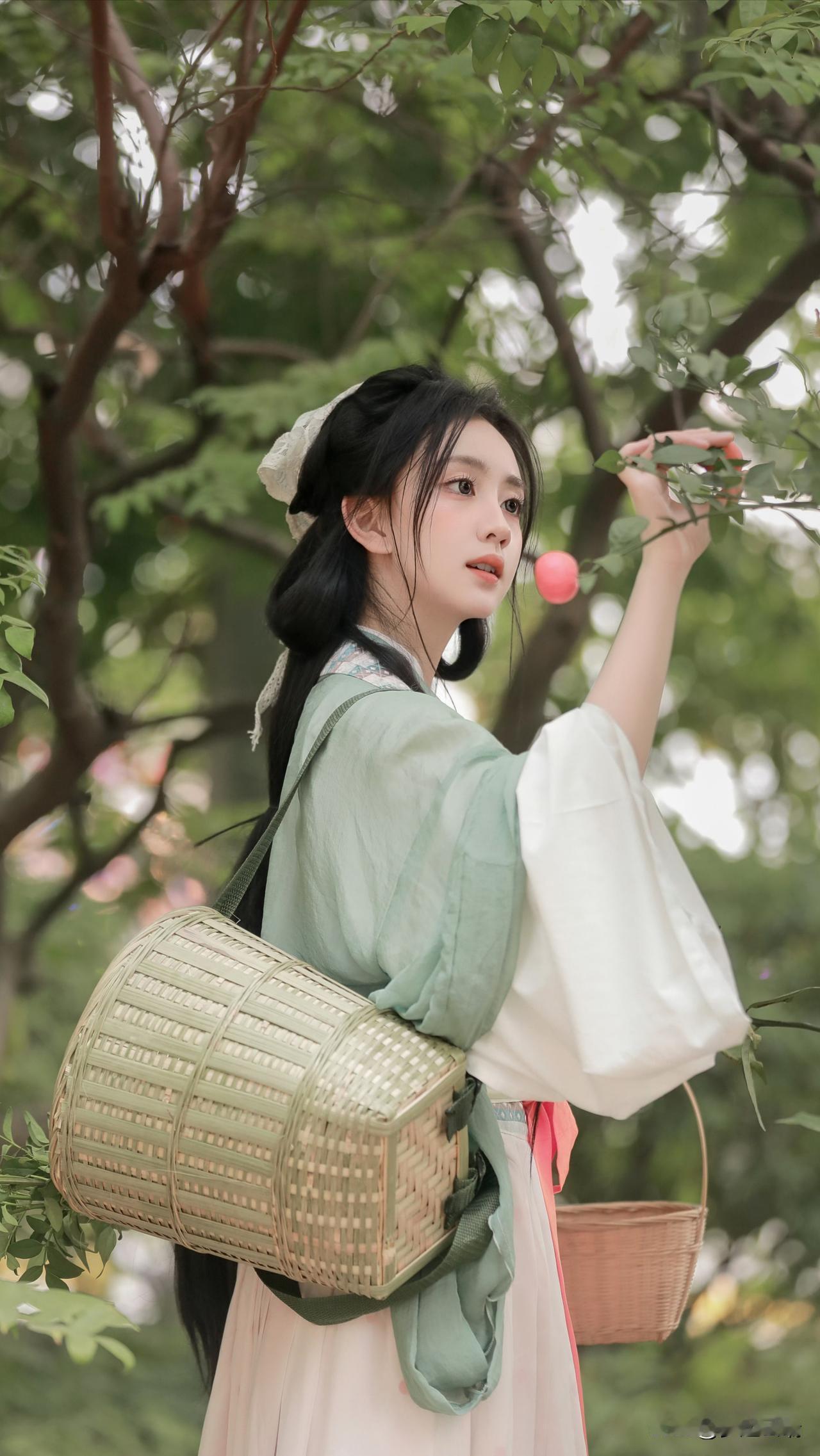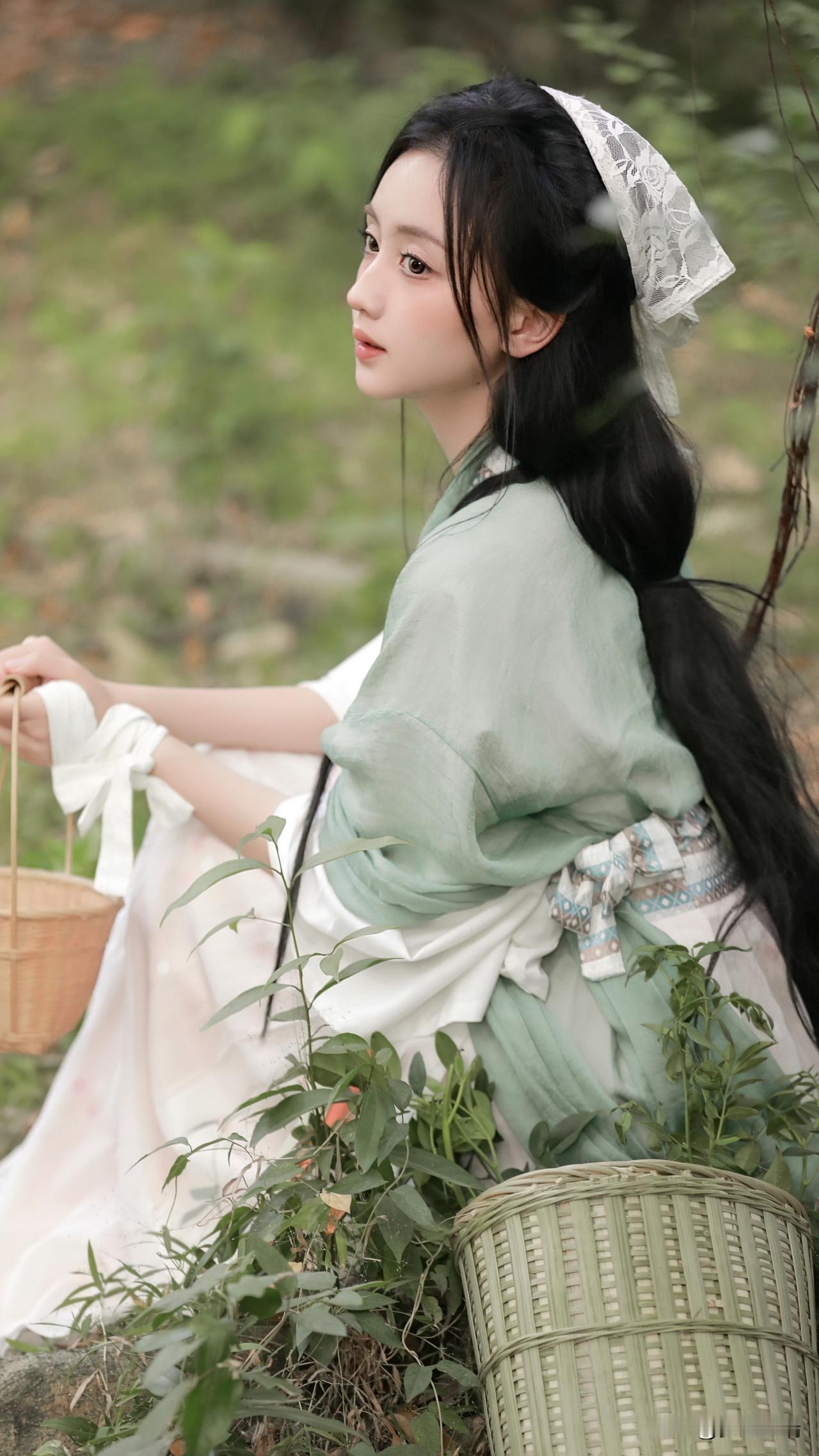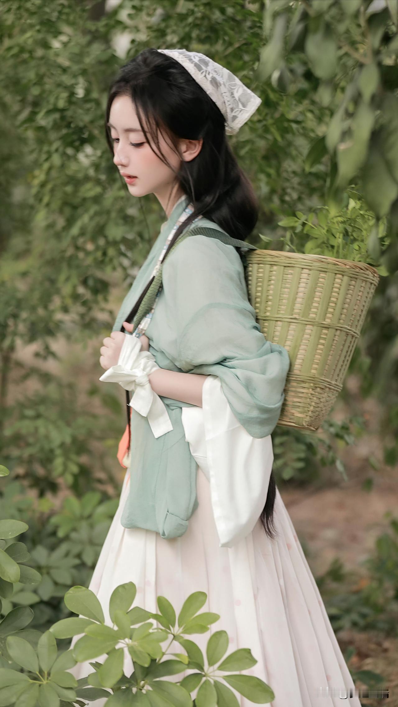绿衣少女在花丛中,手拿白帕,清新自然,宛如古代仕女图。
